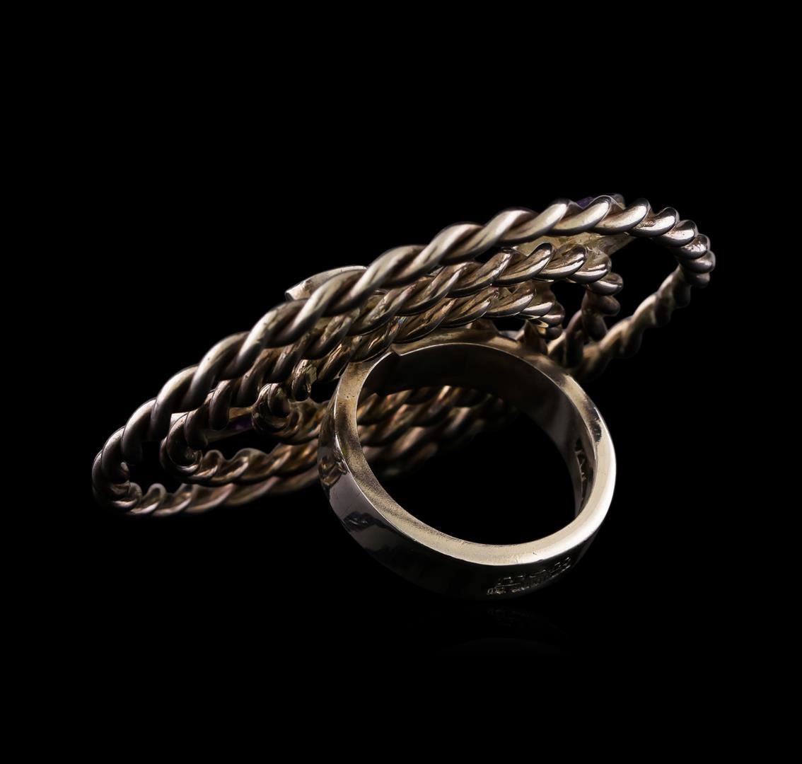 One of a kind high fashion sterling silver Ring weighing 22.9 grams. Containing: Purple Crystal, Yellowish Green Crystal. This sterling silver promises a lasting shine.