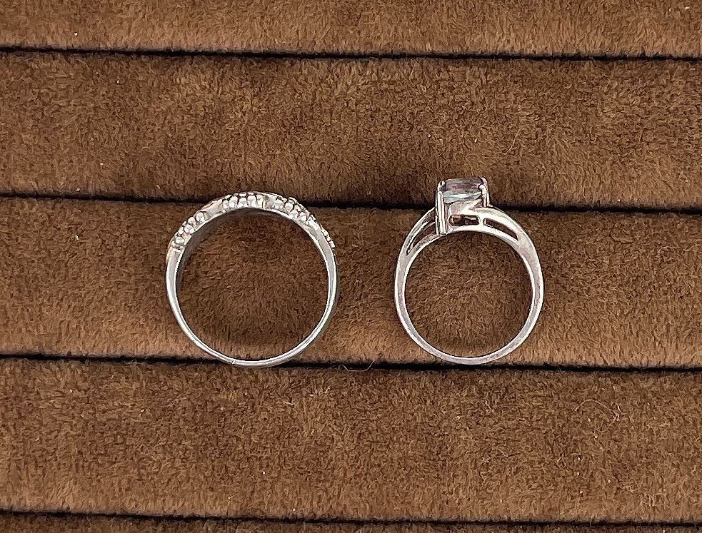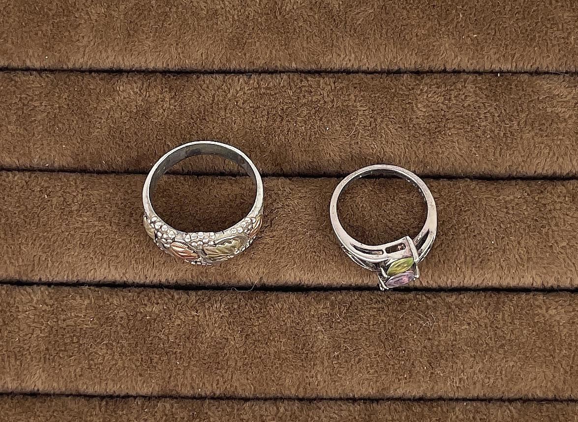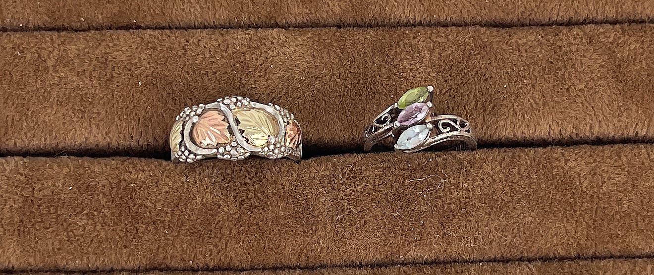 Nice grouping. One has Topaz, Peridot, and Amethyst. The other is Black Hills Gold on Sterling.