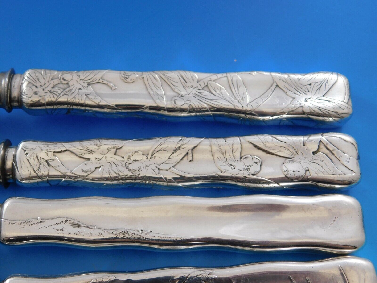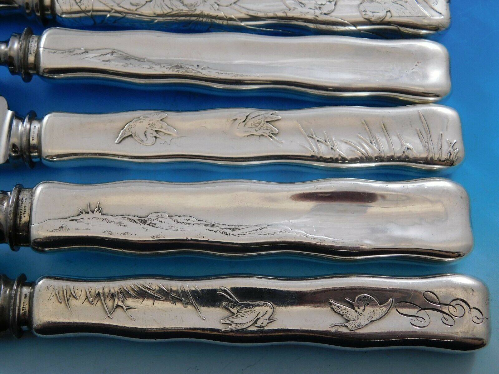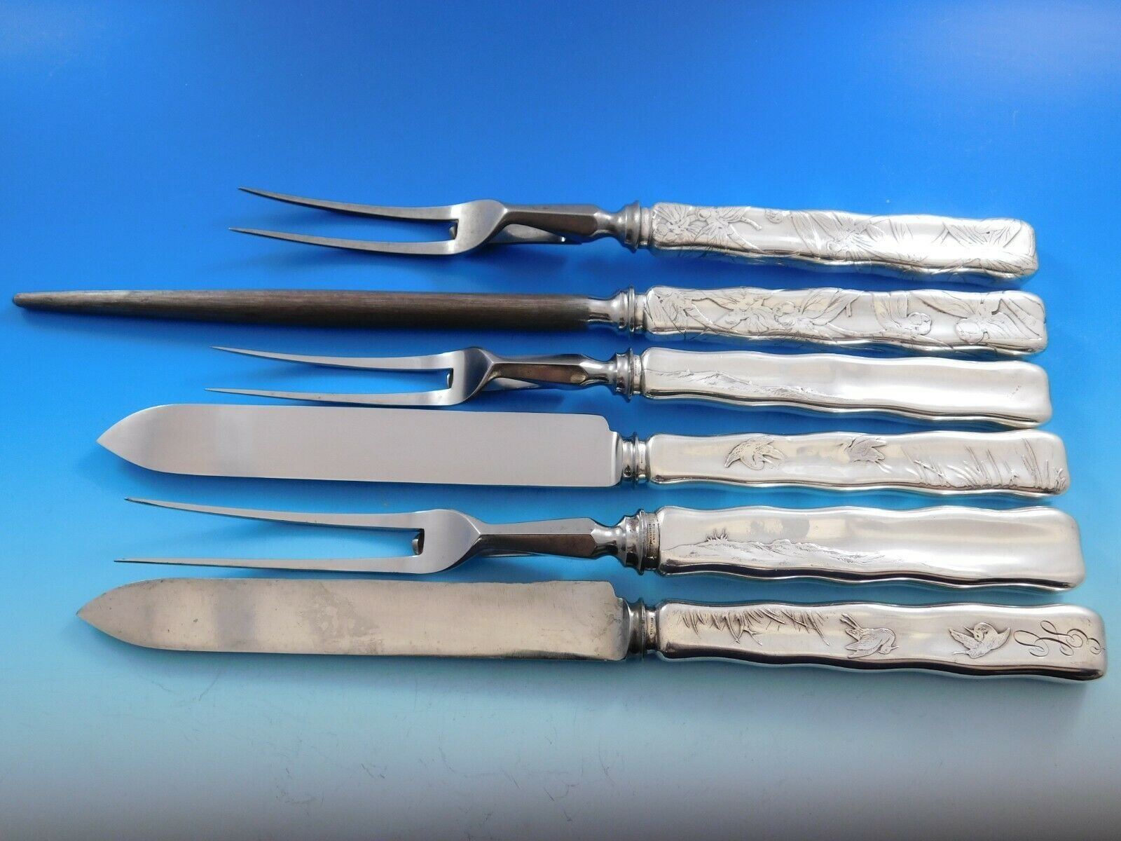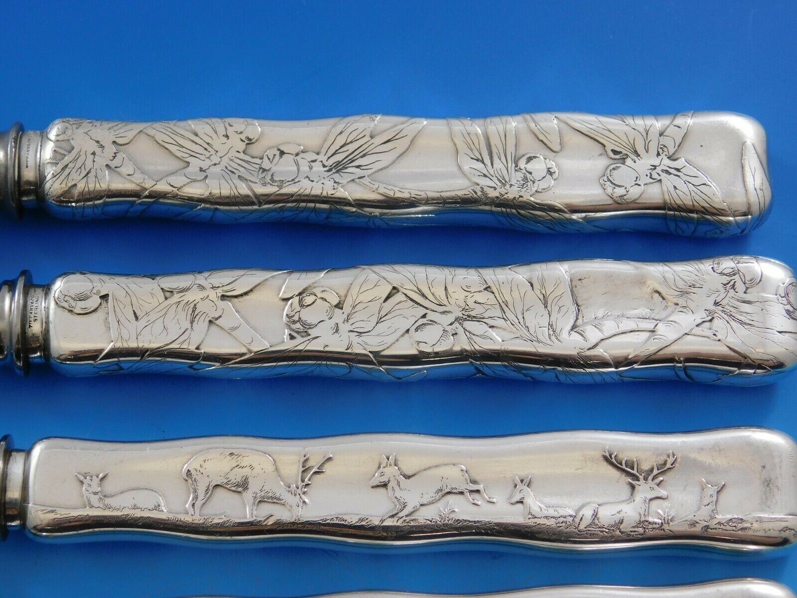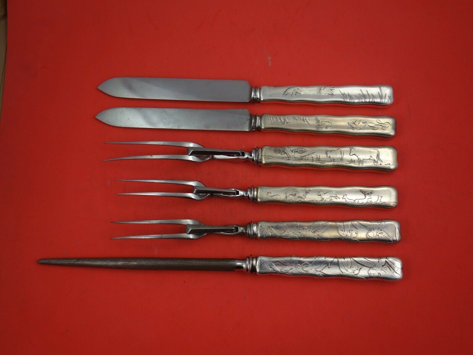Sterling silver 6-piece Roast Carving Set with boars, birds, stag and hound. This set includes: