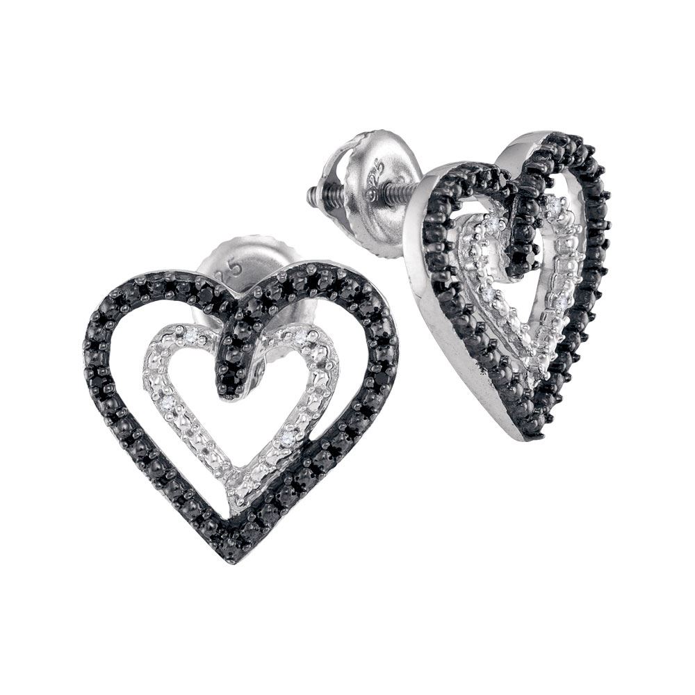 Sterling Silver Womens Round Black Color Enhanced Diamond Double Heart Stud Earrings 1/20 Cttw