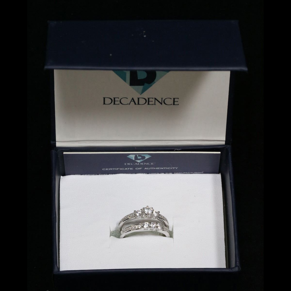 Sterling Silver Round Cut 3 Stone Pave Duo Weding Band Set Size 7 . .. Decadence Sterling Silver Round Cut 3 Stone Pave Duo Wedding Band Set With COA.