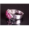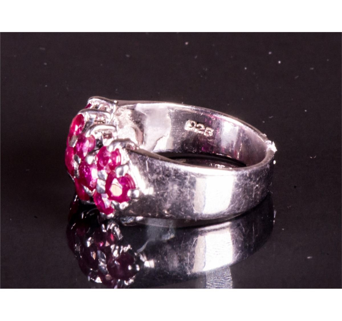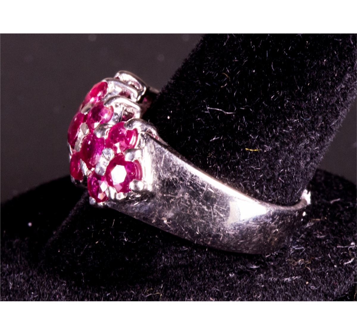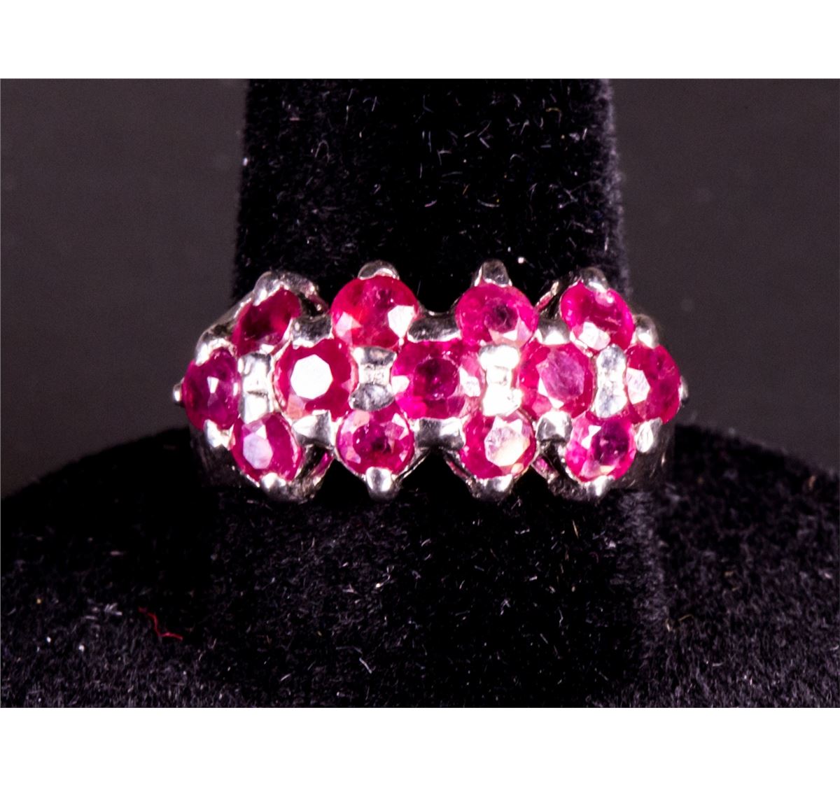 One ladies three row ruby ring; stamped sterling silver; with thirteen round and oval natural rubies (0.7 ct); retail replacement value $650; 4.7 grams