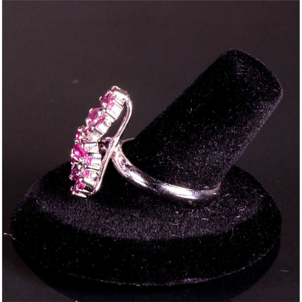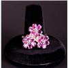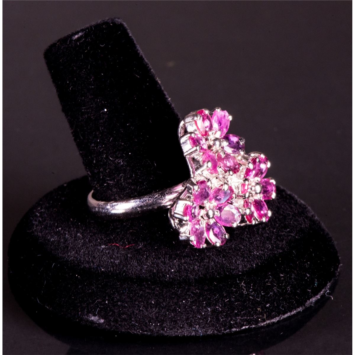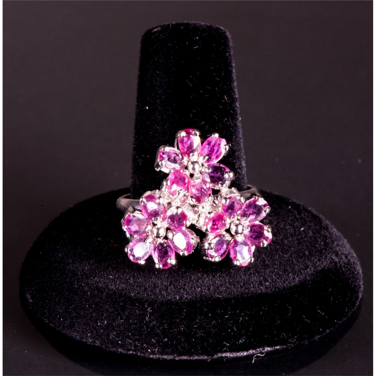 One ladies custom made large floral style ruby ring; stamped sterling silver; with eighteen oval natural rubies (1.8ct); retail replacement value $600; 6.2 grams