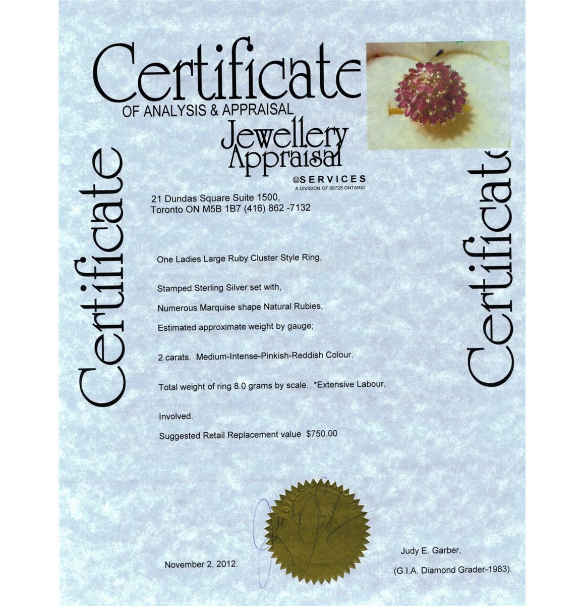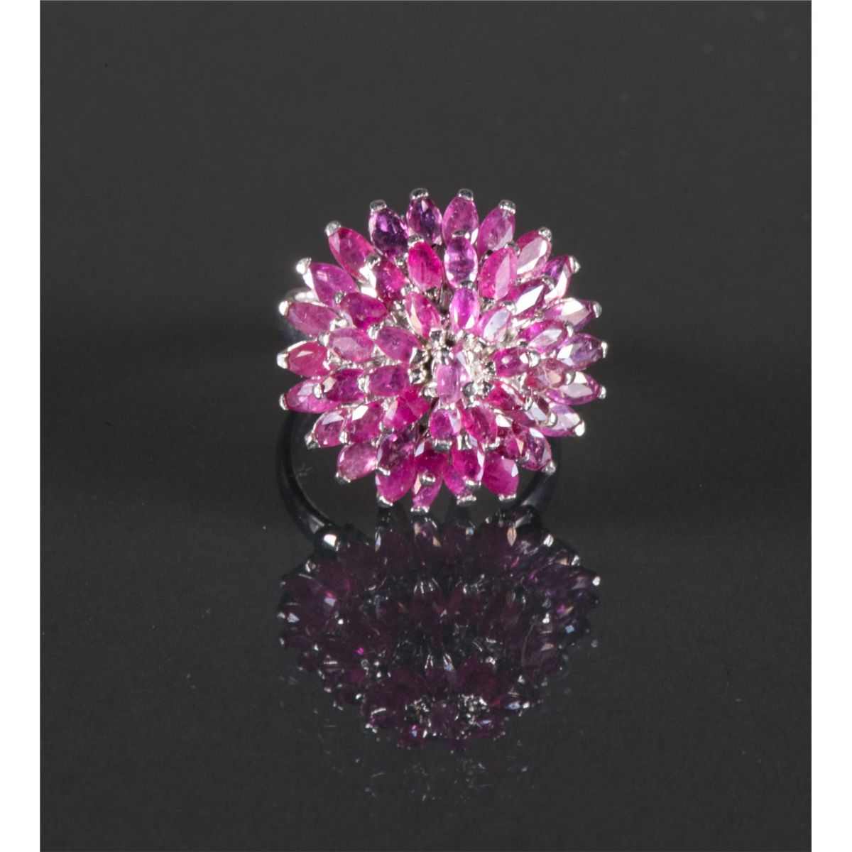One ladies large ruby cluster style ring; Ring size: 7.25, Ruby: D: 21.82 mm, 8 grams, Certificate Replacement Value $750
