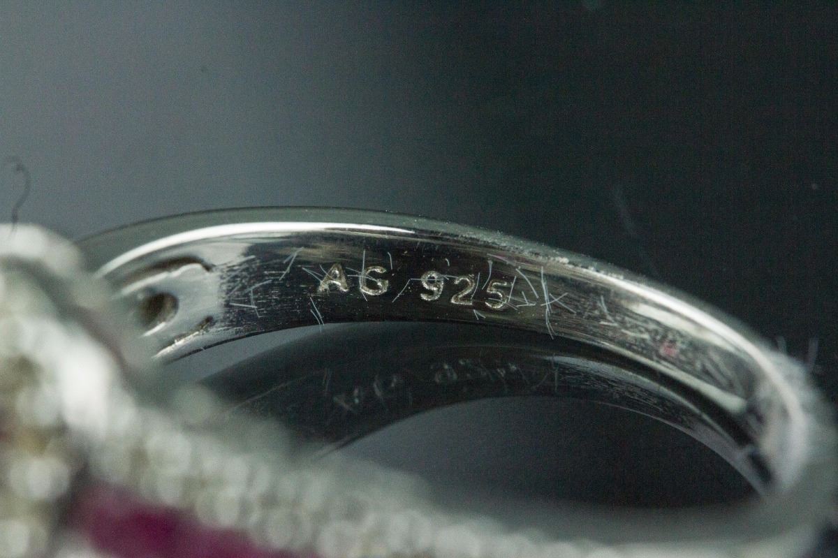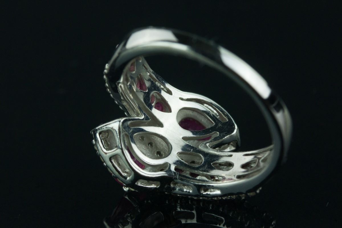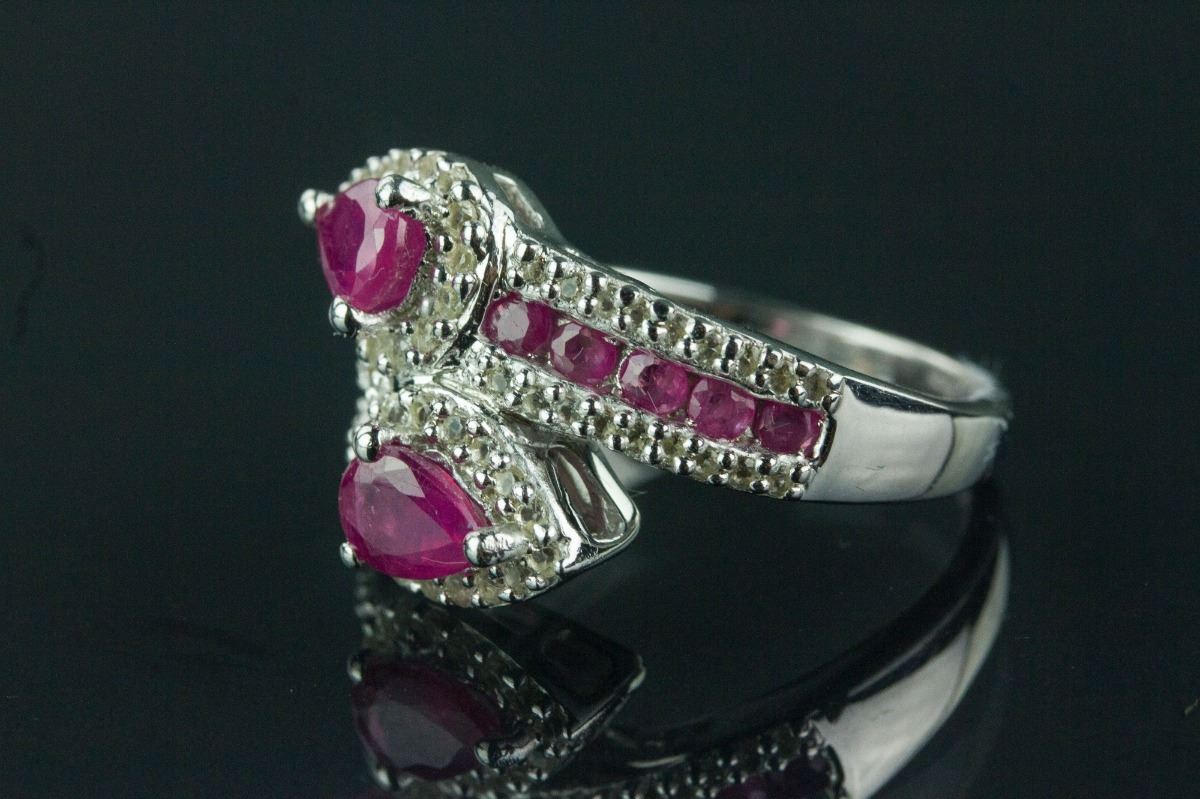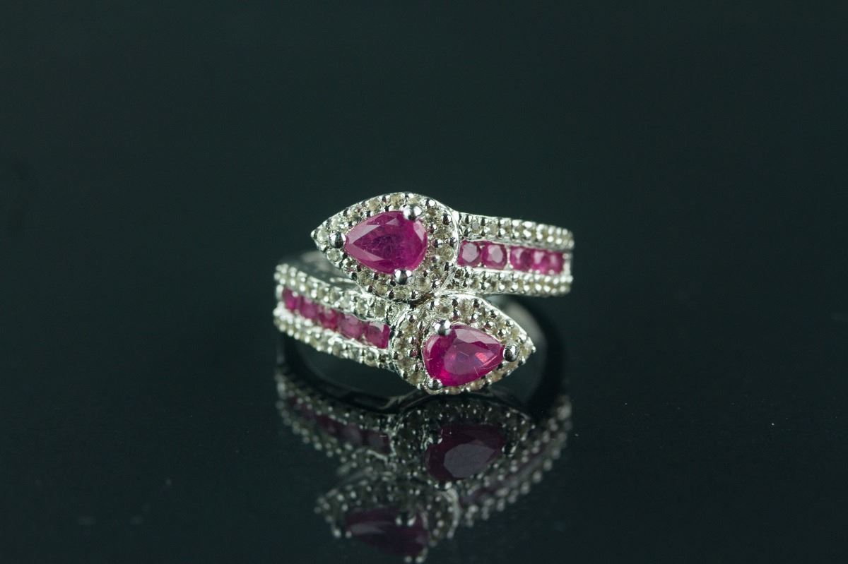 Stamped 925 silver gemstone ring; set with 3.00 ct red ruby of pear and round cut; certified replacement value USD$703; 6.96 grams