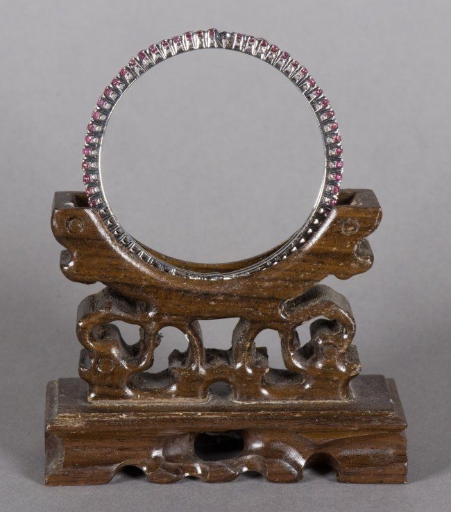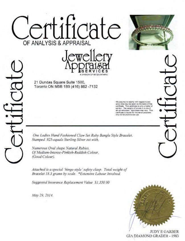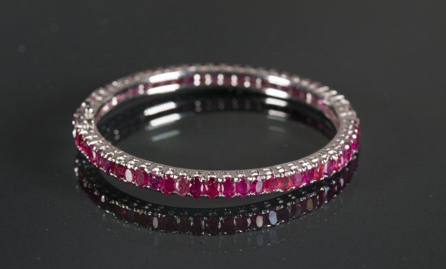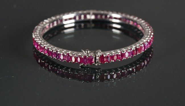 One ladies hand fashioned claw set ruby bangle style bracelet; stamped .925-equals sterling silver set with numerous oval shaped natural rubies of medium intense reddish colour; attached is a special 'hinge-style' safety clasp; suggested insurance replacement value: $1,350; accompanied with Certificate; D: 6.4 cm, 18.3 grams