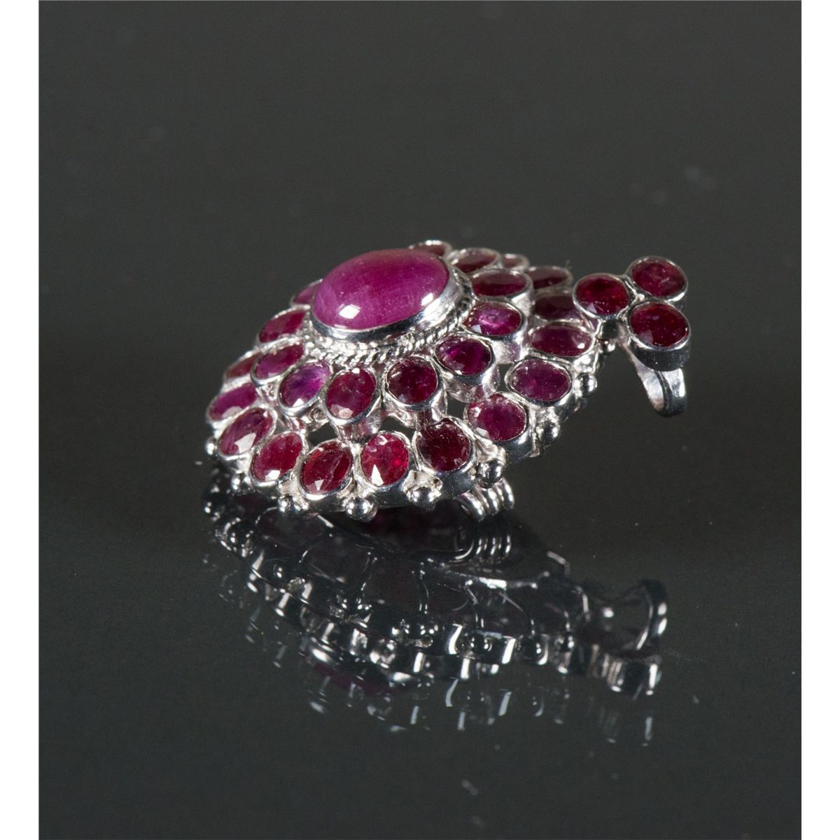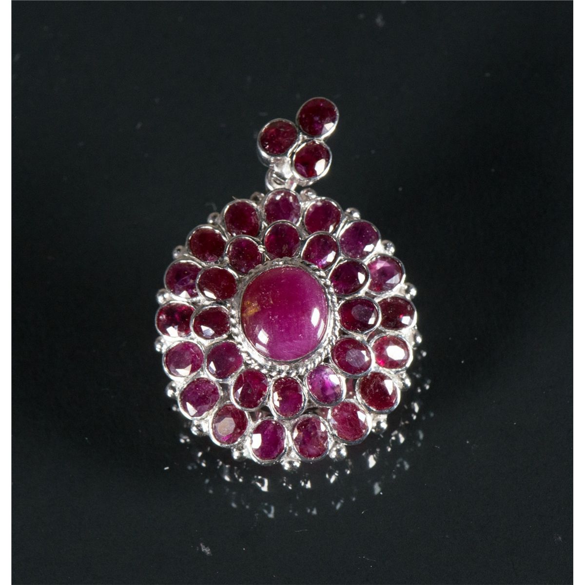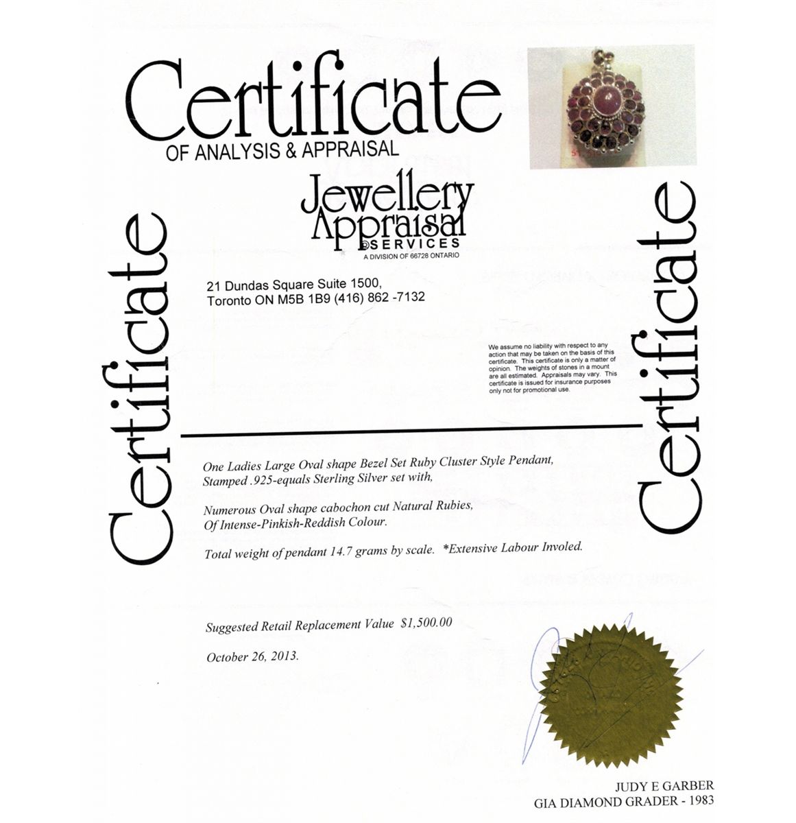 One ladies large oval shape bezel set ruby cluster style pendant; D: 33.21 mm, 14 grams, Certificate Replacement Value $1500
