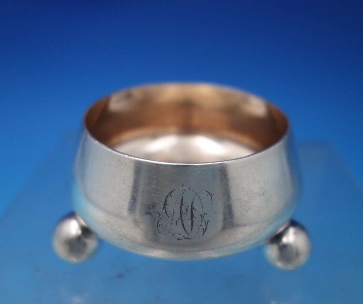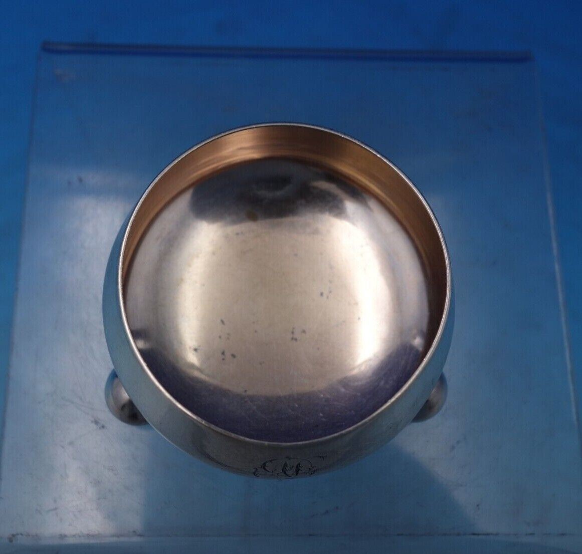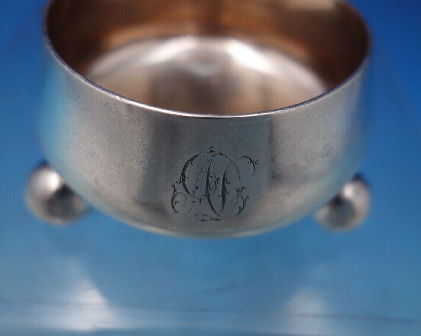 Outstanding Tiffany and Co sterling silver salt cellar master with gold washed interior (rose gold) and three ball feet. This piece measures 1 1/2" tall x 3" in diameter and weighs 2.05 troy ounces. It is monogrammed (see photos), and is in good vintage condition.