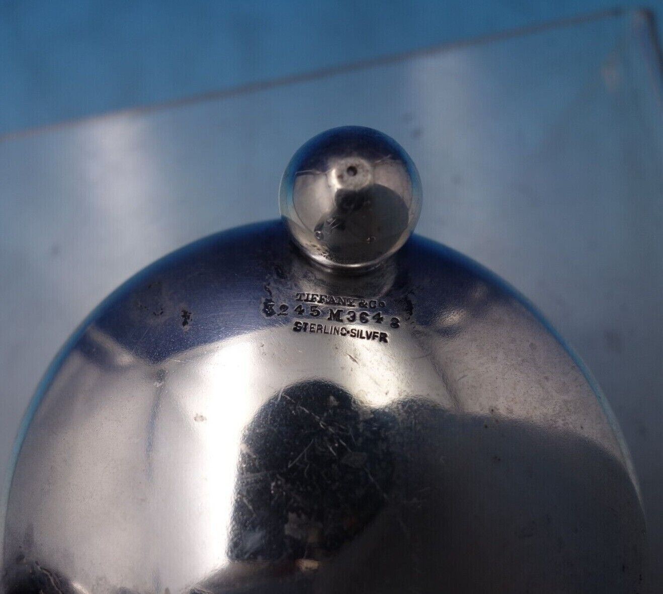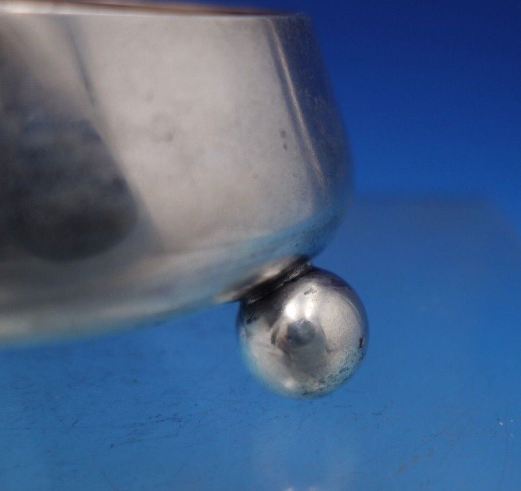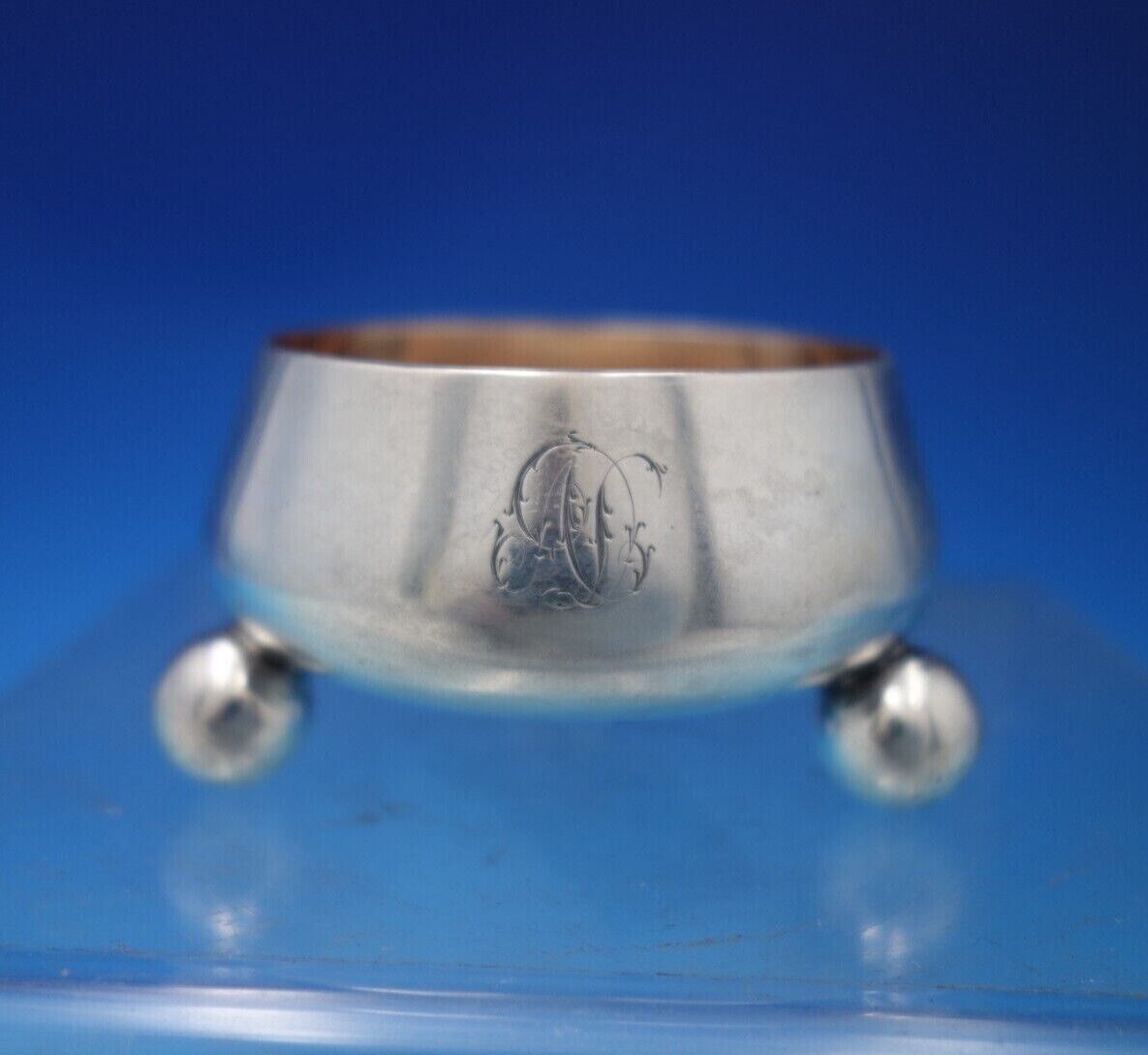 Outstanding Tiffany and Co sterling silver salt cellar master with gold washed interior (rose gold) and three ball feet. This piece measures 1 1/2" tall x 3" in diameter and weighs 2.05 troy ounces. It is monogrammed (see photos), and is in good vintage condition.