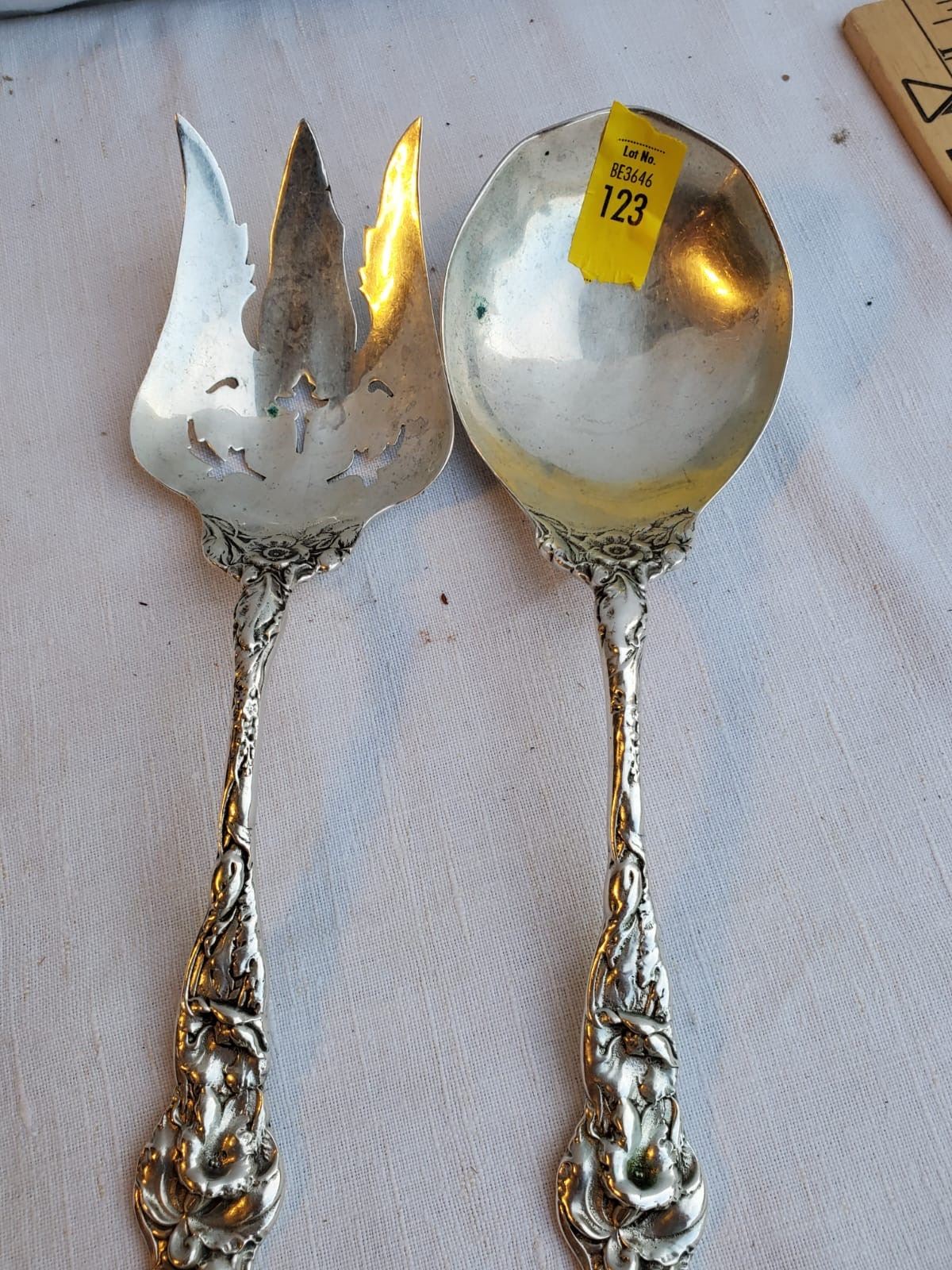 Sterling Silver serving spoon and serving fork. Measures approximately 9.5 Inches long