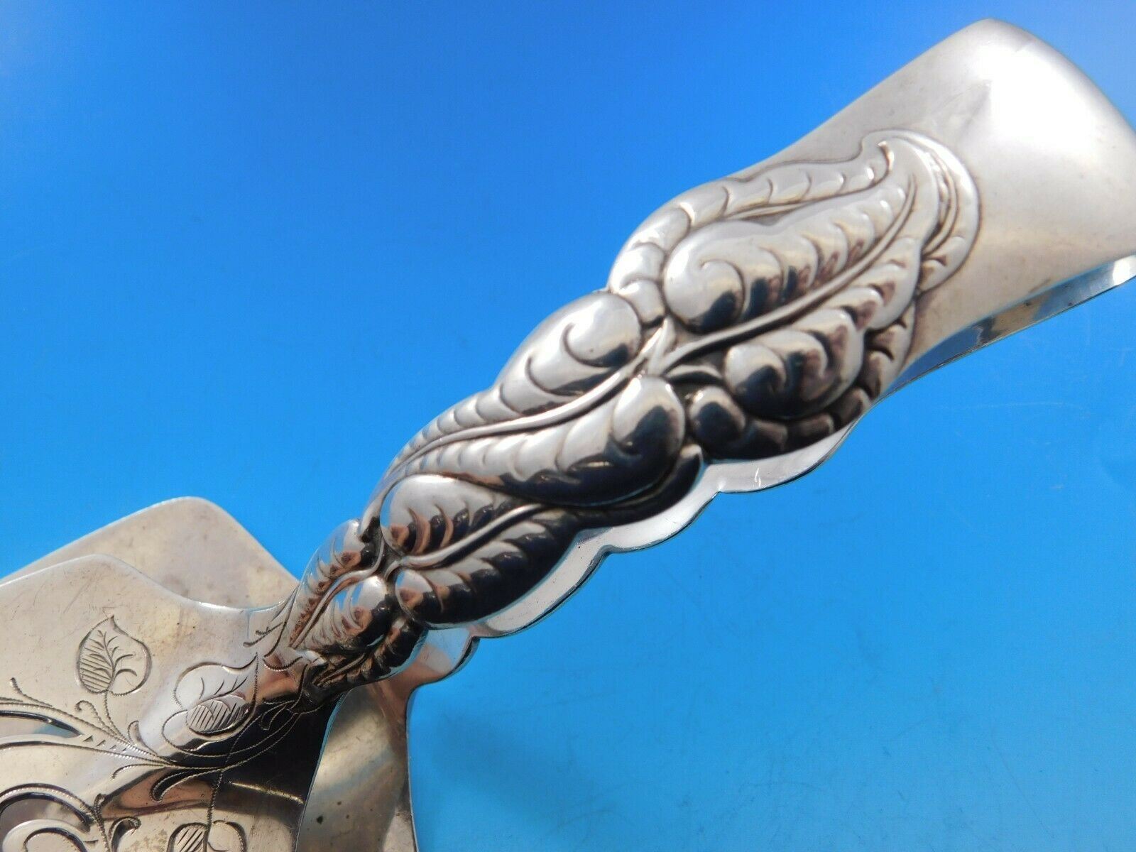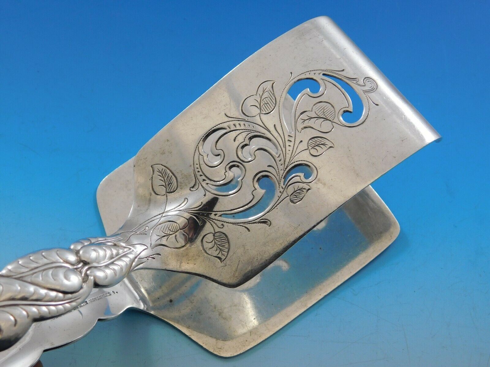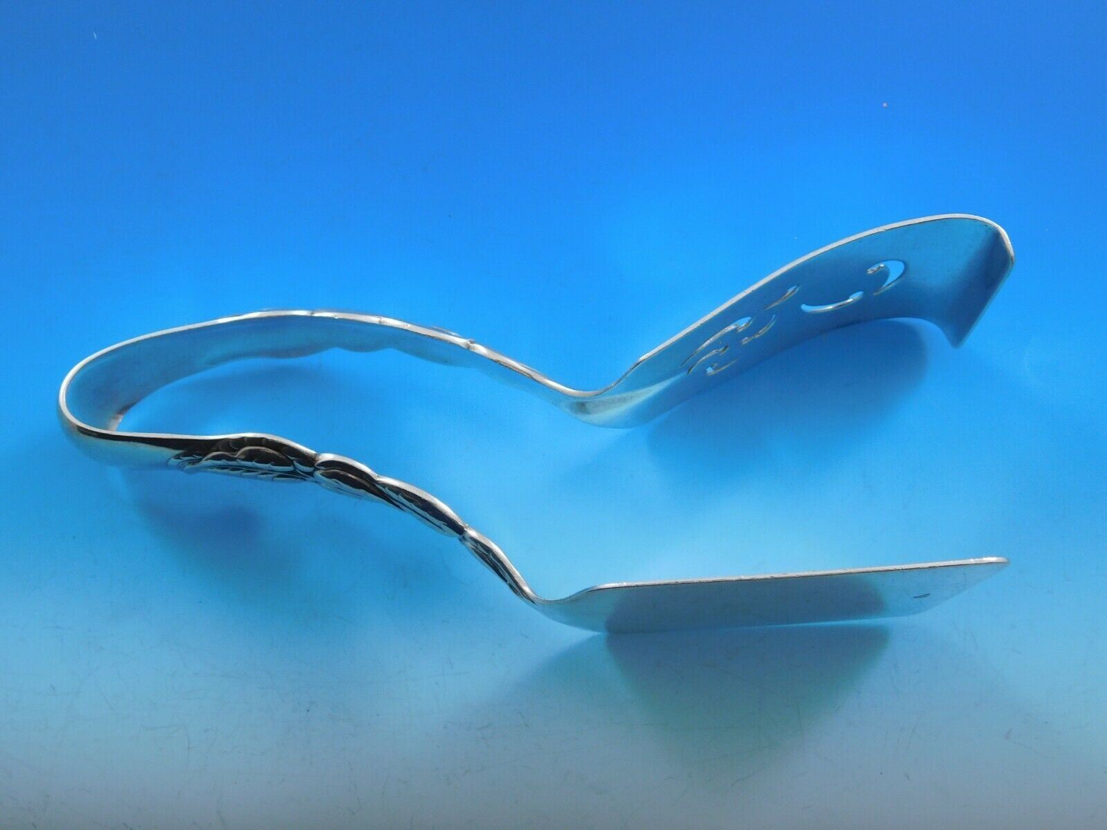 Sterling silver Asparagus Serving Tong pierced, bright-cut in the pattern Ailanthus By Tiffany & Co.. It is not monogrammed and is in excellent condition.