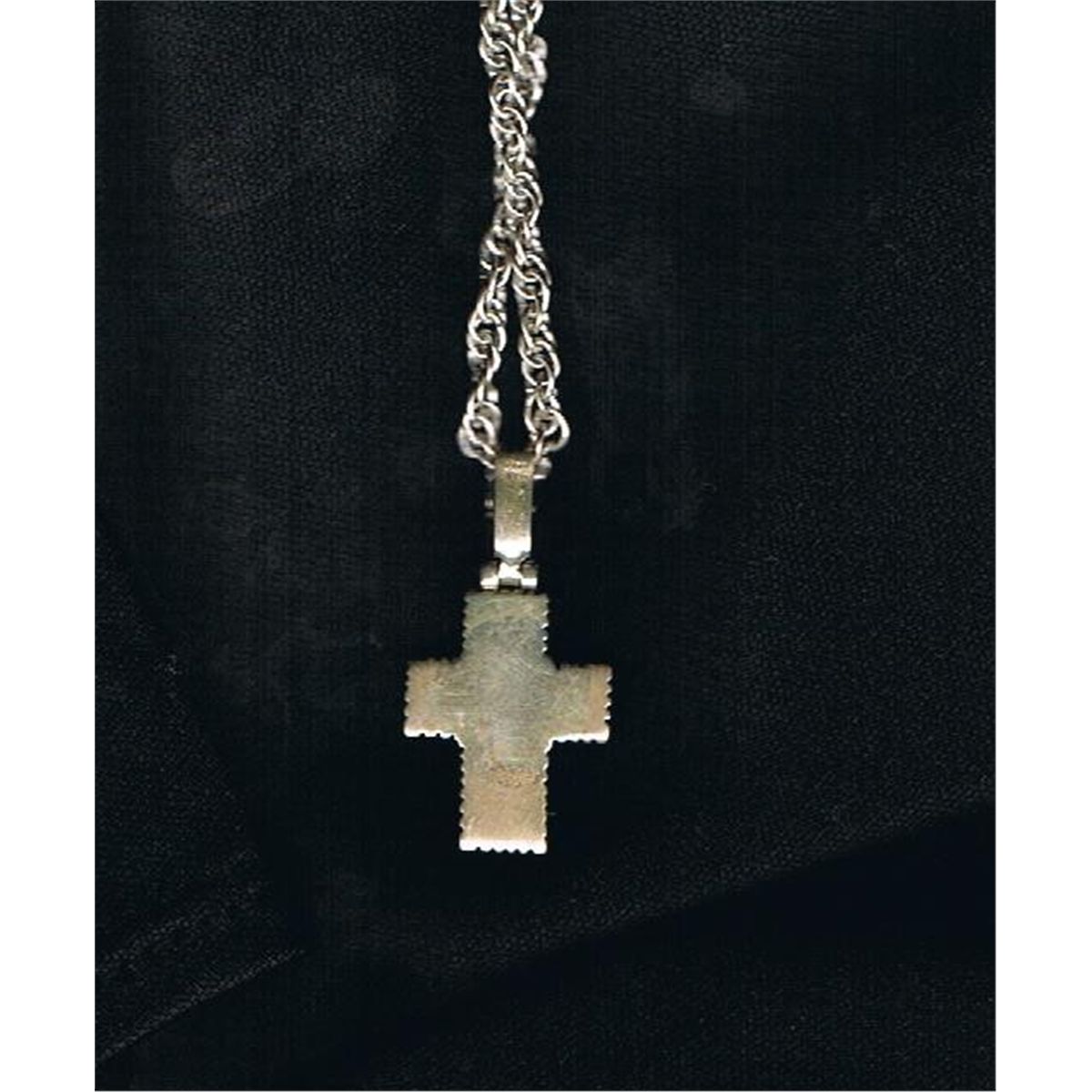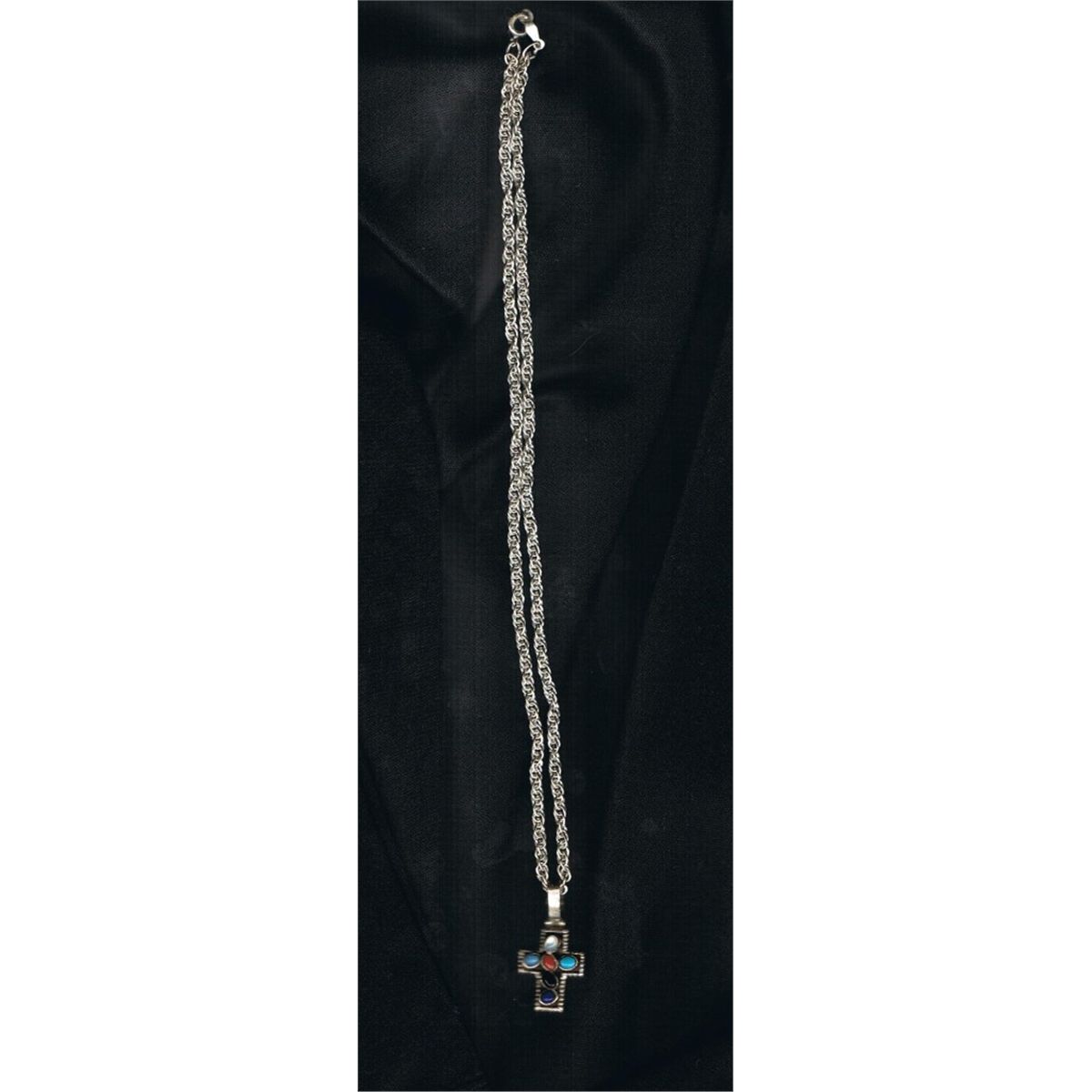 Cross is 3/4" x 1/2", with 6 stones which include turqouise and garnet and onyx and a pearl like stone.