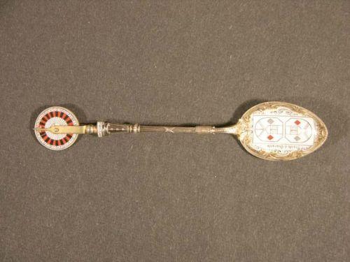 Sterling silver souvenir spoon, Monte Carlo, enameled handle with roulette wheel, wheel spins. Enameled bowl, Trent & Quarante. 5" Ex. cond.