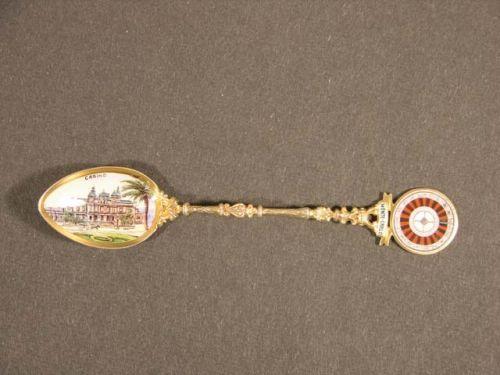 Sterling silver souvenir spoon, gold vermil, Monte Carlo, enameled handle with roulette wheel - enameled bowl depicting beautiful casino. 5" Ex. cond.