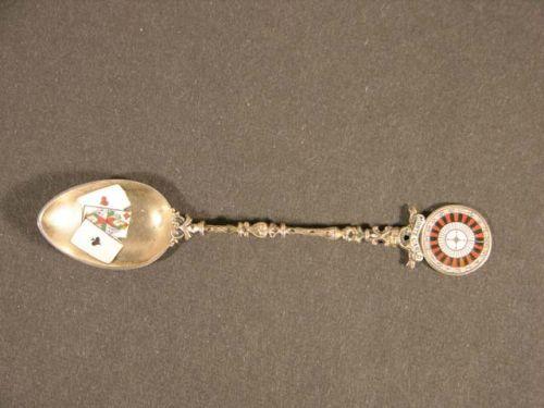 Sterling silver souvenir spoon, Monte Carlo, enameled handle with roulette wheel, gold vermeil. Playing card motif enameled bowl. 5" Ex. cond.