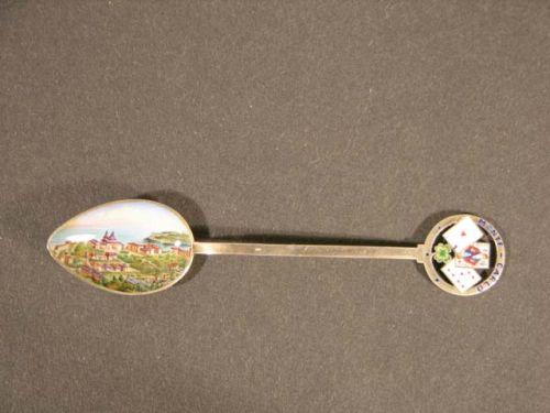 Sterling silver souvenir spoon, Monte Carlo, with enameled playing card handle. Scene of Monte Carlo landscape on bowl. 5" Ex. cond.