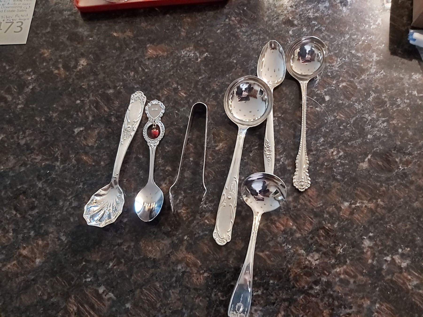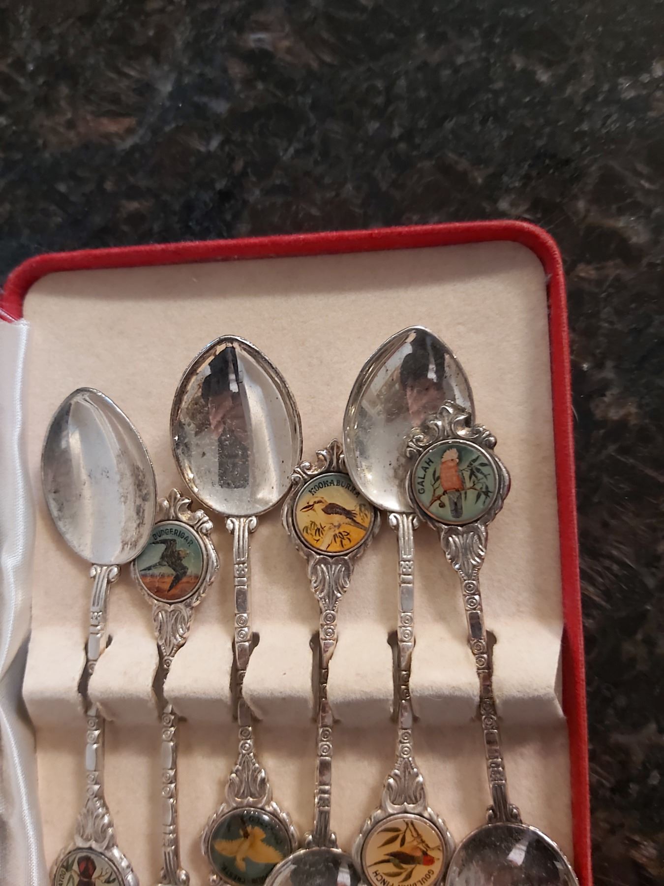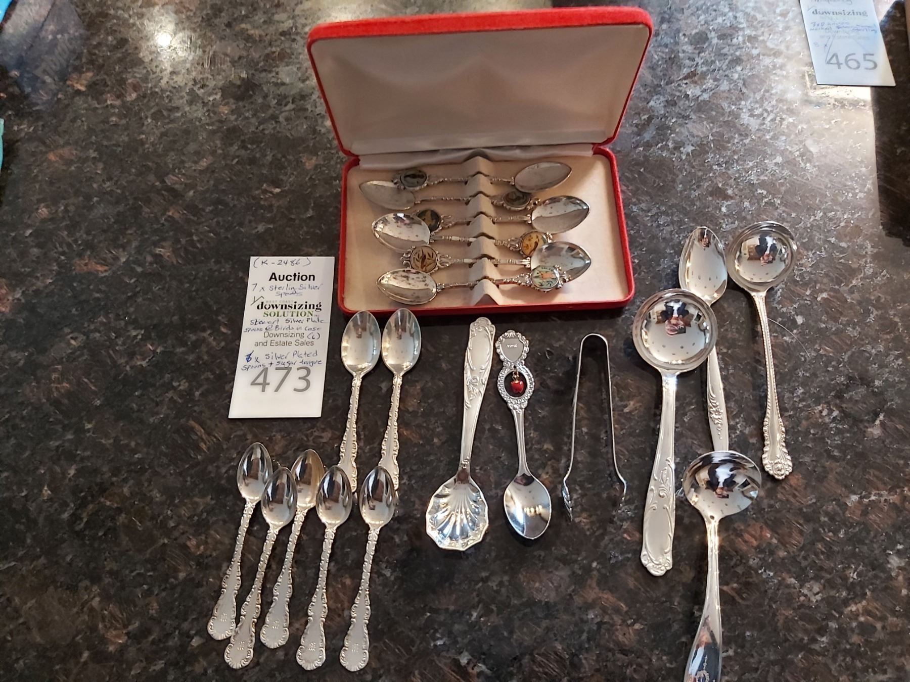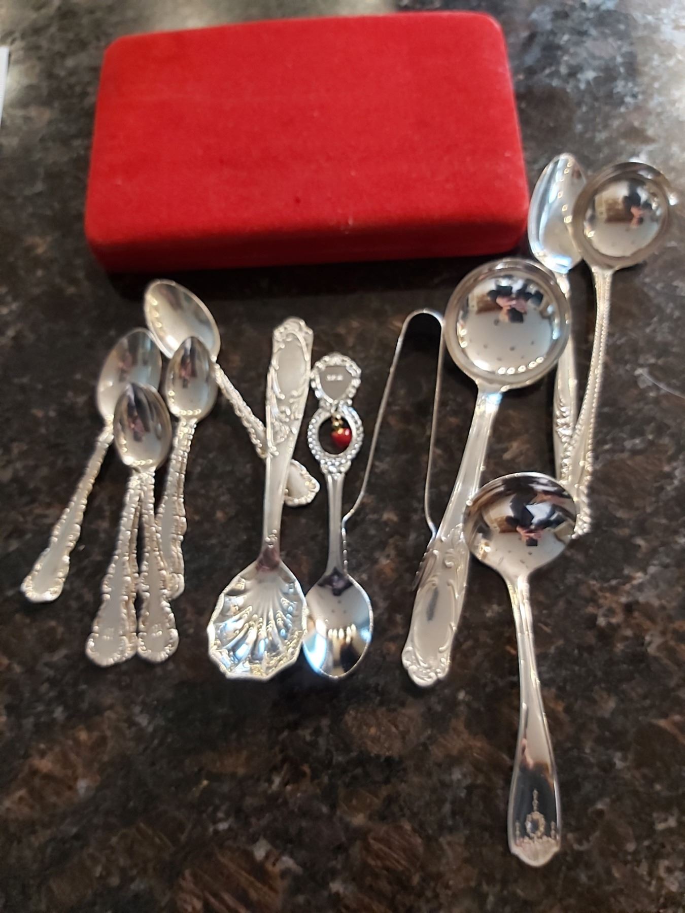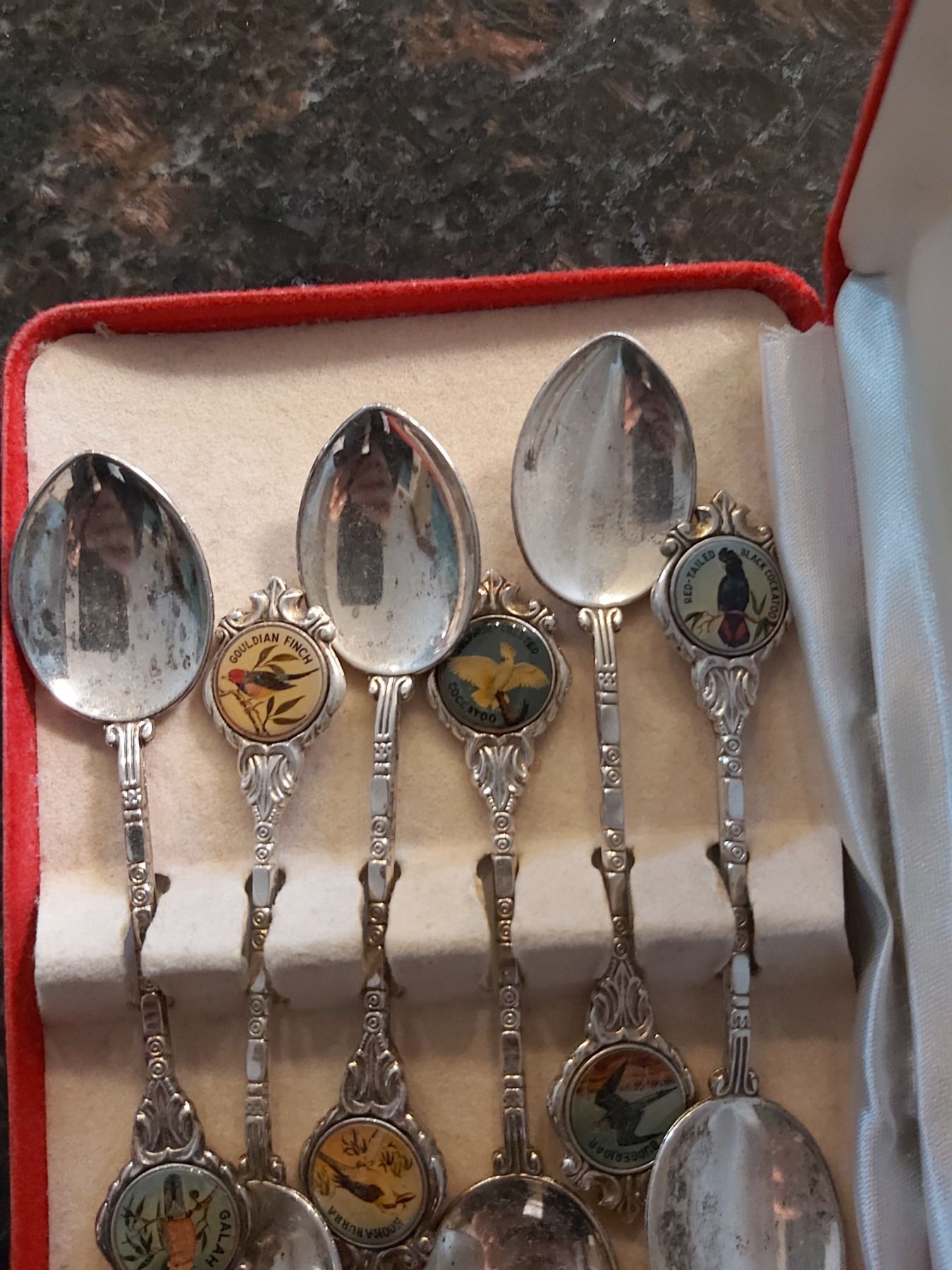 7 Sterling Silver Spoons, (5 mini spoons & 2 slightly larger). 6 x Stewart Silver Plated spoons with enamel birds in presentation case. 1 x Silver Plated sugar tongue and 6 silver plated spoons. Pickup at 9am