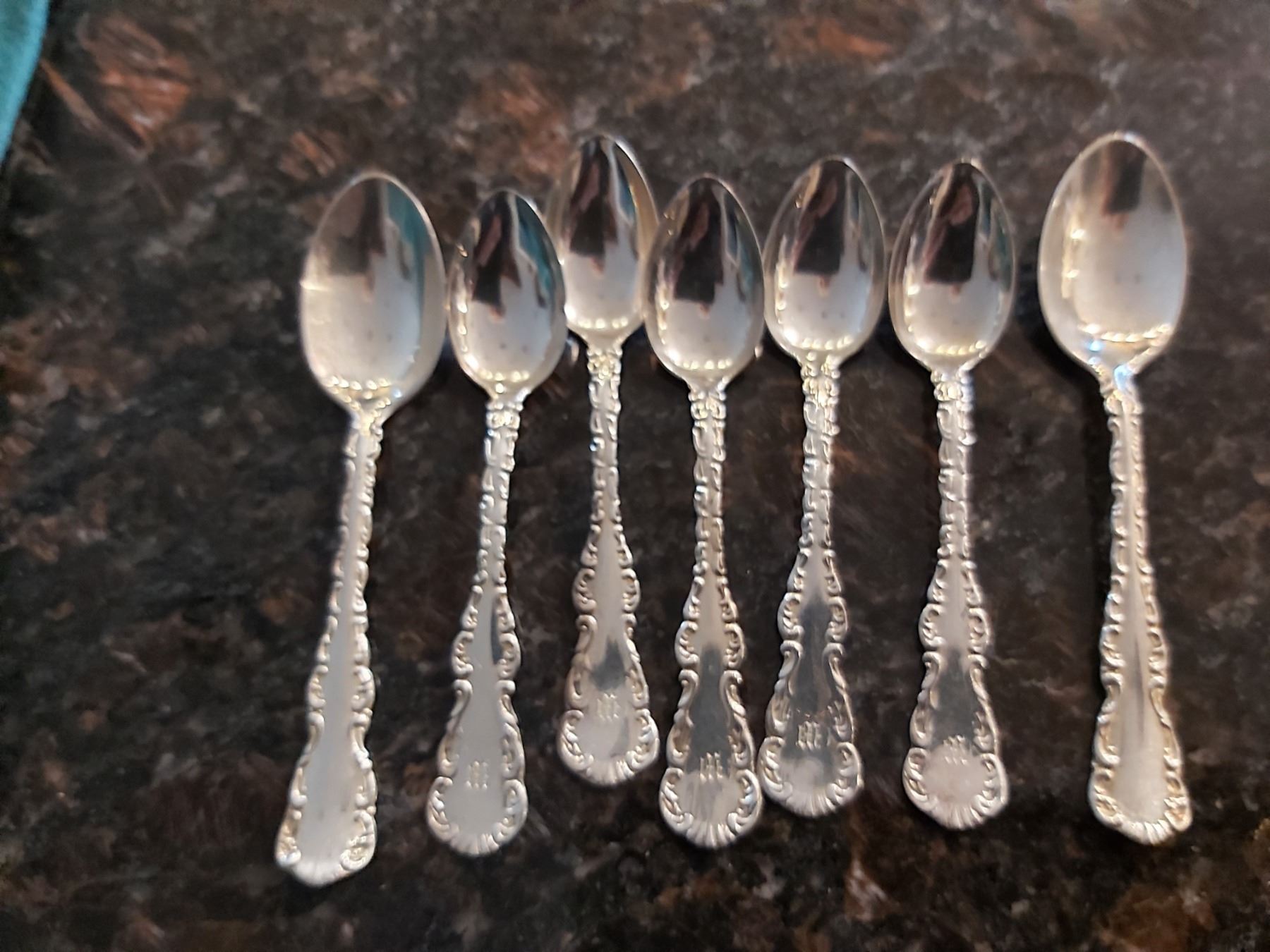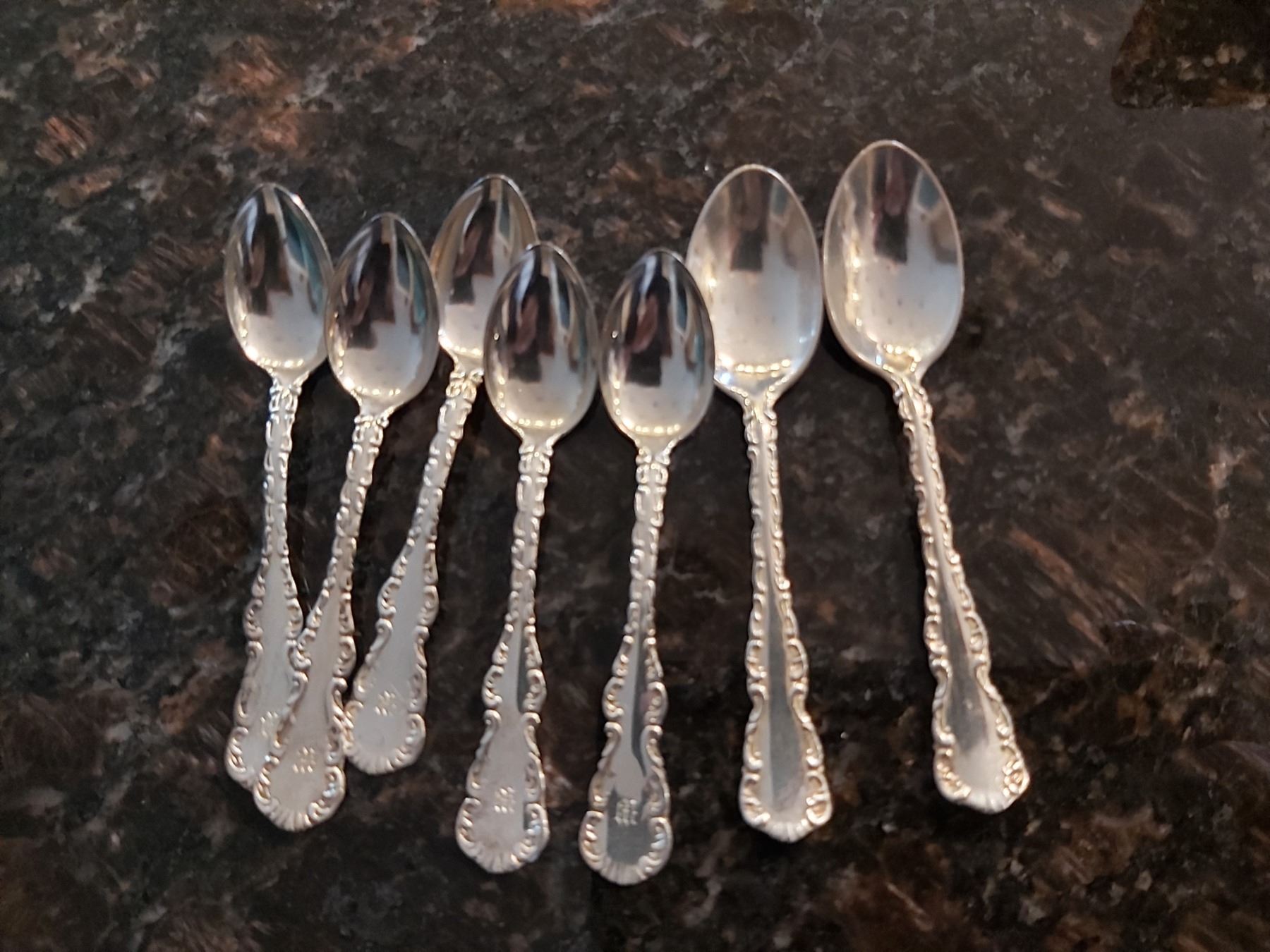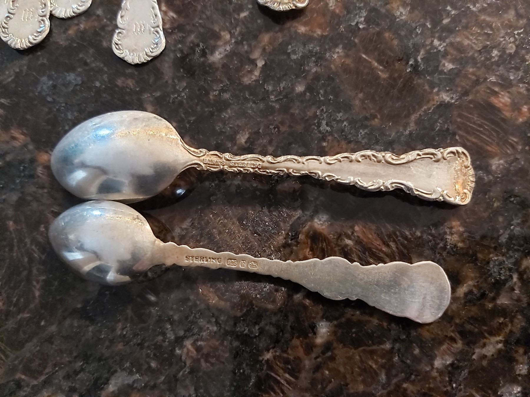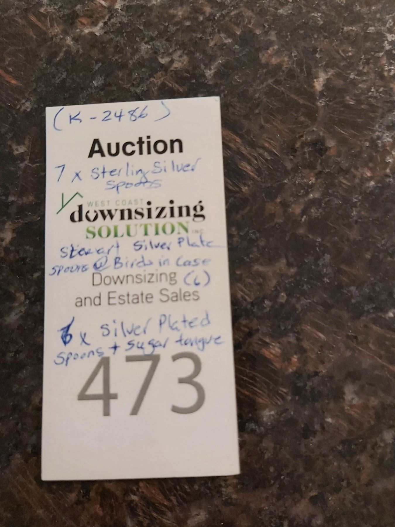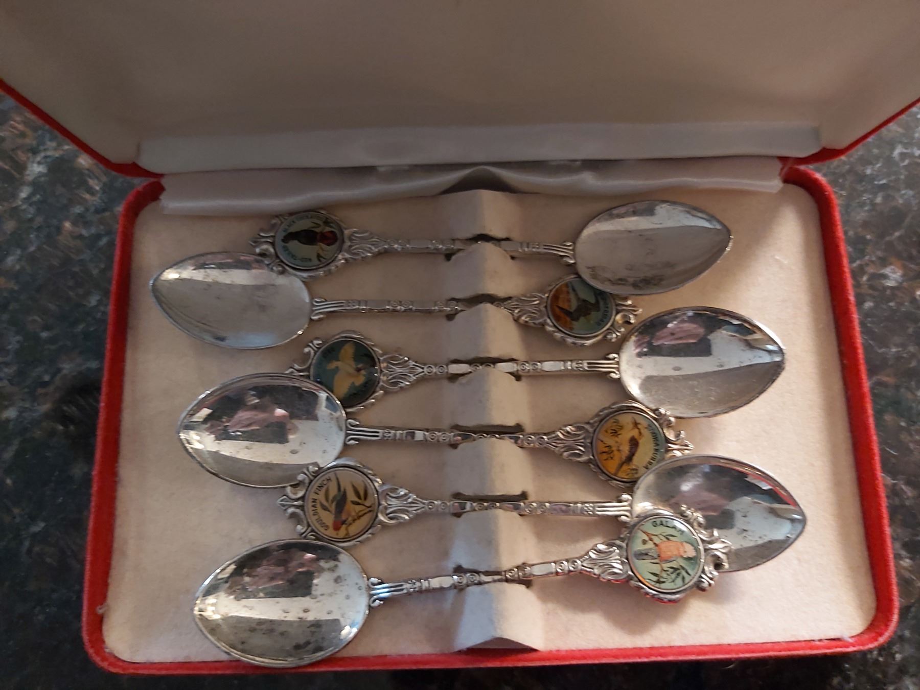 7 Sterling Silver Spoons, (5 mini spoons & 2 slightly larger). 6 x Stewart Silver Plated spoons with enamel birds in presentation case. 1 x Silver Plated sugar tongue and 6 silver plated spoons. Pickup at 9am