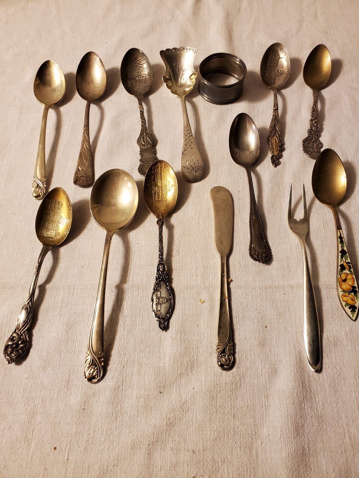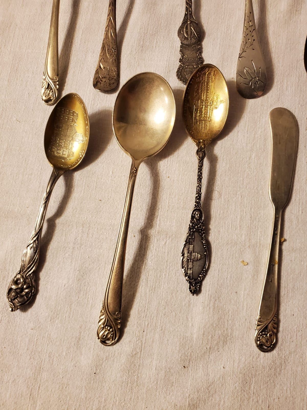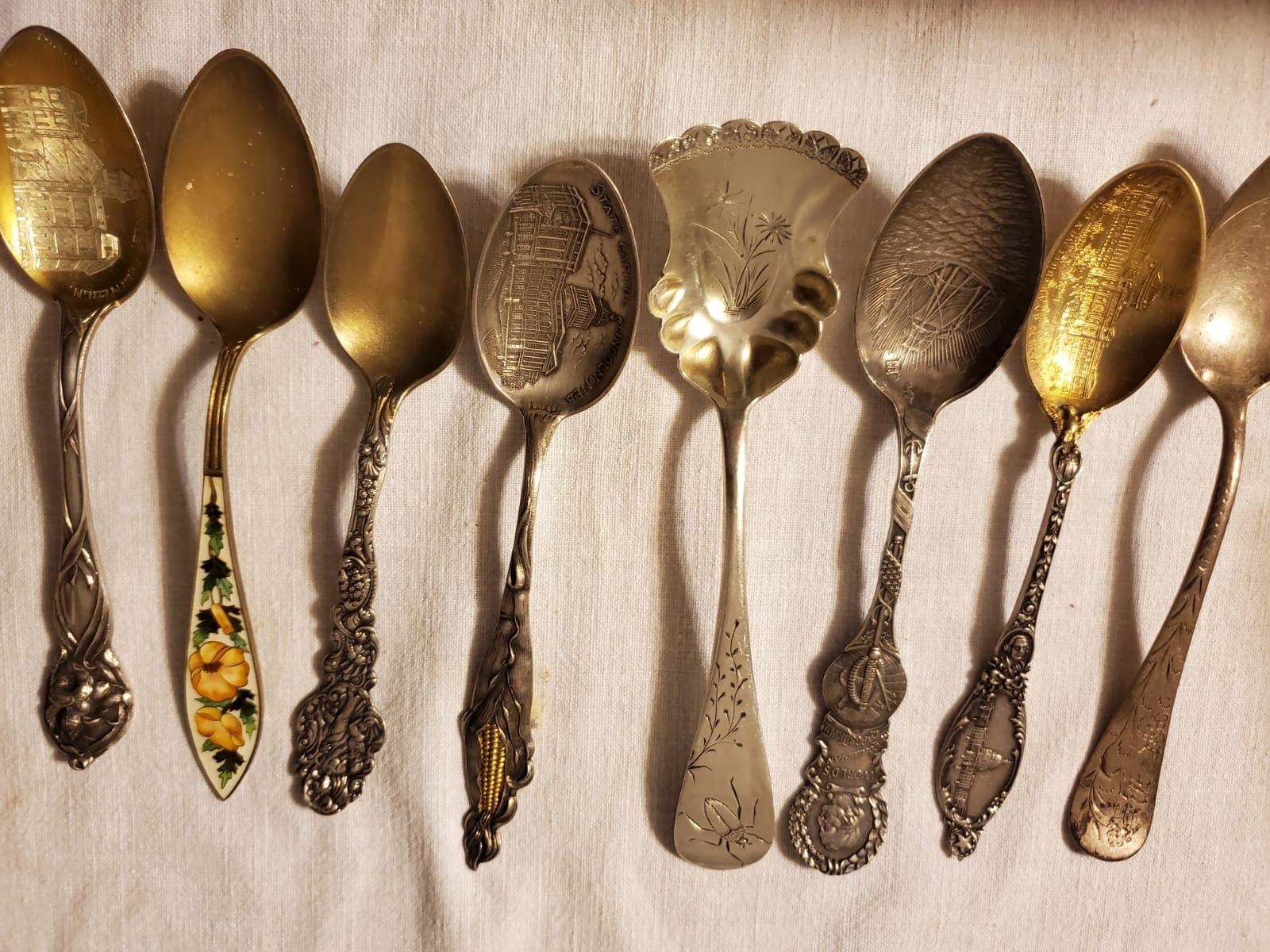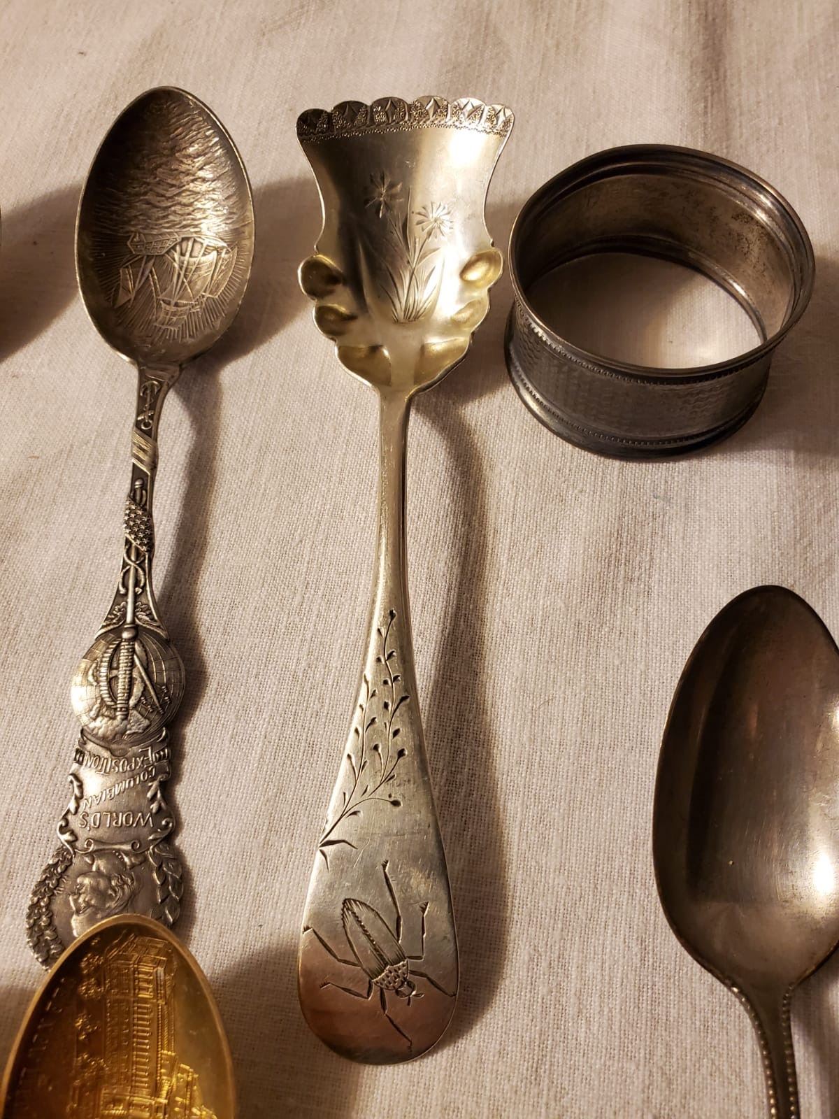 Sterling silver spoons including World's Columbian Exposition, another from the State Capital Lincoln Neb. with gold wash corn on the handle. The New Library silver spoon with the eagle at the base and the Library of Congress building engraved on the handle as well as the White House on the back of the handle. Also, a silver sugar spoon with floral detailing and with a beetle engraving on the handle. Another, is the silver spoon with enamel handle and orange and green flowers. A Main Building State University Lincoln Neb with beautiful floral detailing on the handle. Lastly, a silver spoon with a woman and her child on the handle surrounded by a floral detailing around them.