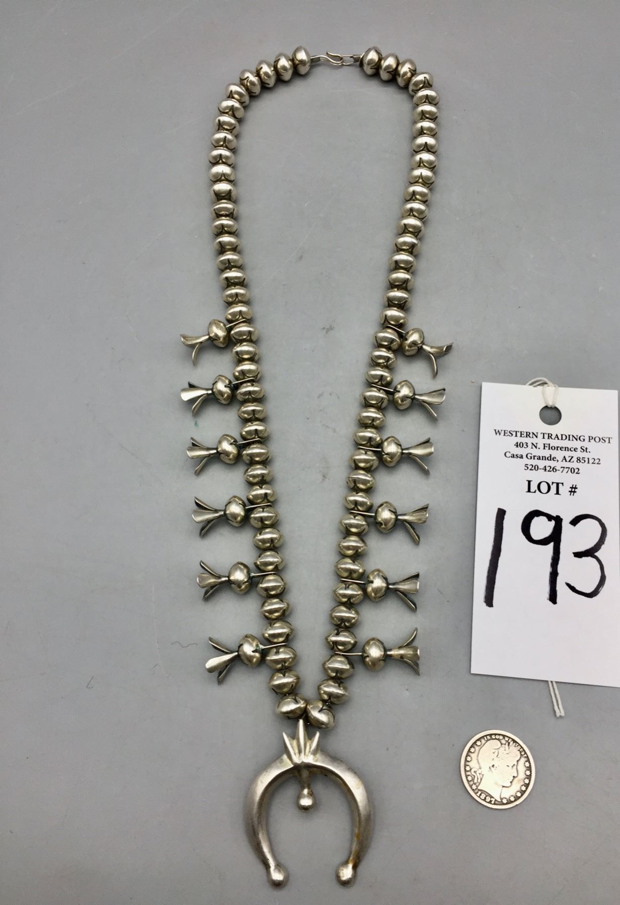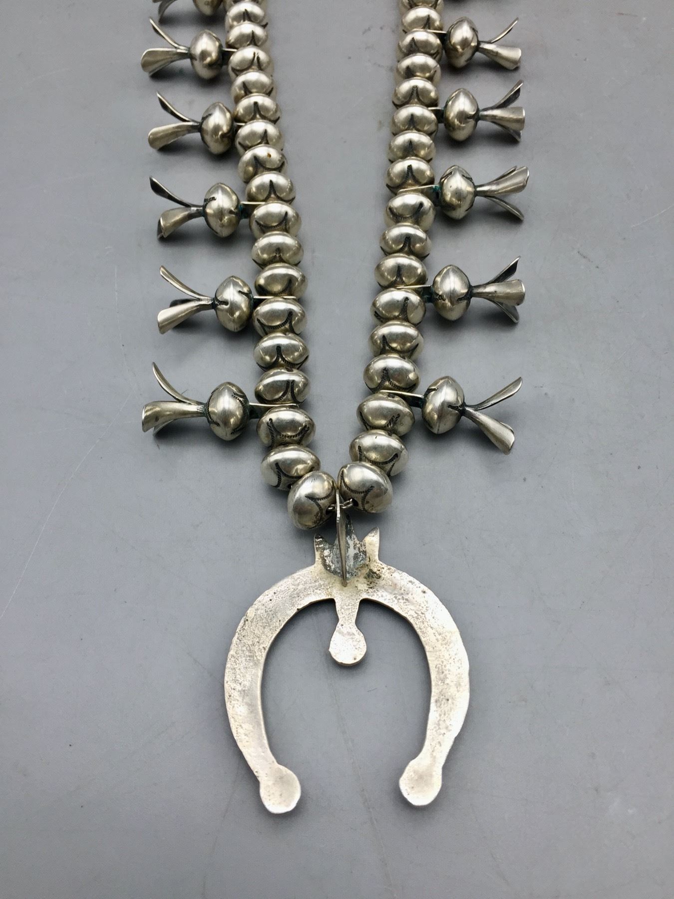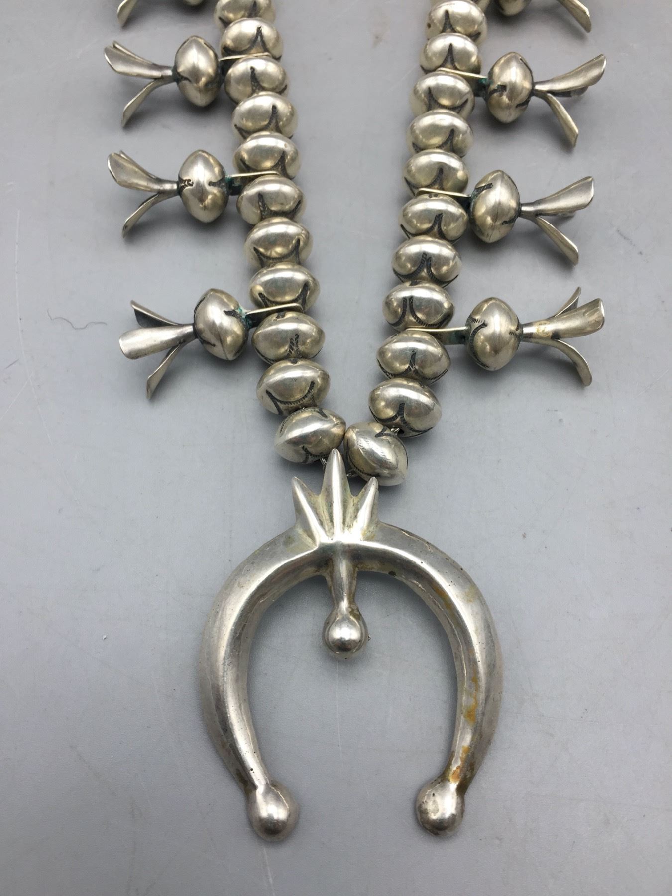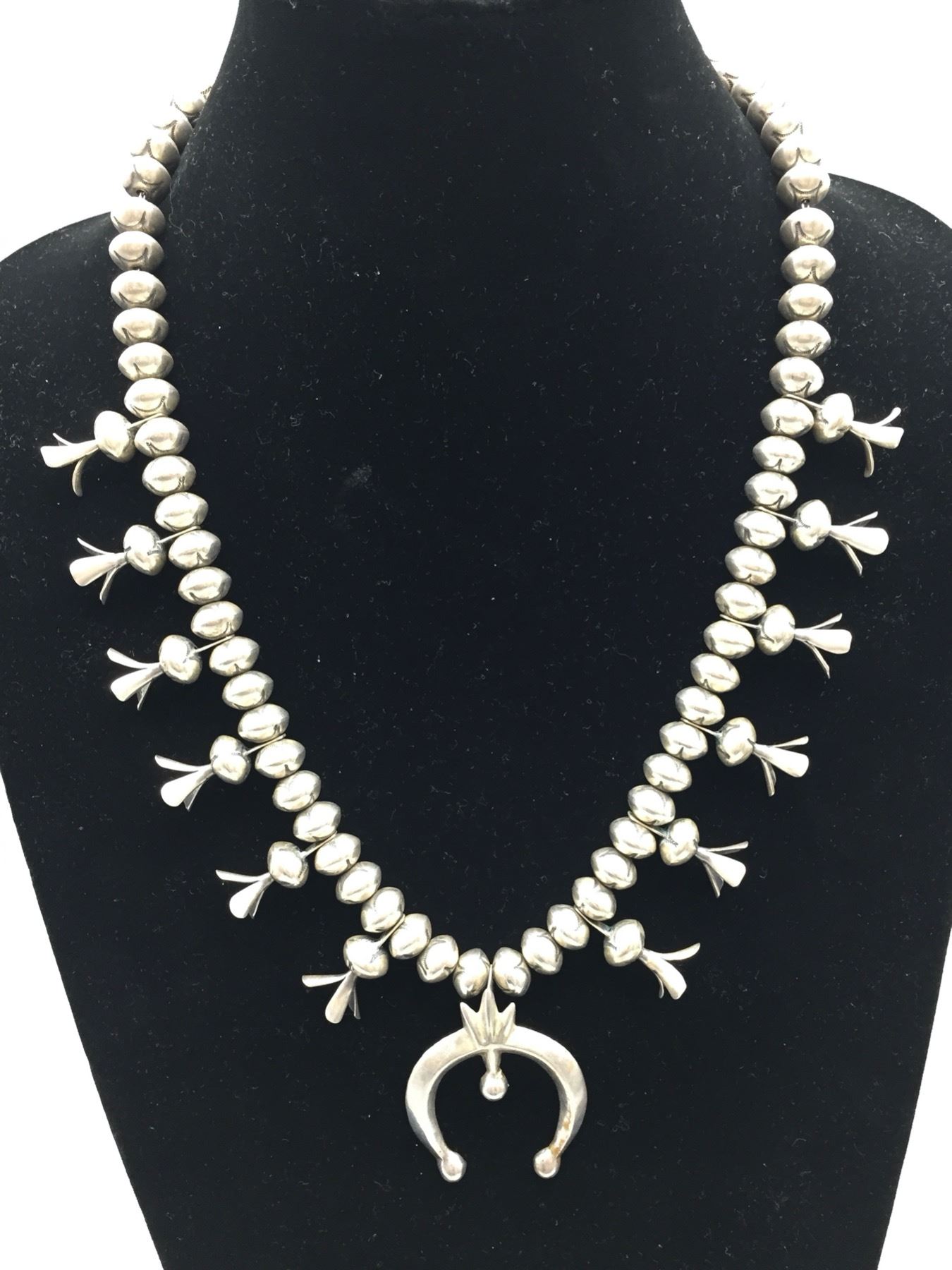 Description: Offered for sale in this lot is this brilliant sterling silver squash blossom, strung with stamped sterling silver beads and a simple naja. Maker: Unknown. Approx. Age: Fairly modern. Size: Fits a 23†neck. Naja measures 2†long X 1-5/8†wide. Weighs 126.6 grams. Condition: Good for its age, normal wear expected. Please look closely at the pictures - they are an important part of our description. Shipping: There will be a $5 handling / packaging fee for shipping this lot. The actual cost of postage will be added on top of that.