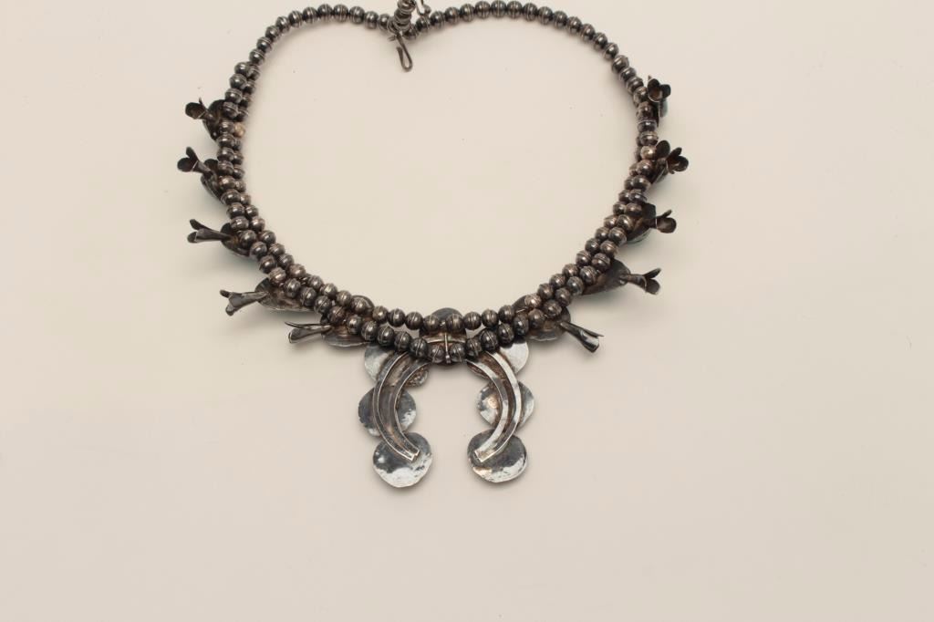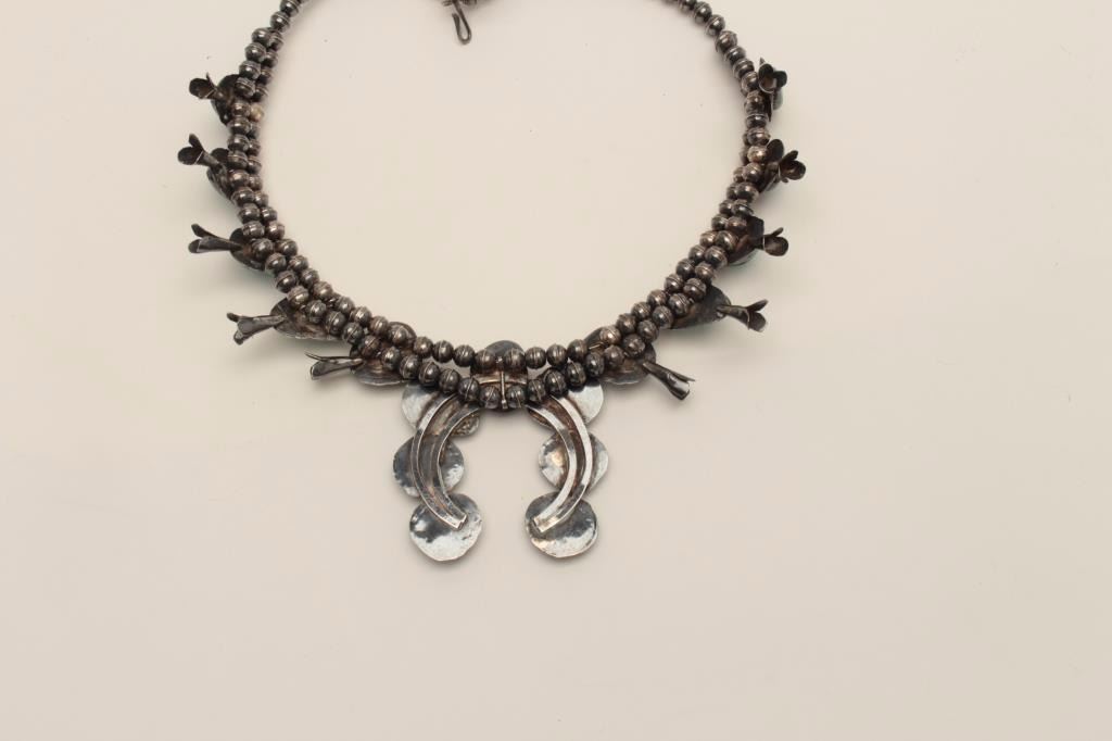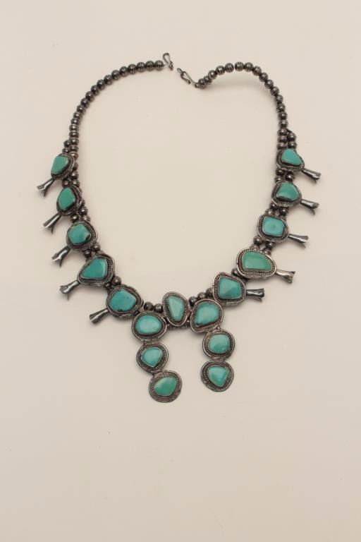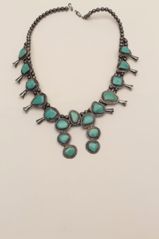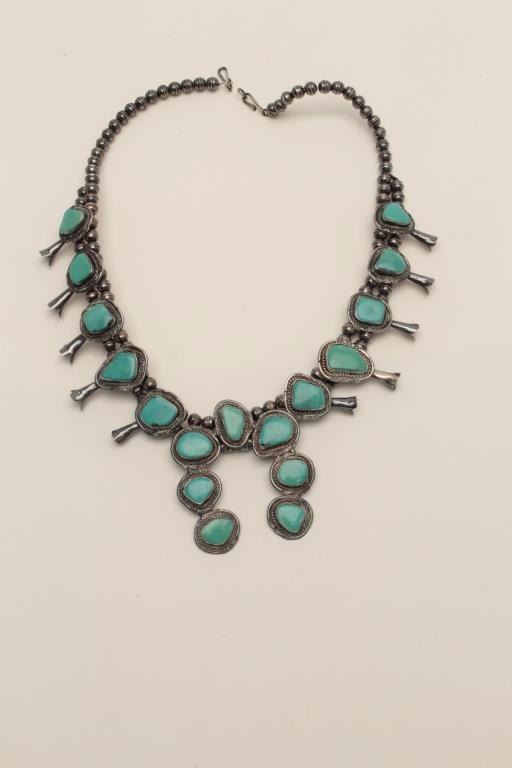 Sterling Silver Squash Blossom style American Indian made Necklace mounted with turquoise. collected 1958-1979 from local Estate. Est$500-1000