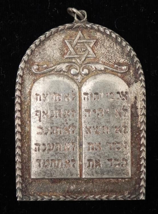 This is a sterling silver pendant with the Star of David & the 10 Commandments. It has nice details, and decorative border. The size is 1 3/8" x 2", and the weight is 1.13 grams. The reverse is stamped Sterling. It is in very good condition, and just shows normal aging of the silver which could be brightened up. * * This is a fine silver pendant for your collection.