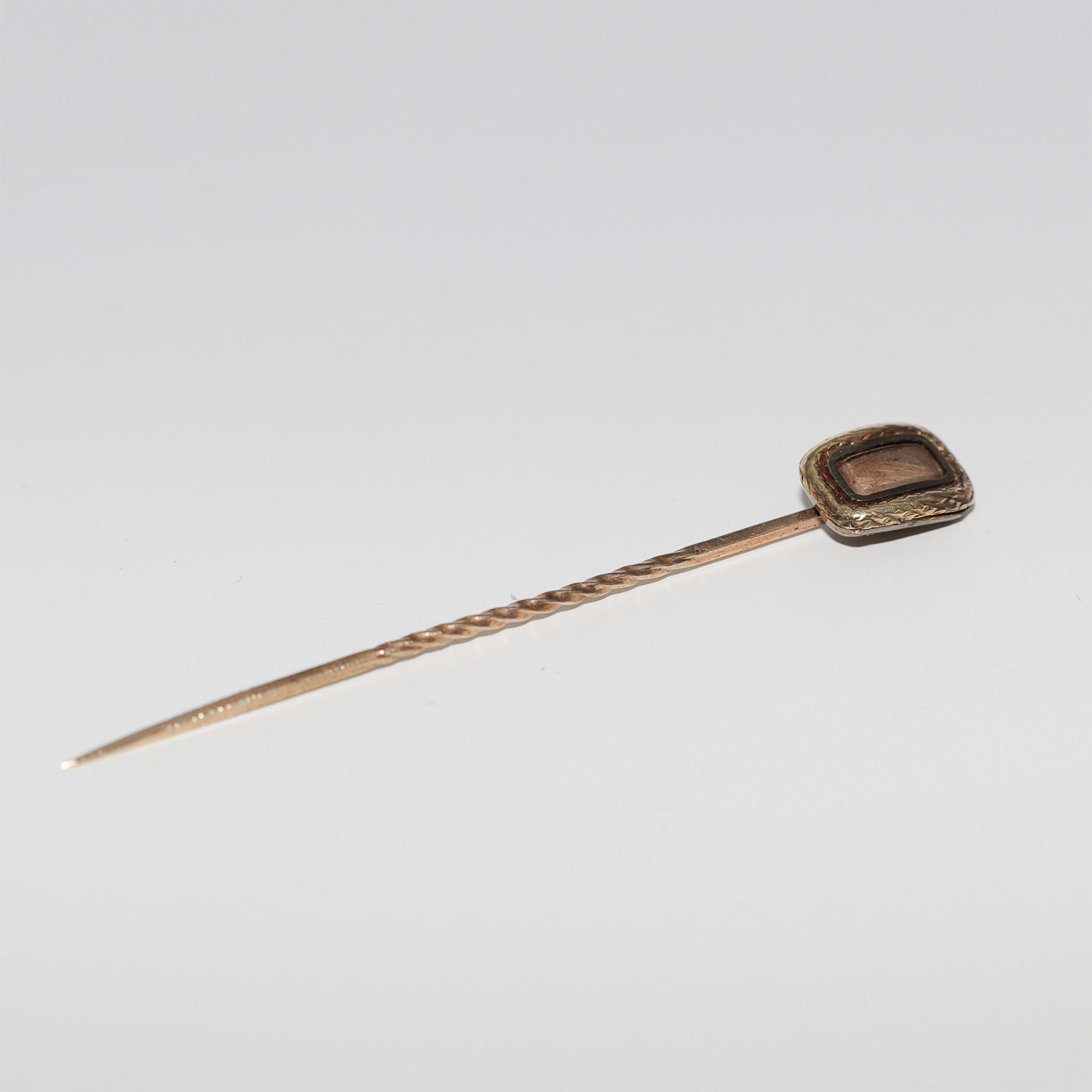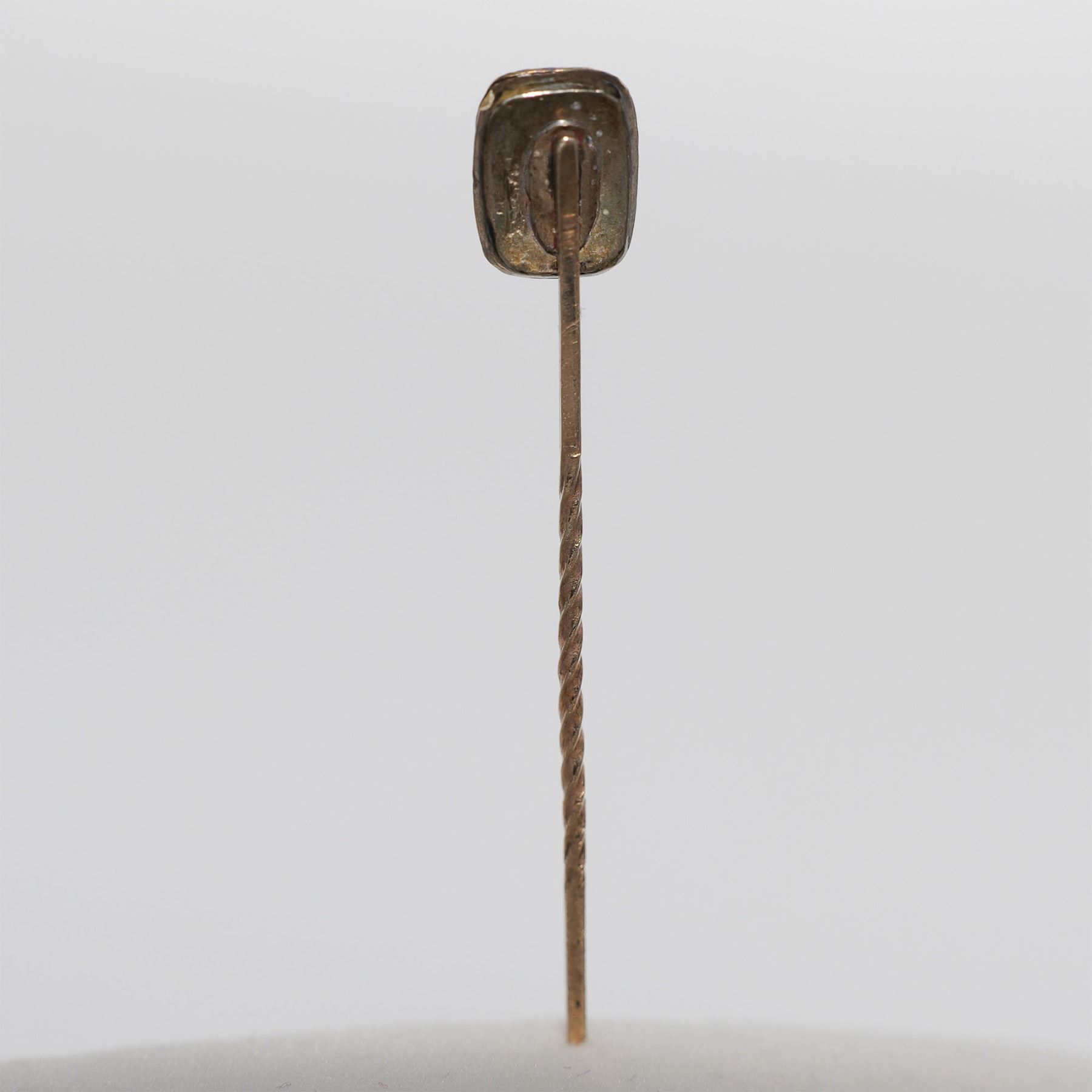 This elegant vintage stick pin is crafted from sterling silver and features a rectangular glass cabochon at its center. The pin shaft has a finely textured design, adding sophistication to the overall look. The cabochon showcases subtle brown hues, enhancing its classic aesthetic. Measuring approximately 2.5 inches in length, this piece is perfect for collectors of fine vintage jewelry or as a distinctive accessory for formal occasions. Its sturdy construction ensures it remains a timeless addition to any collection.