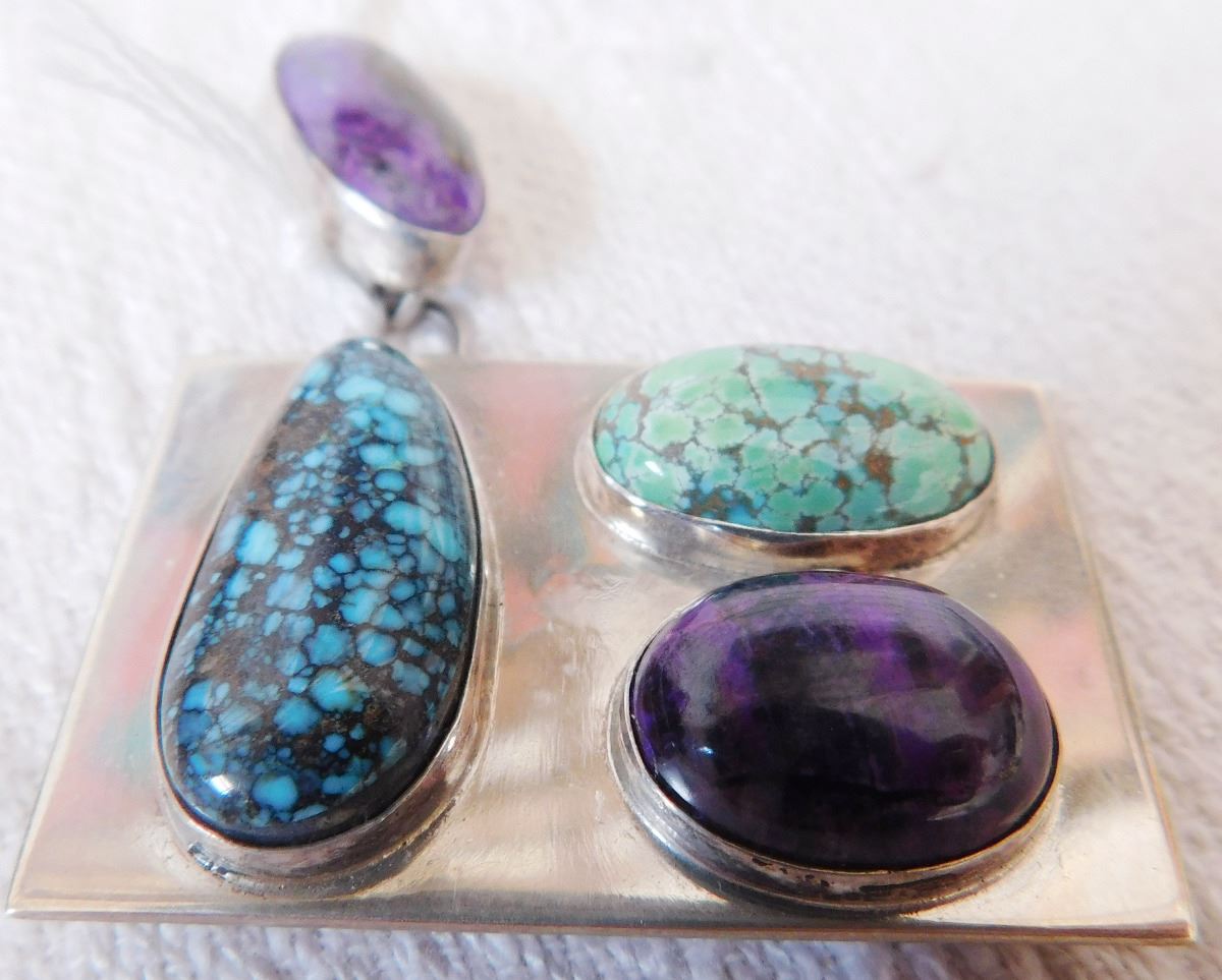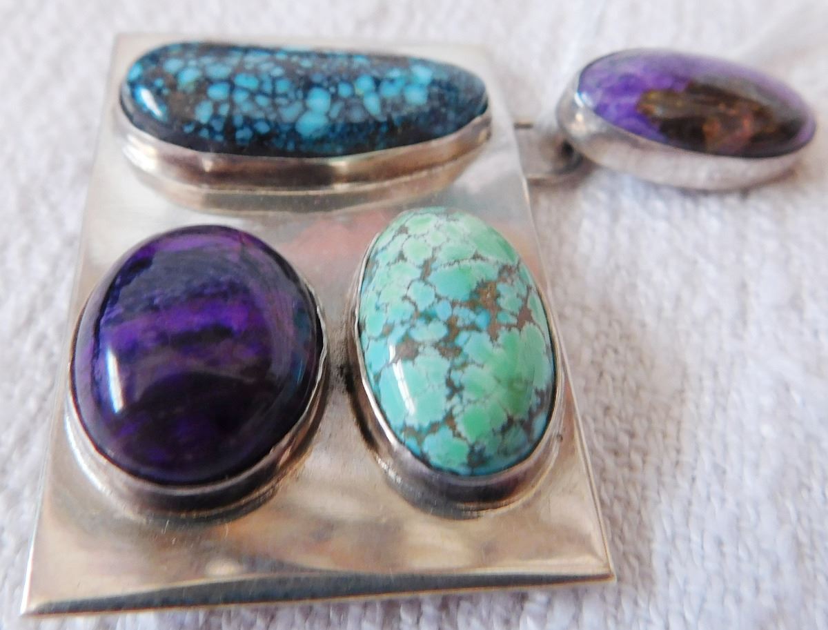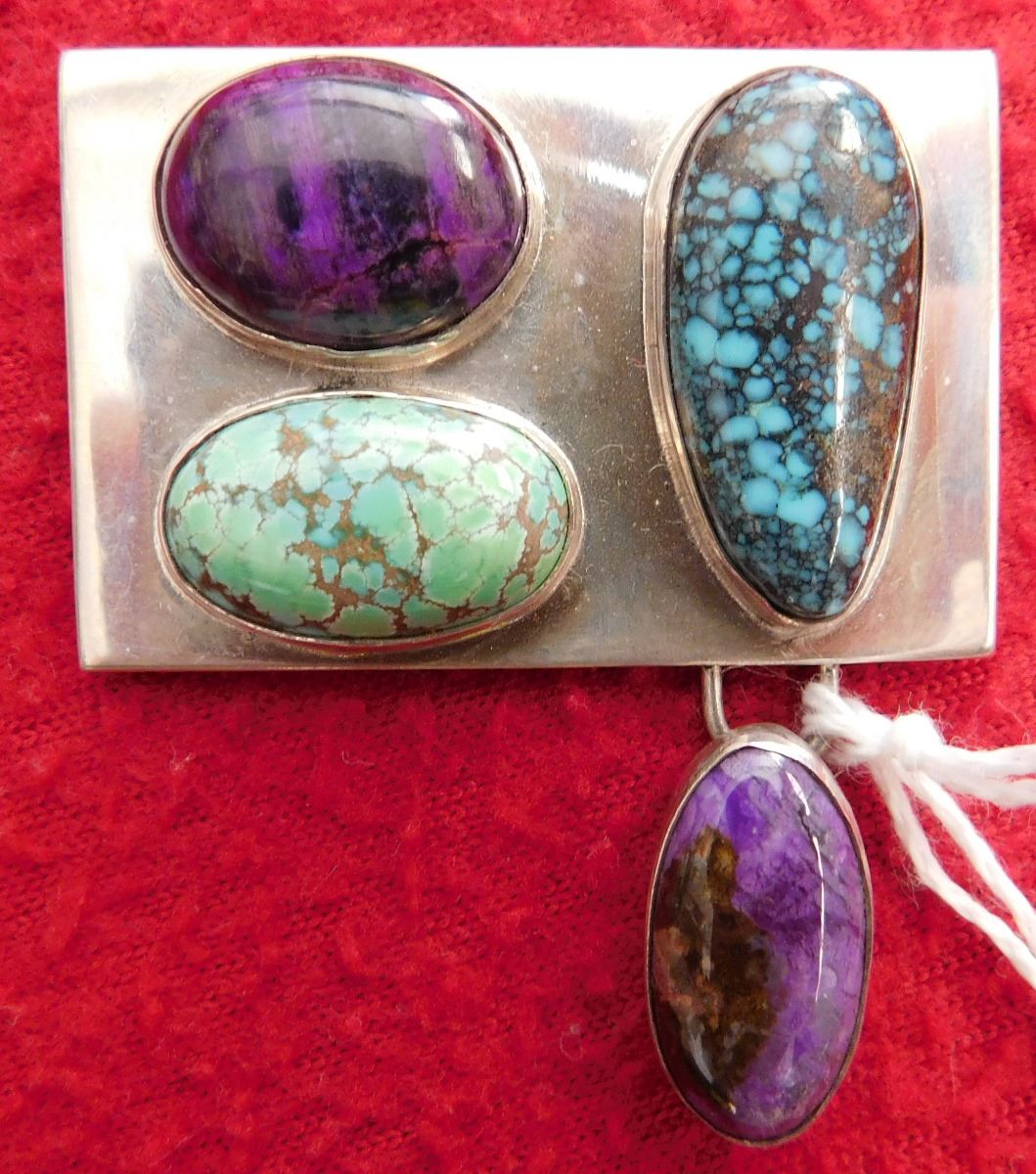 Sterling Silver & Stone Pin, circa 1980s. Made of turquoise, possibly sugelite and sterling silver, the item measures 1.5" x 1.75" measuring for the drop. Navajo, signed by artist. Blue turquoise stone has the appearance of landers. Item weighs approx. 21.8 grams with stonework. Condition: Very good, see images. Shipping: $15.50 w/insurance and signature.
