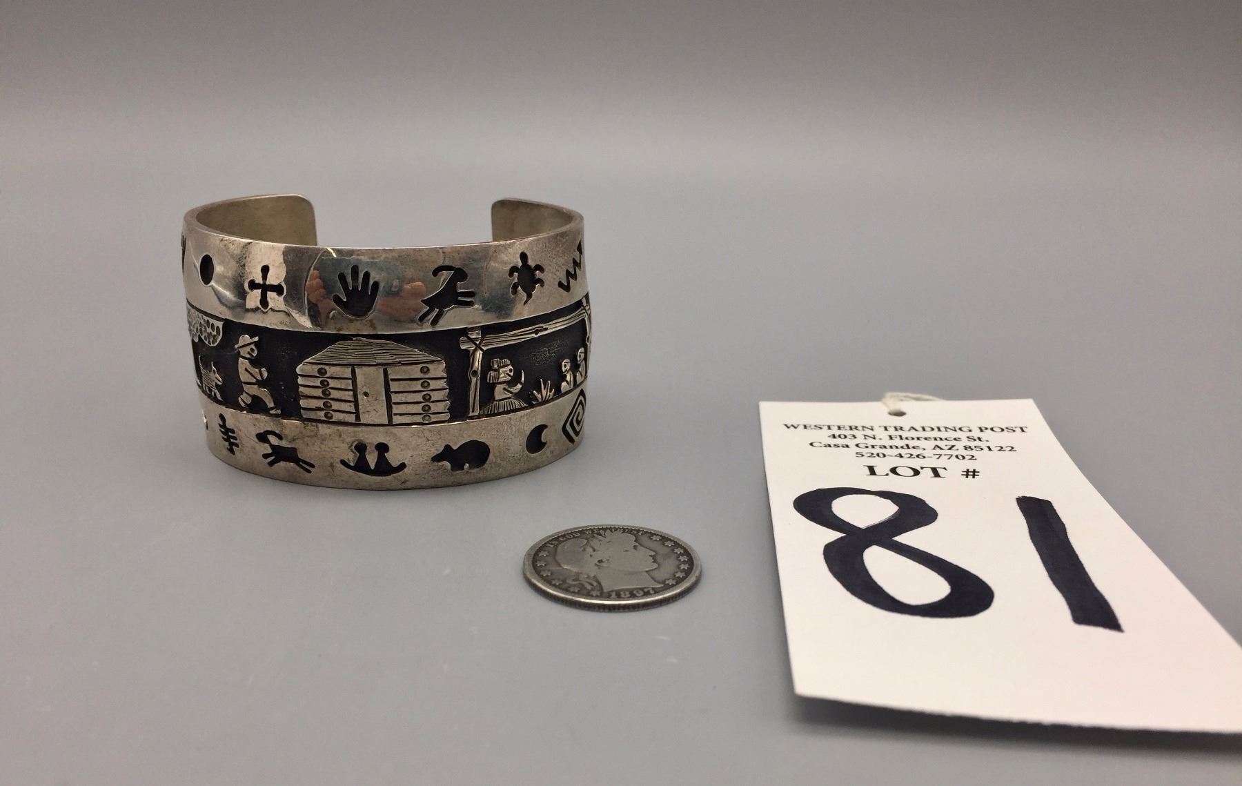 Maker: Hallmarked JB and Sterling and some other writing that could not be deciphered. JB could be one of a few makers. Approx. Age: Circa 1980s to modern. Size: Inside circumference measures 5 3/4” with an additional 1 1/4” opening (fitting approx. 7” wrist), 1 1/2” w and weighs 108.5 g. Additional Info: A sterling silver overlay storyteller bracelet. Condition: Good for it’s age, normal wear expected. Please look closely at the pictures - they are an important part of our description. Shipping: There will be a $5 handling / packaging fee for shipping this lot. The actual cost of postage will be added on top of that.