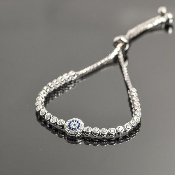 A sterling silver tassel bracelet featuring repeating bezel set cubic zirconia on a box chain with an adjustable length and bead accent to each end. 8 inches. This item is accompanied with a certificate of authenticity.