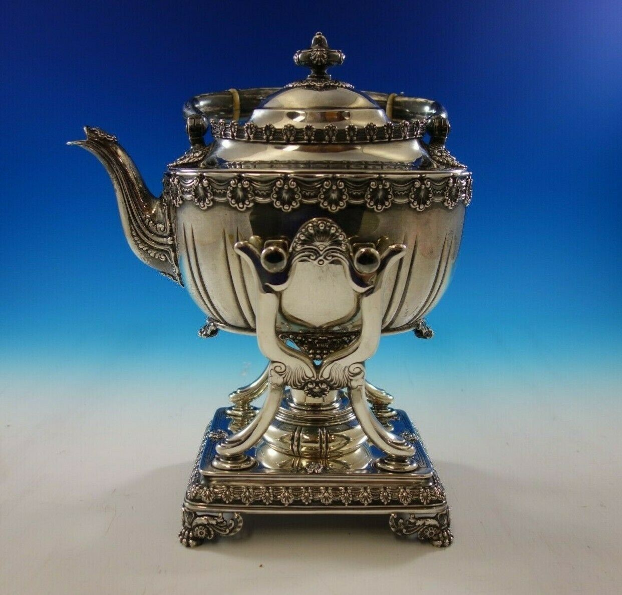 1 - Kettle on Stand: Marked 4 3/4 pint, measures 14" tall x 10", and weighs 72.3 troy ounces.