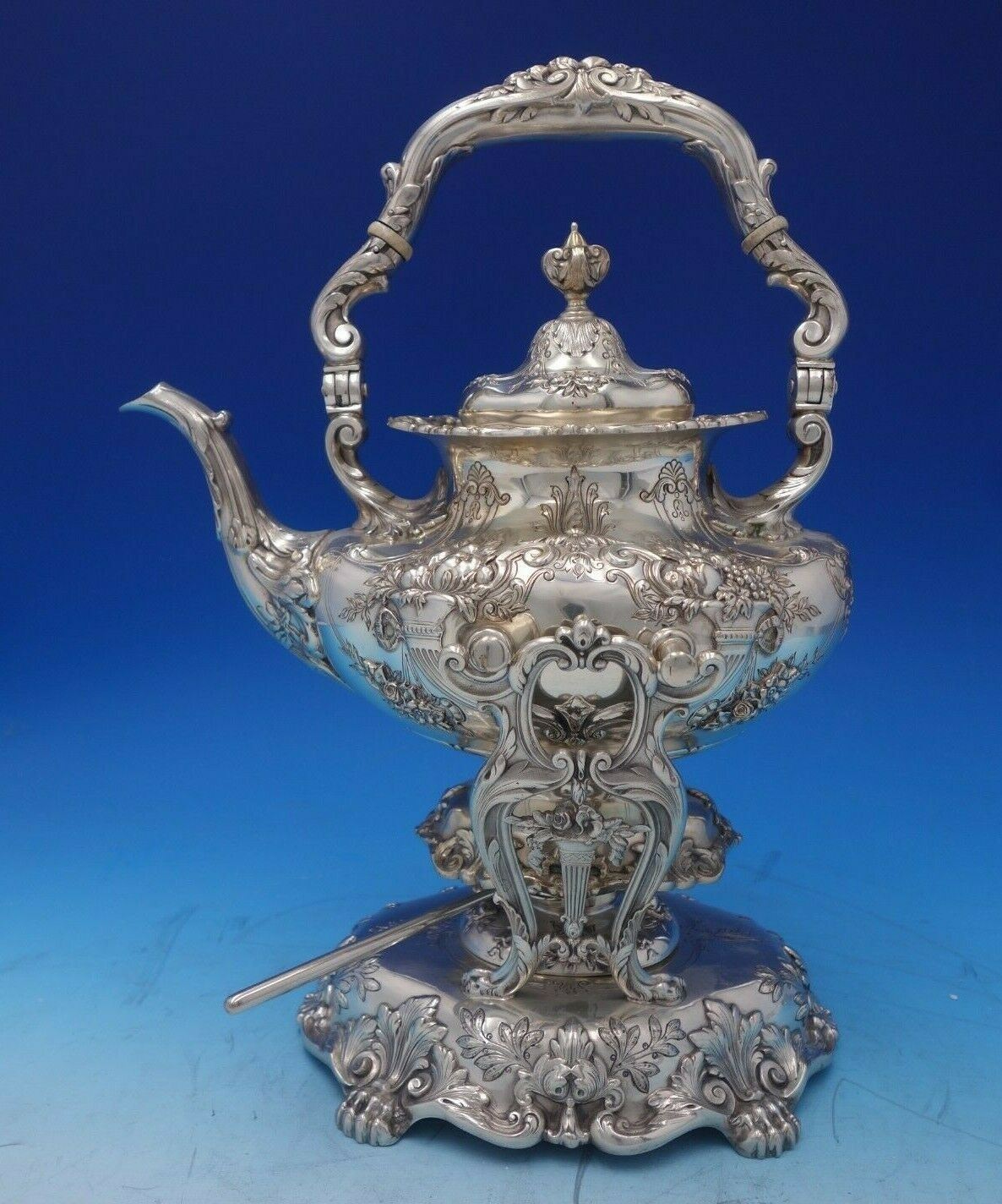 1 - Kettle on Stand: Marked #570A, measures 13 1/2" tall x 10", and weighs 82.6 troy ounces.