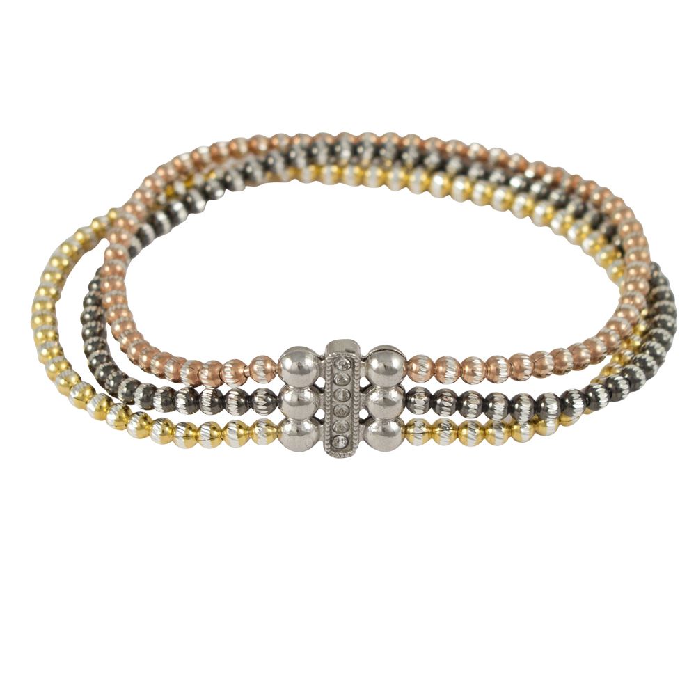 Sterling Silver Three Row Gold, Black, And Rose Gold Ball Stretch Bracelet With CZ Bar In Center