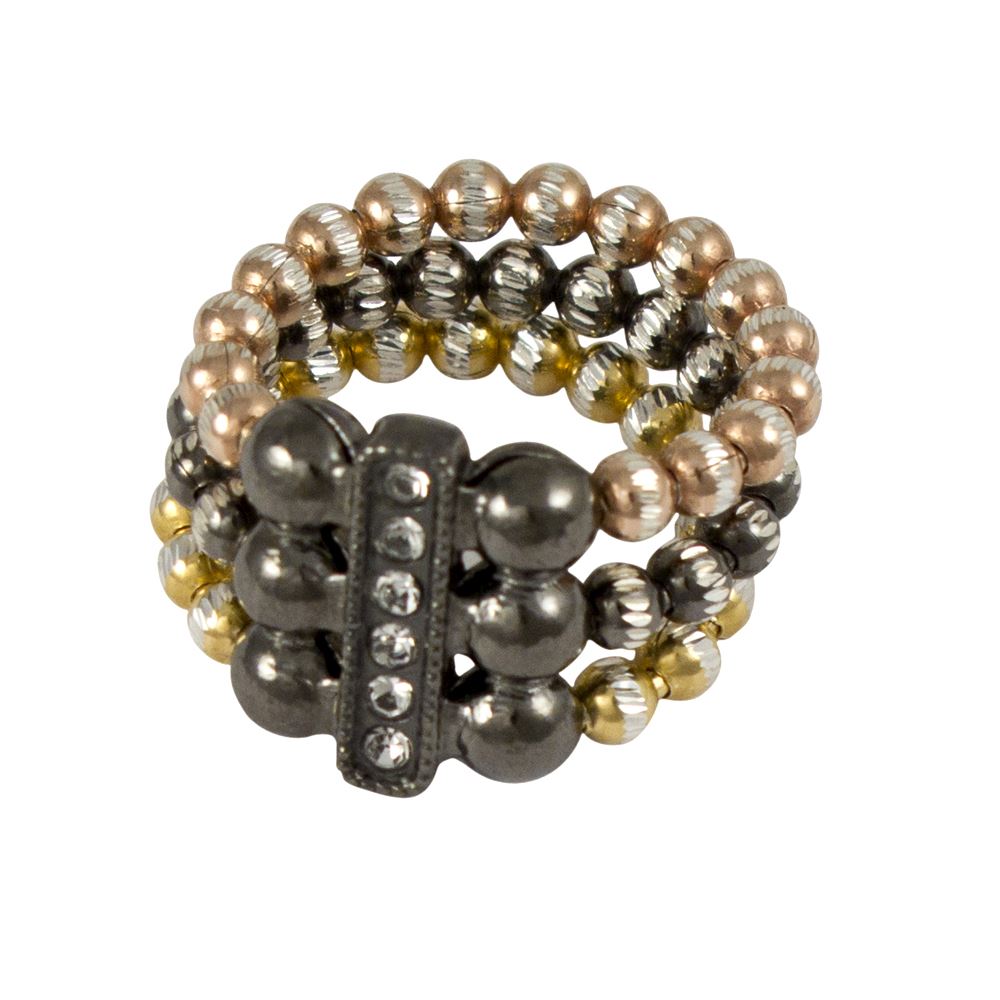 Sterling Silver Three Row Gold, Black, And Rose Gold Ball Stretch Ring With CZ Bar In Center