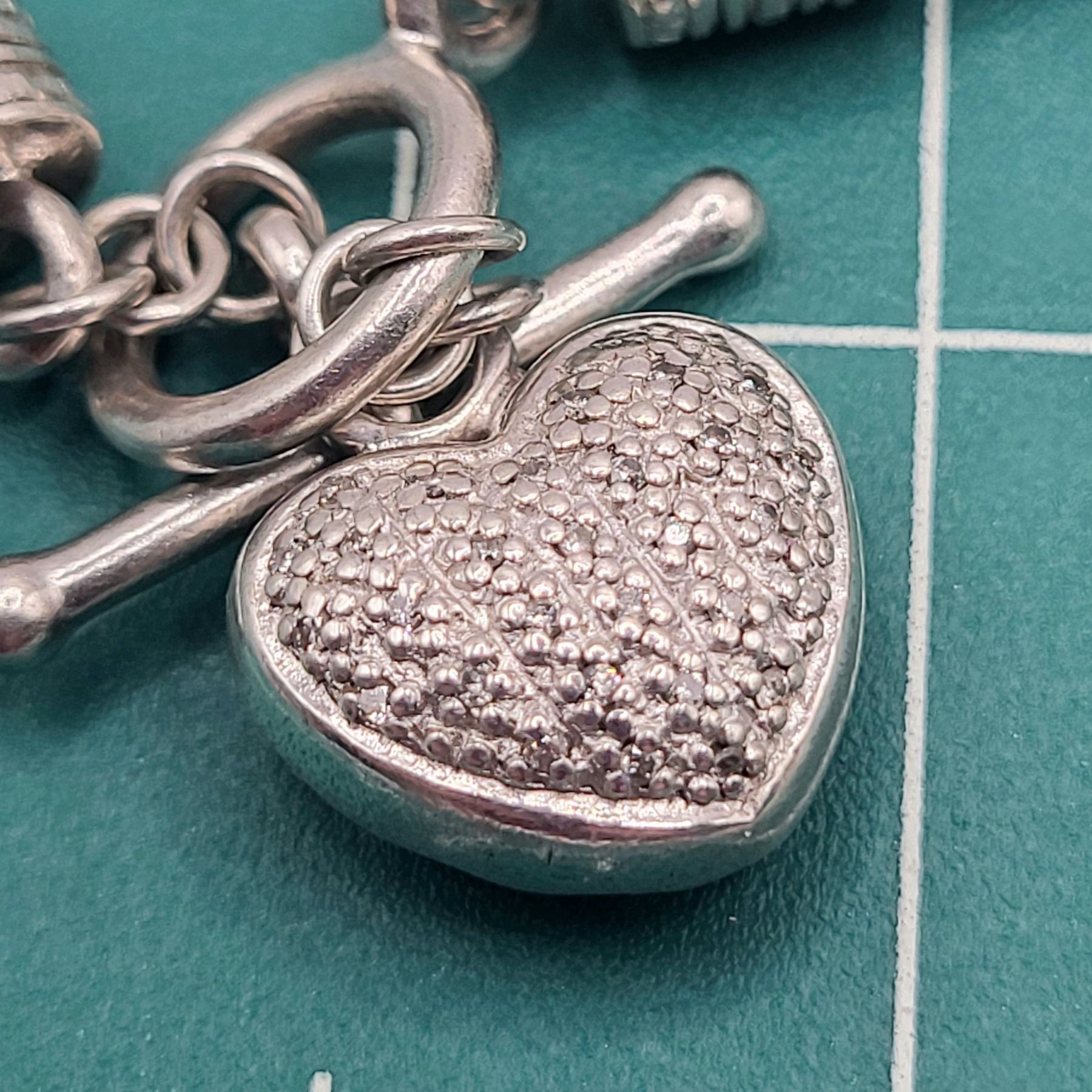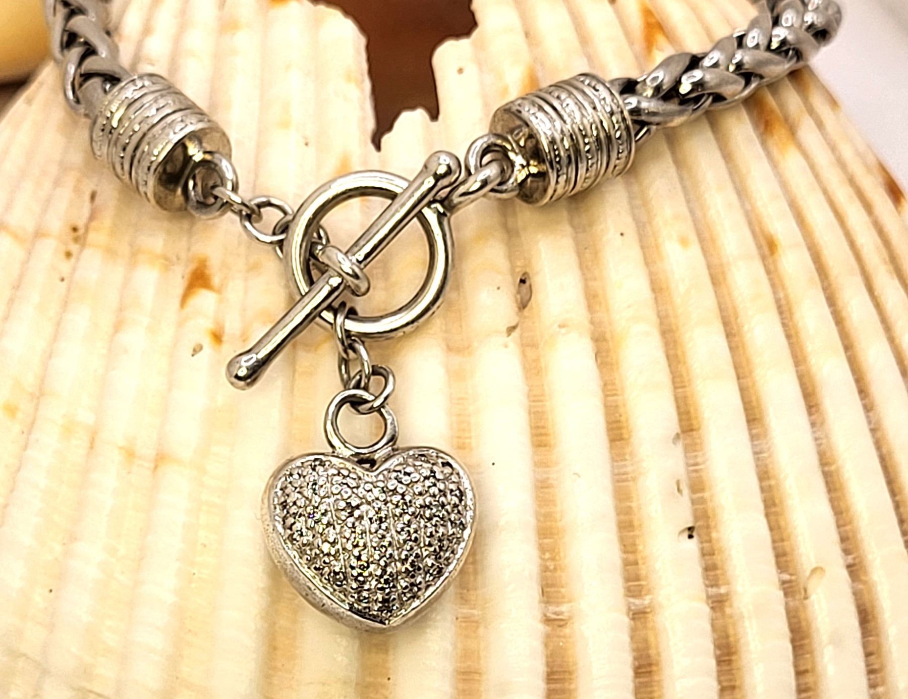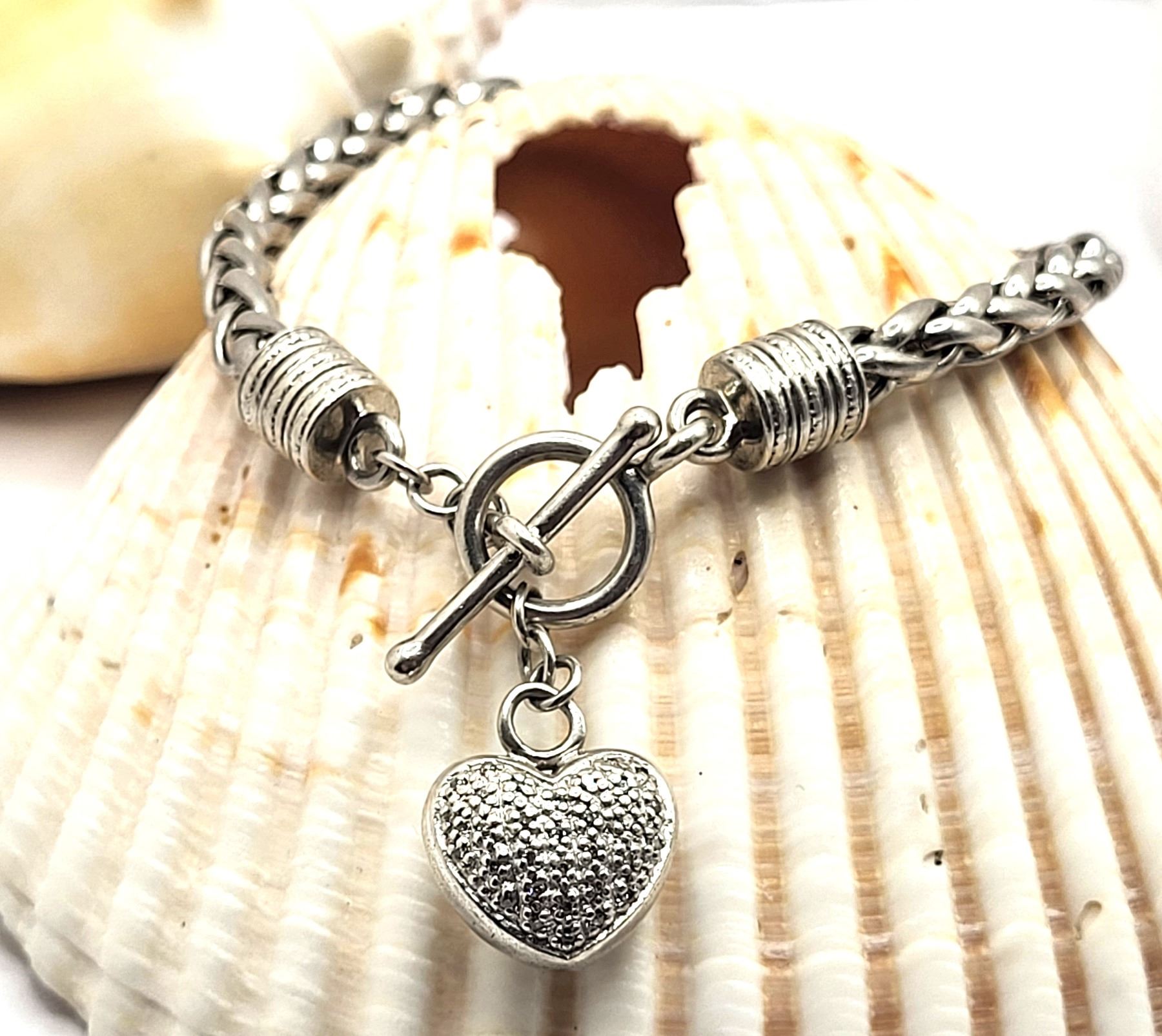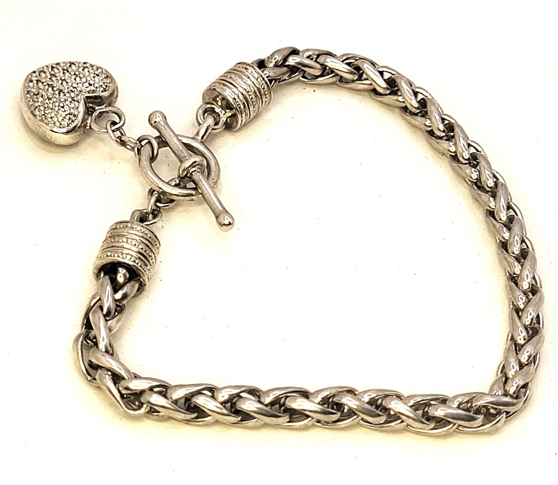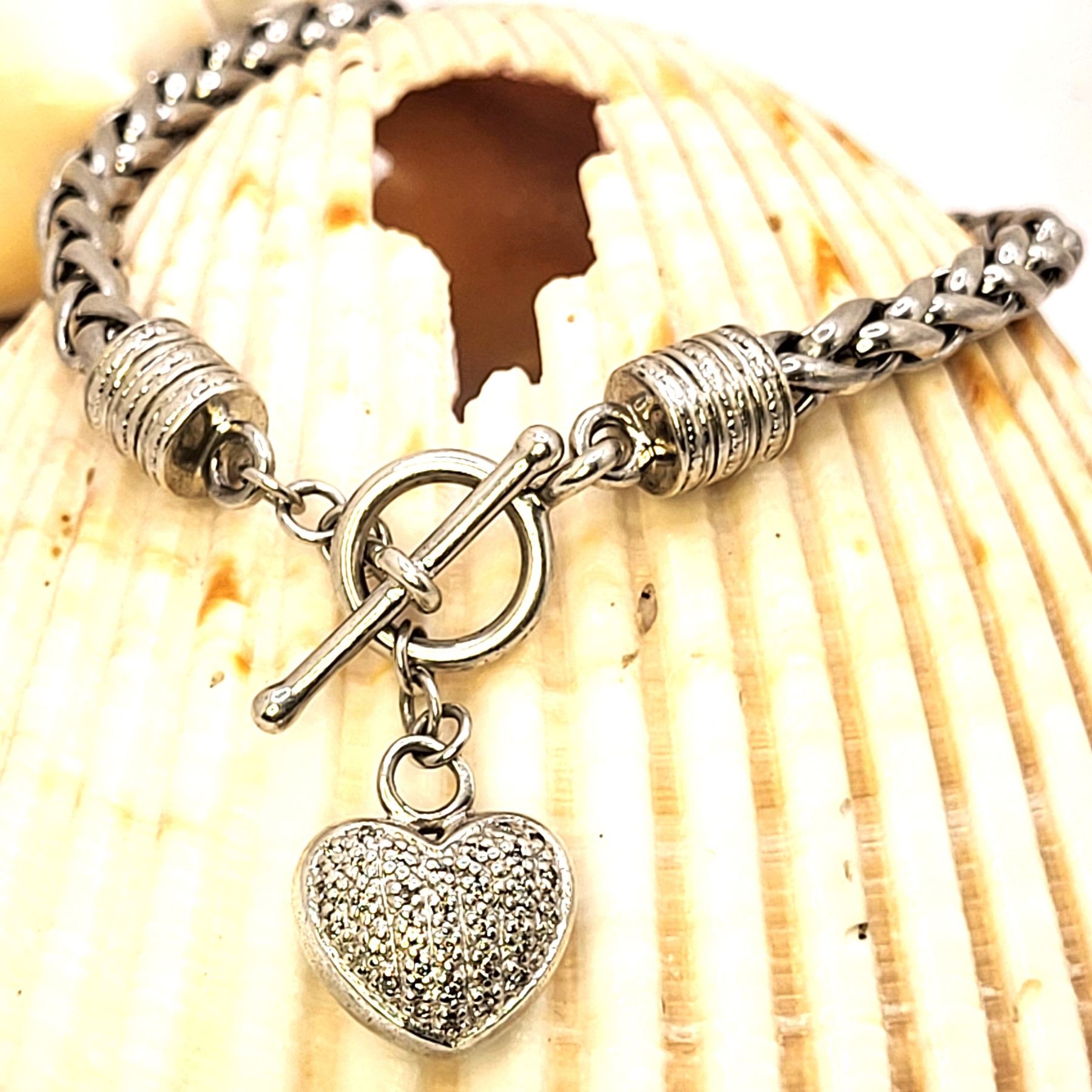 This is a sterling silver toggle bracelet with a dangling heart that features approximately .10 carats total weight of single cut I-J color, I2 clarity , wheat chain