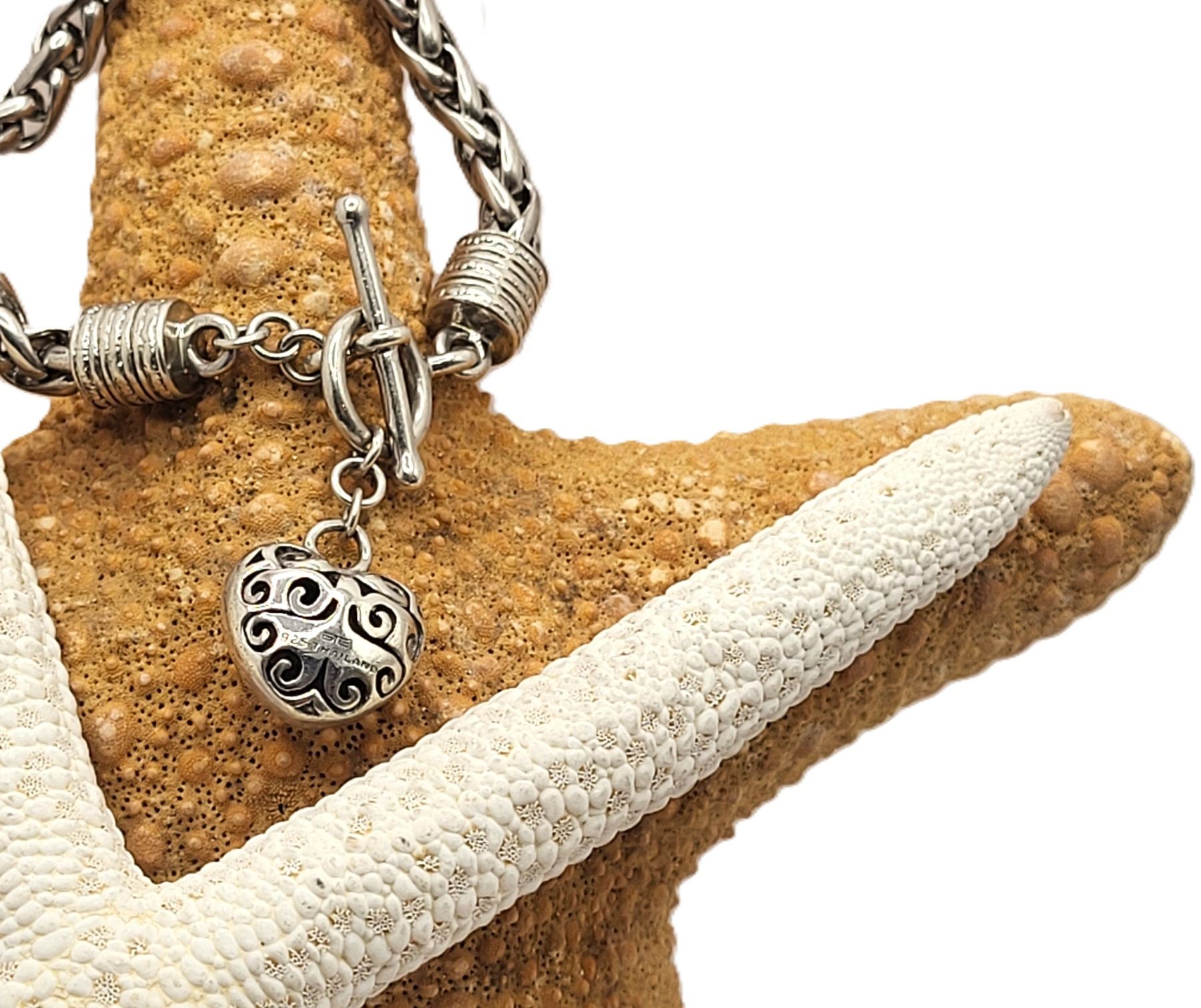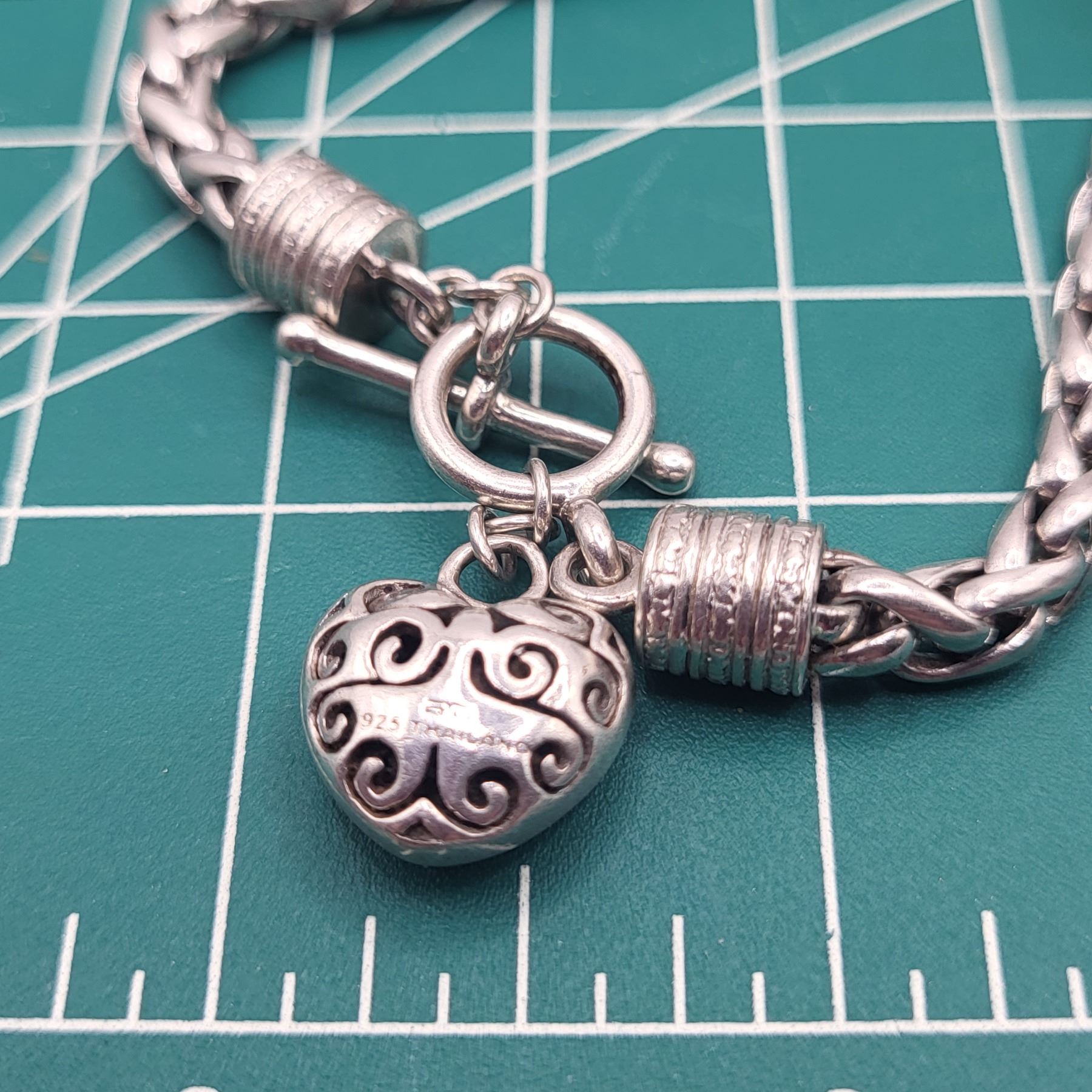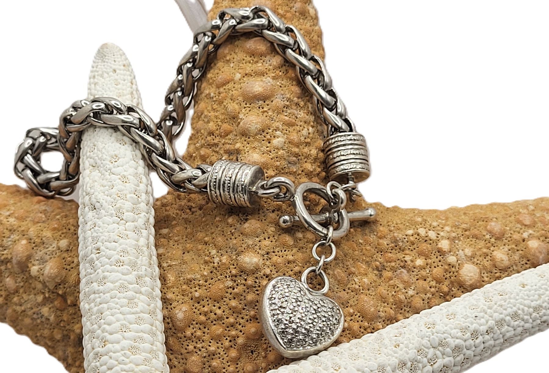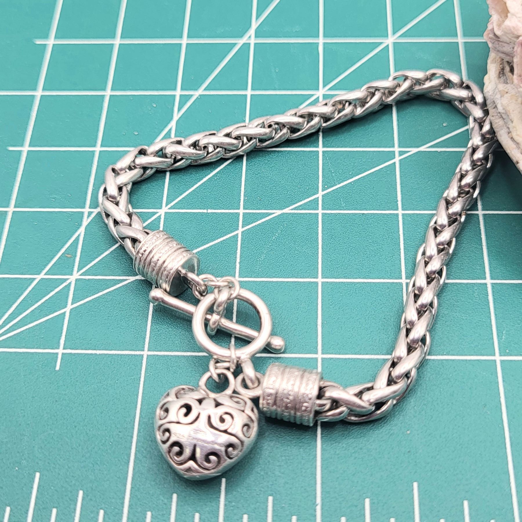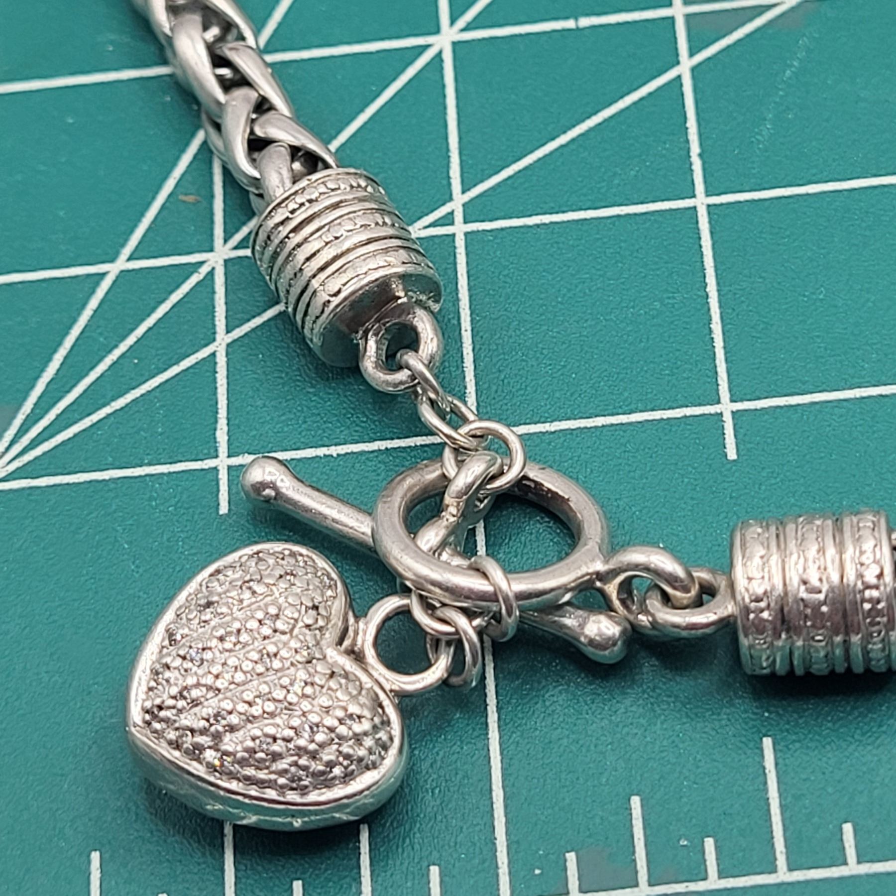 This is a sterling silver toggle bracelet with a dangling heart that features approximately .10 carats total weight of single cut I-J color, I2 clarity , wheat chain