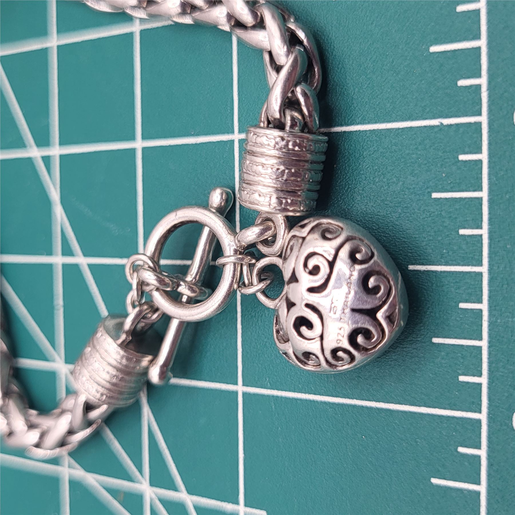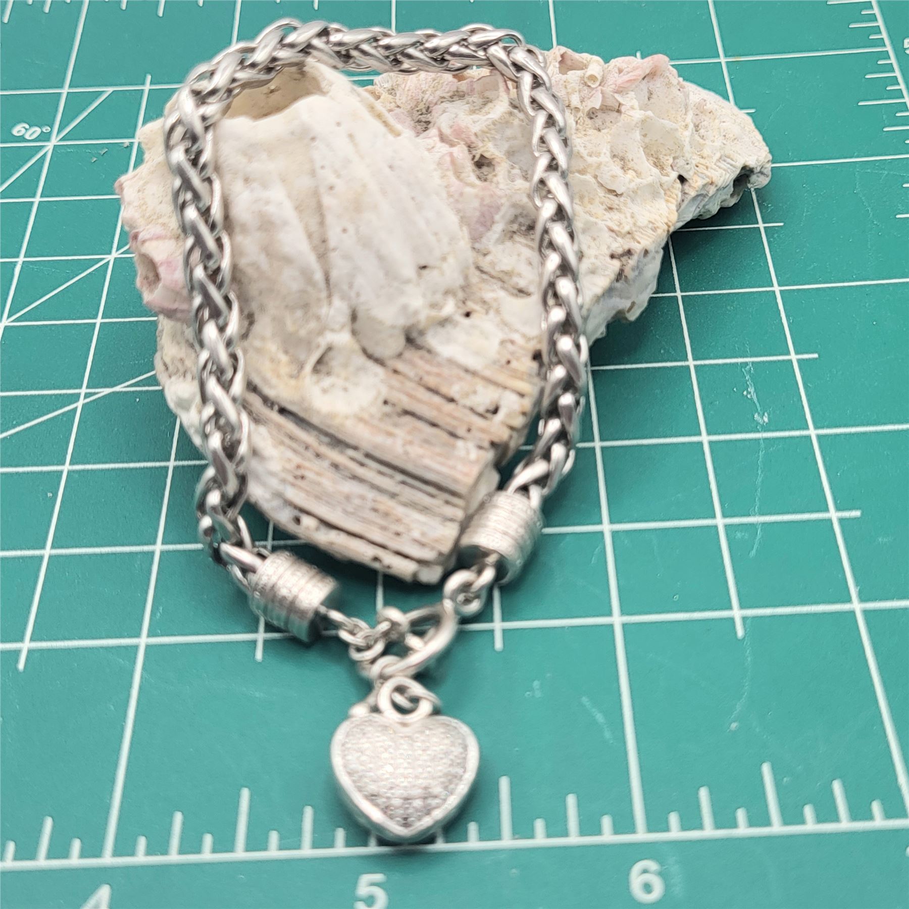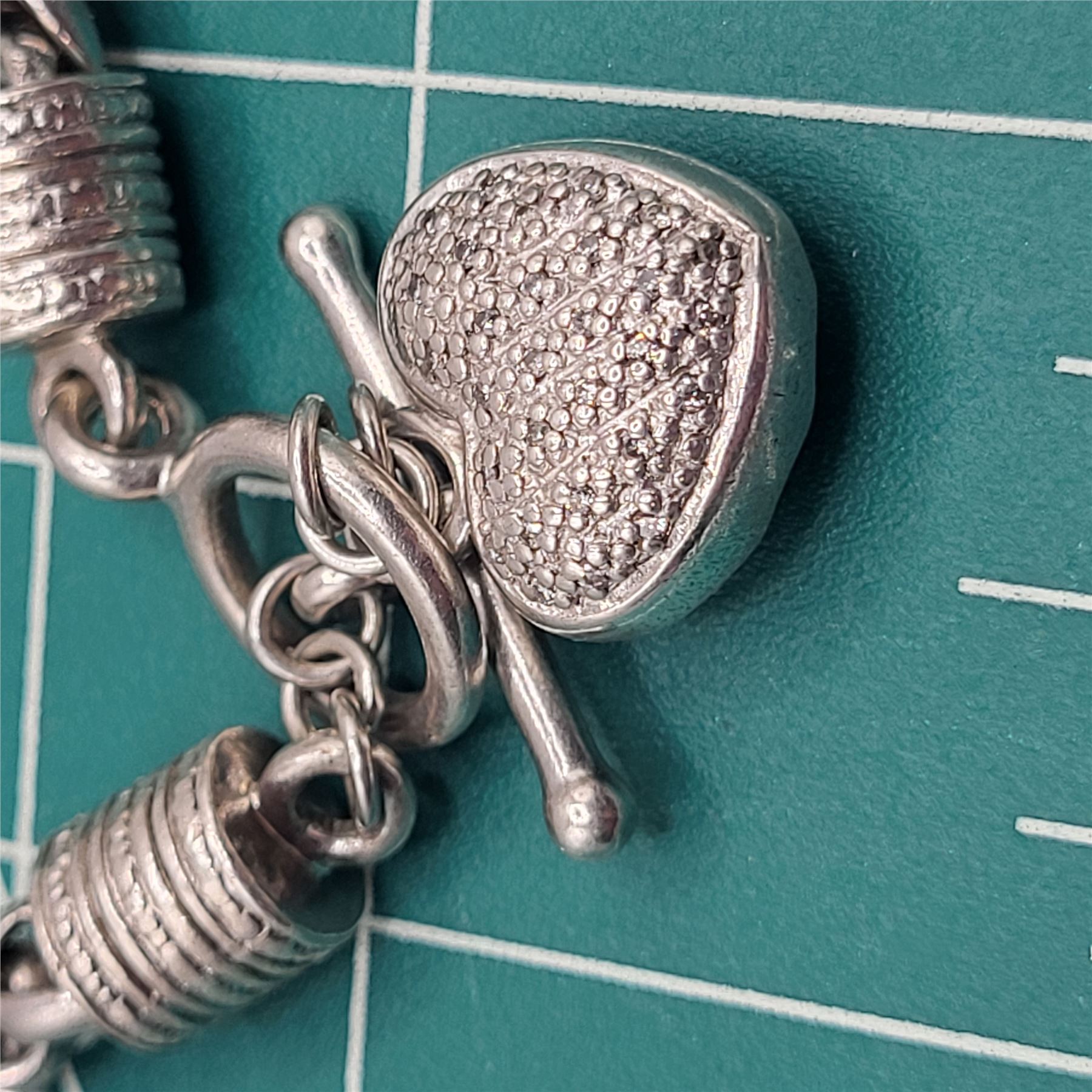 This is a sterling silver toggle bracelet with a dangling heart that features approximately .10 carats total weight of single cut I-J color, I2 clarity , wheat chain& nbsp;