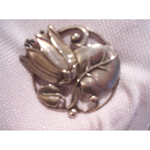 This is a large 2.5" diameter sterling silver pin that has an intricate design of a tulip and leaf. The only mark I can find is the word sterling on the back. The pin has a safety clasp that does close and open easily. The craftmanship is excellent. This pin will bring you many complements in the years to come.