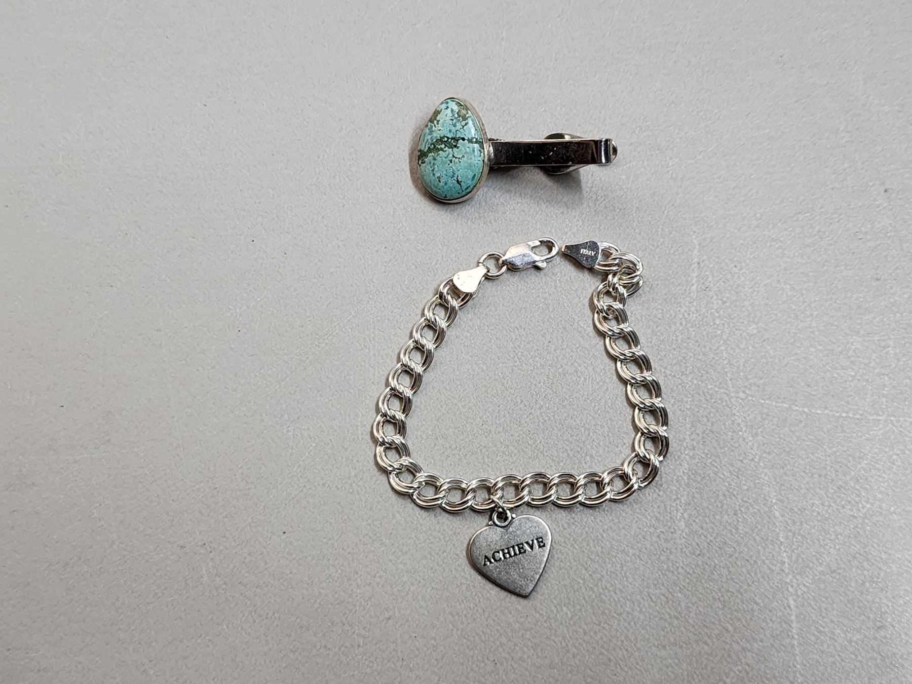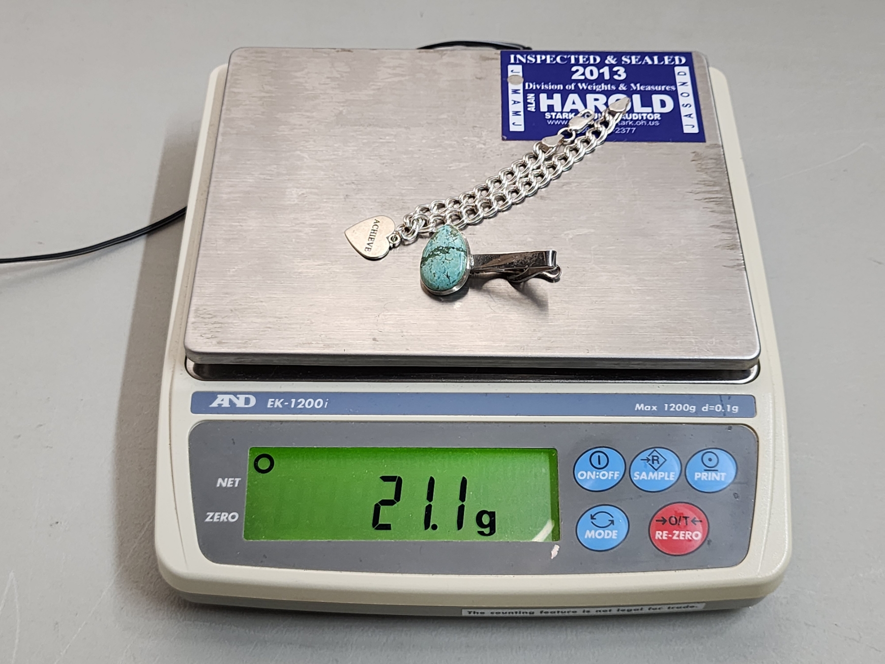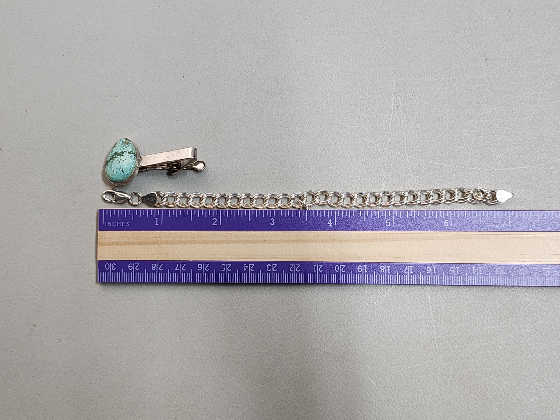 Sterling Silver Turquois Clip and 7in Charm Bracelet TW: 21.1g