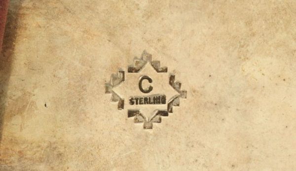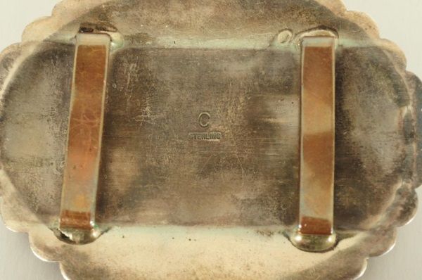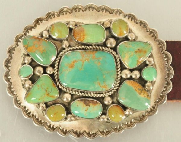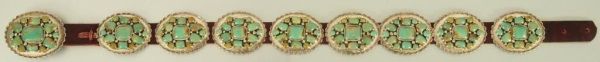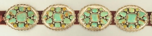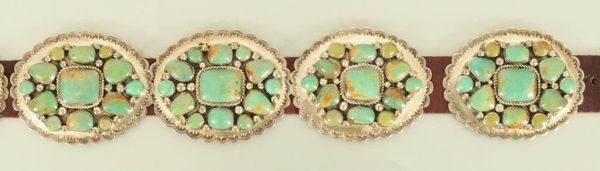 8 sterling silver conchos decorated with turquoise stones and marked with "C". Sterling silver belt buckle decorated with turquoise stones and marked with "C". Buckle measures 3 3/4" x 3", conchos measure 3 1/4" 2 1/2", belt measures 34" long