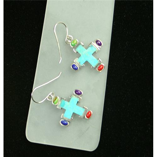 These beautiful Turquoise Cross Earrings feature Sterling Silver with blue lapis, green peridot and purple amethyst and red dyed onyx accents. Multiples available with combined shipping.