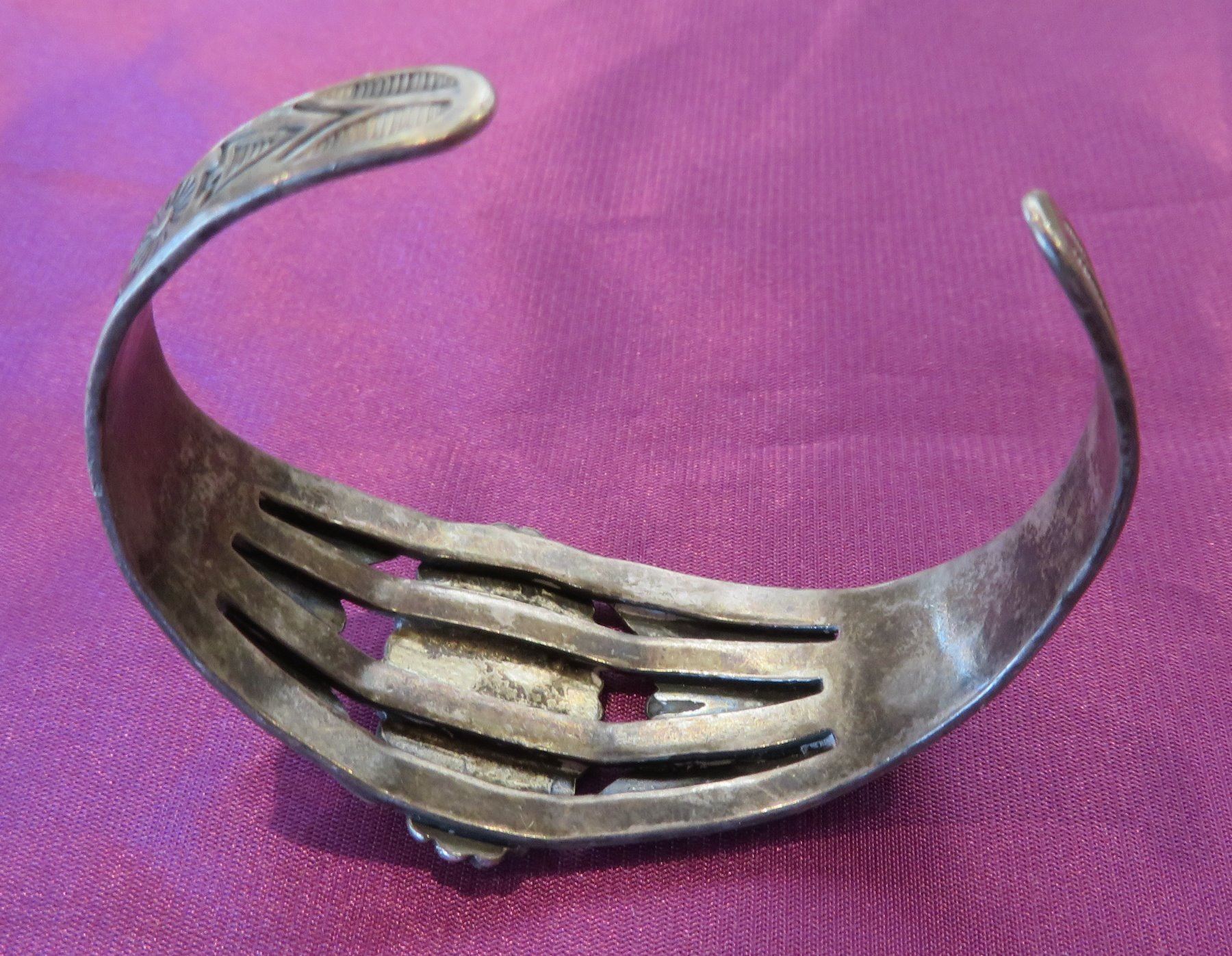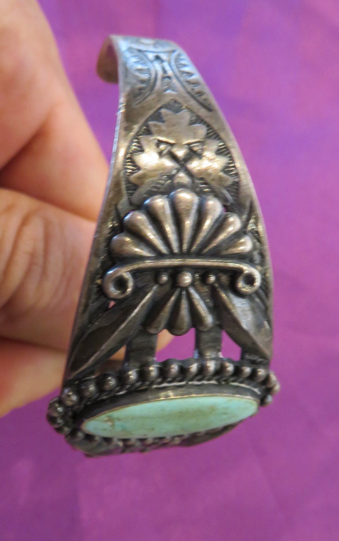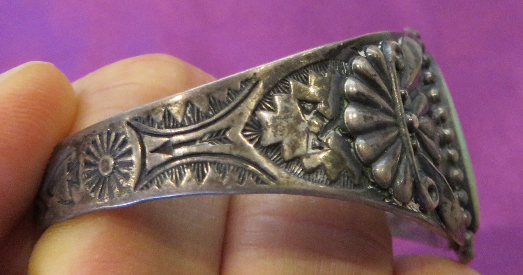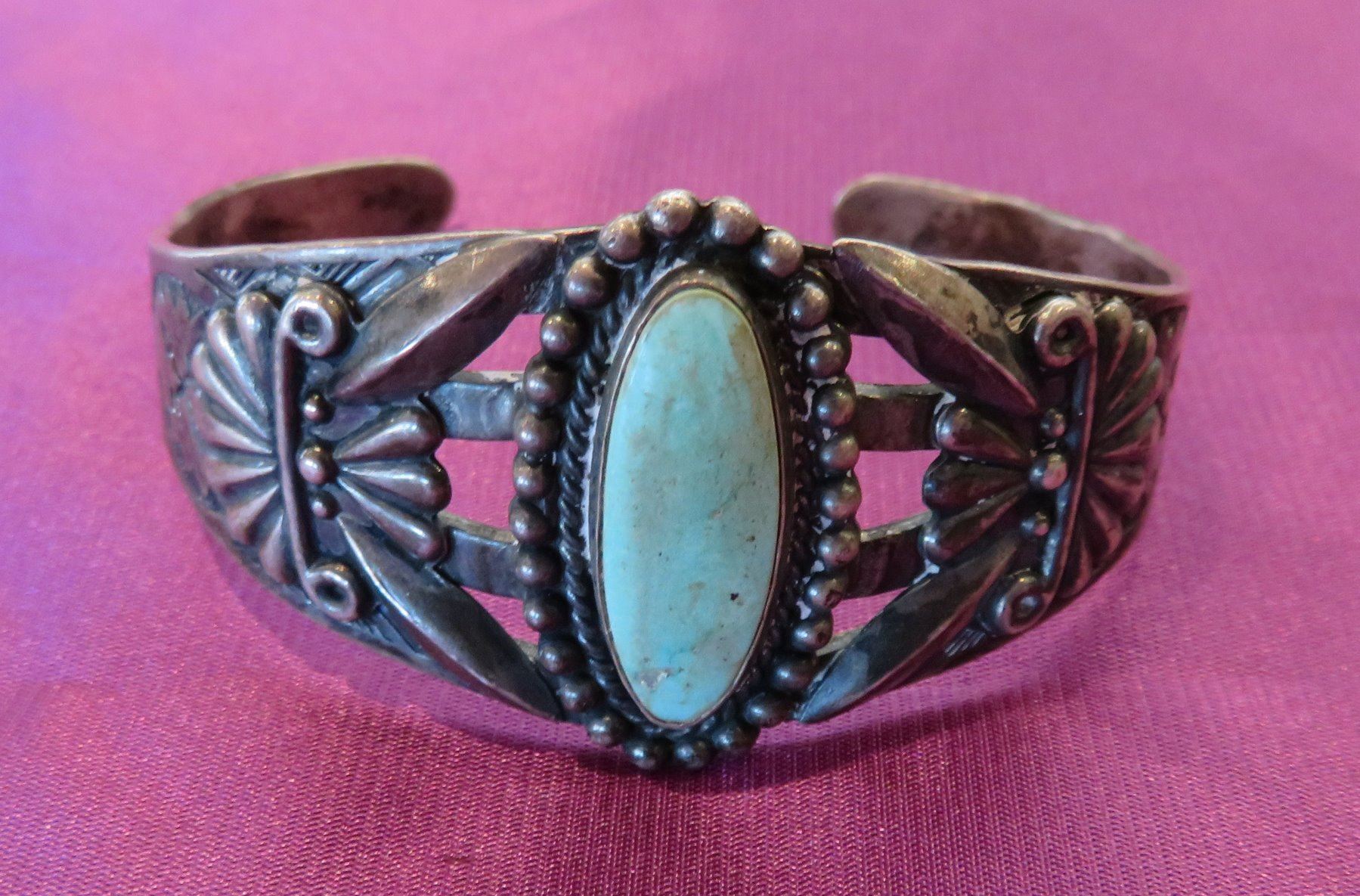 Sterling Silver & Turquoise Cuff, c. 1950s. Made of turquoise and sterling silver, the item has a 5 1/4" inside measurement, with a 1" gap and 2 1/4" x 2" x 1 1/8" overall dimensions. Item weighs approx. 31.9 grams. Southwest USA. Same pattern stamped on both ends of cuff. Condition: Worn, see images. Shipping: $12.50 w/insurance and signature.
