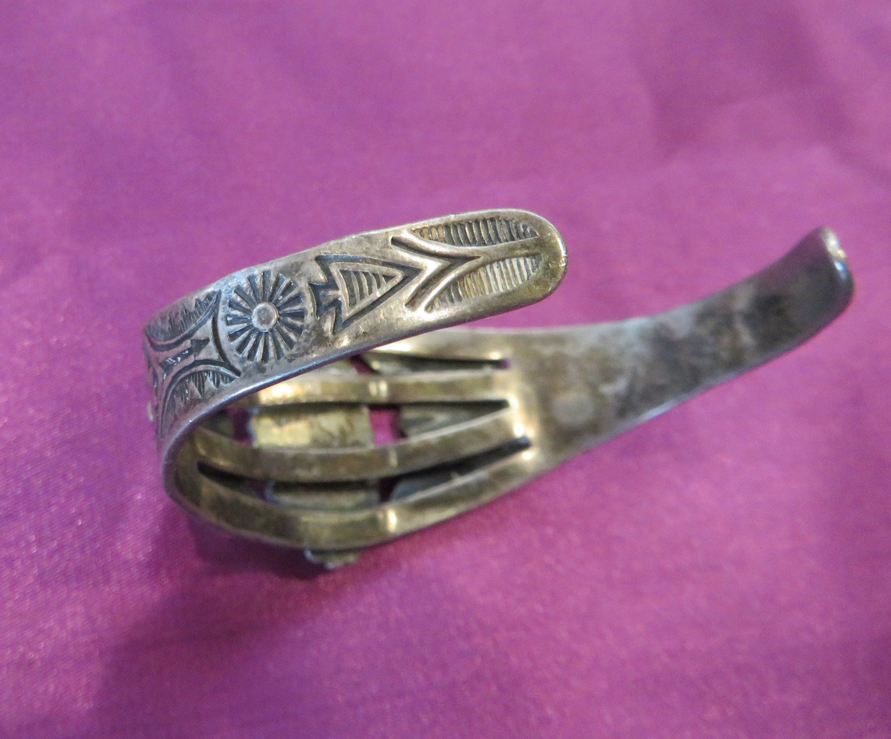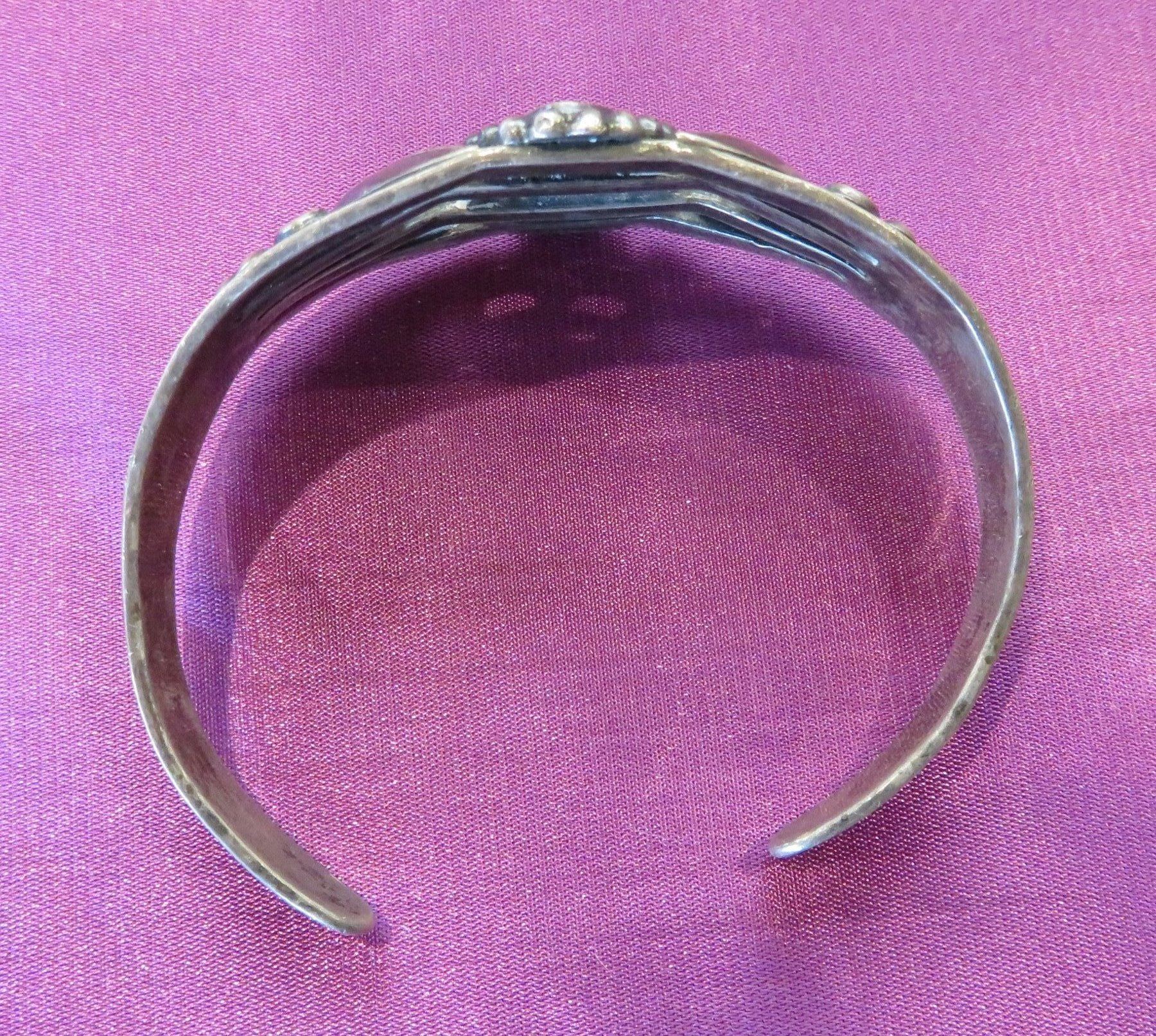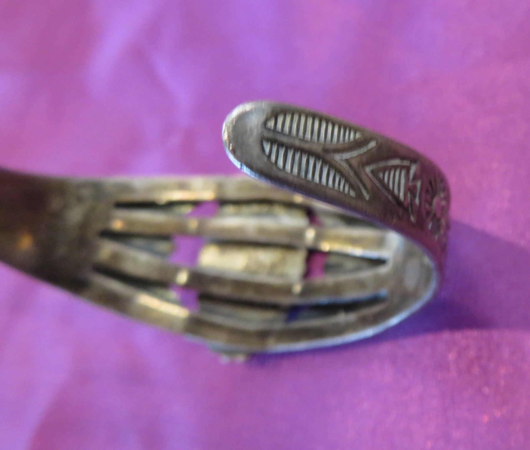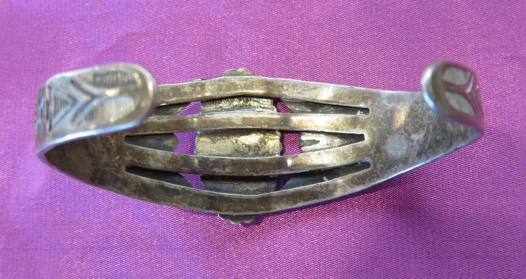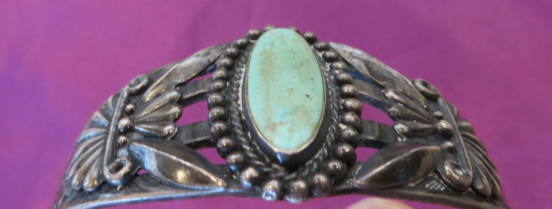 Sterling Silver & Turquoise Cuff, c. 1950s. Made of turquoise and sterling silver, the item has a 5 1/4" inside measurement, with a 1" gap and 2 1/4" x 2" x 1 1/8" overall dimensions. Item weighs approx. 31.9 grams. Southwest USA. Same pattern stamped on both ends of cuff. Condition: Worn, see images. Shipping: $12.50 w/insurance and signature.