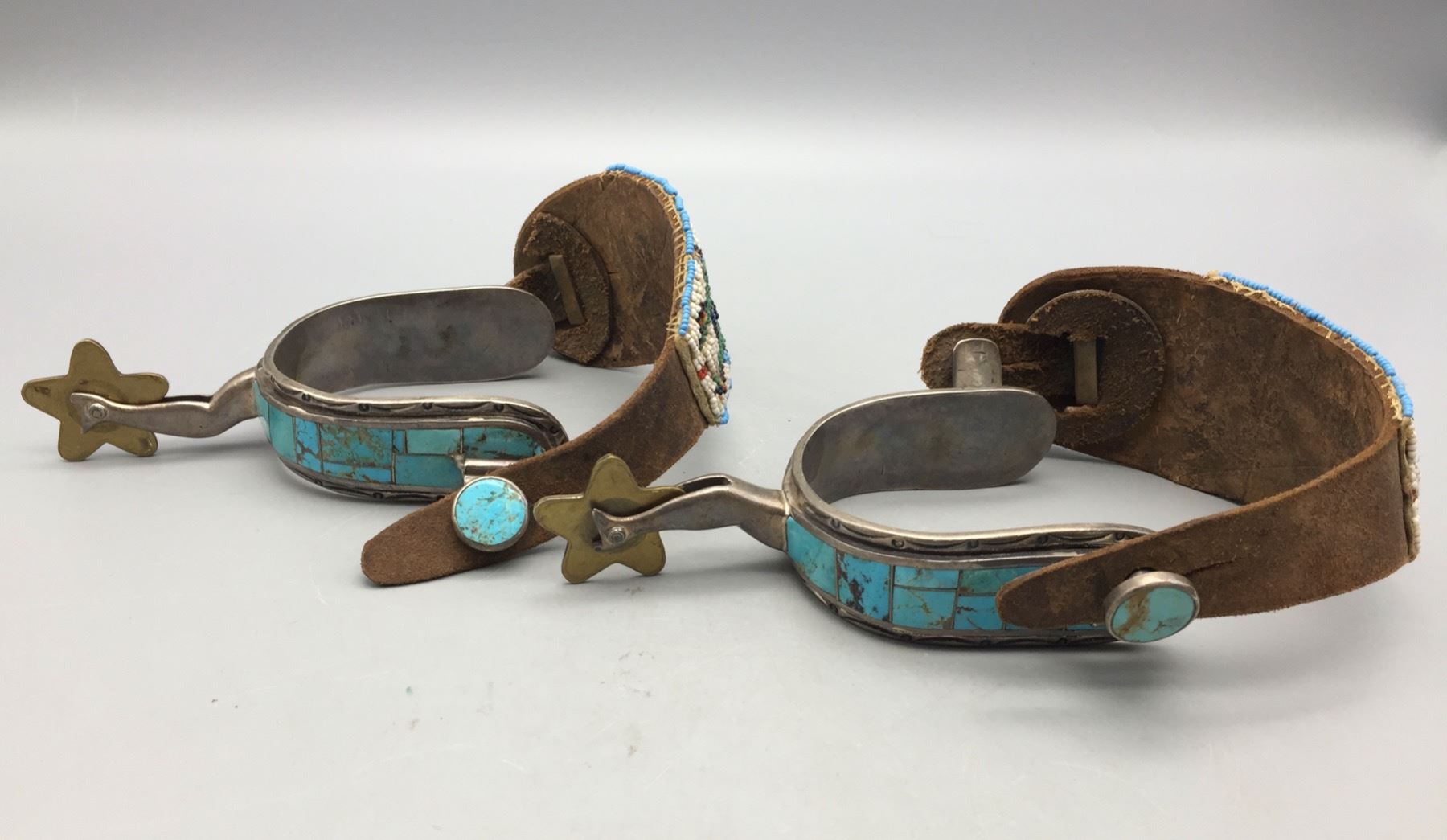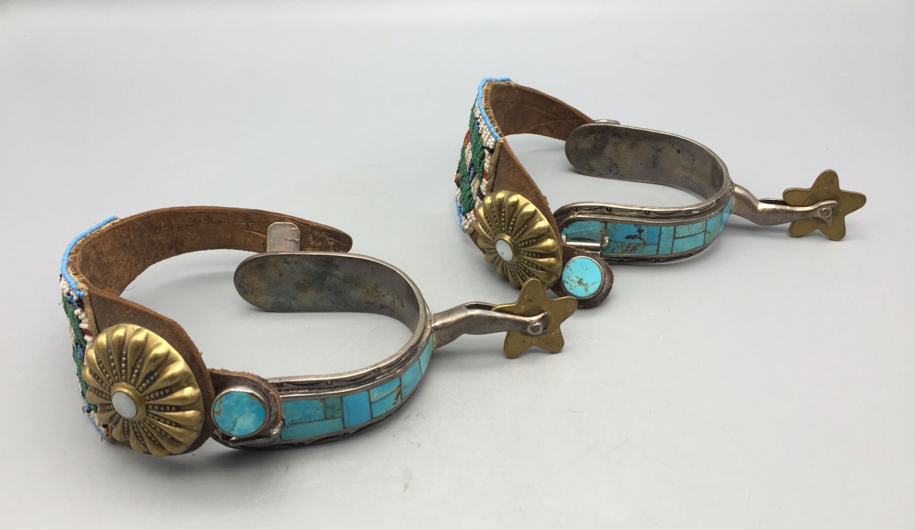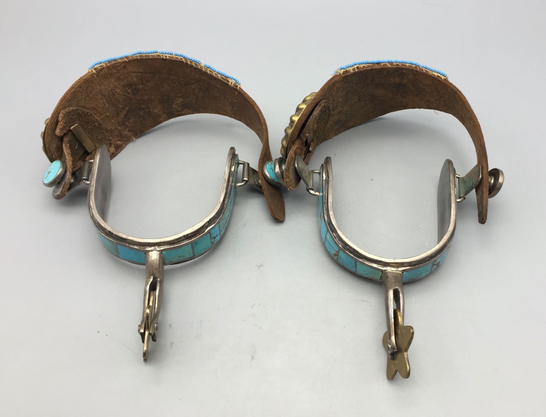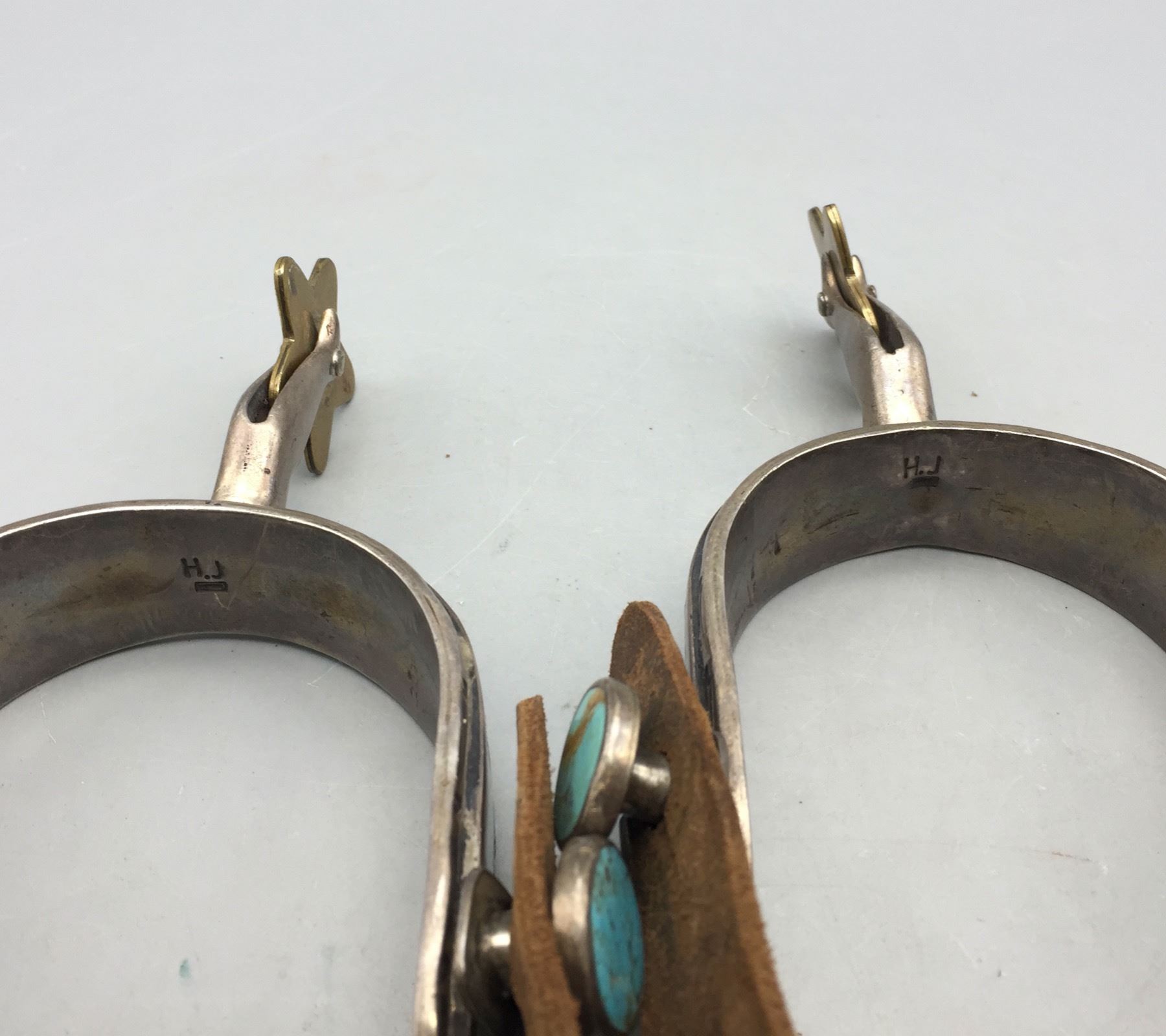 Description: For your enjoyment we offer for sale in this lot a wonderful pair of turquoise inlaid spurs. These are handmade, gal leg spurs that are hallmarked with the initials HJ and sterling inside the heel band. They come with intricately beaded vintage leather straps with large brass conchos that have a mother of pearl inset. This is a really nice pair of spurs! Look at the details! Maker: Marked HJ. Approx. Age: Vintage. Size: 2-3/4†heel, 2-1/2†shank. Condition: Good for their age, normal wear expected. Please look closely at the pictures - they are an important part of our description. Shipping: There will be a $5 handling / packaging fee for shipping this lot. The actual cost of postage will be added on top of that.
