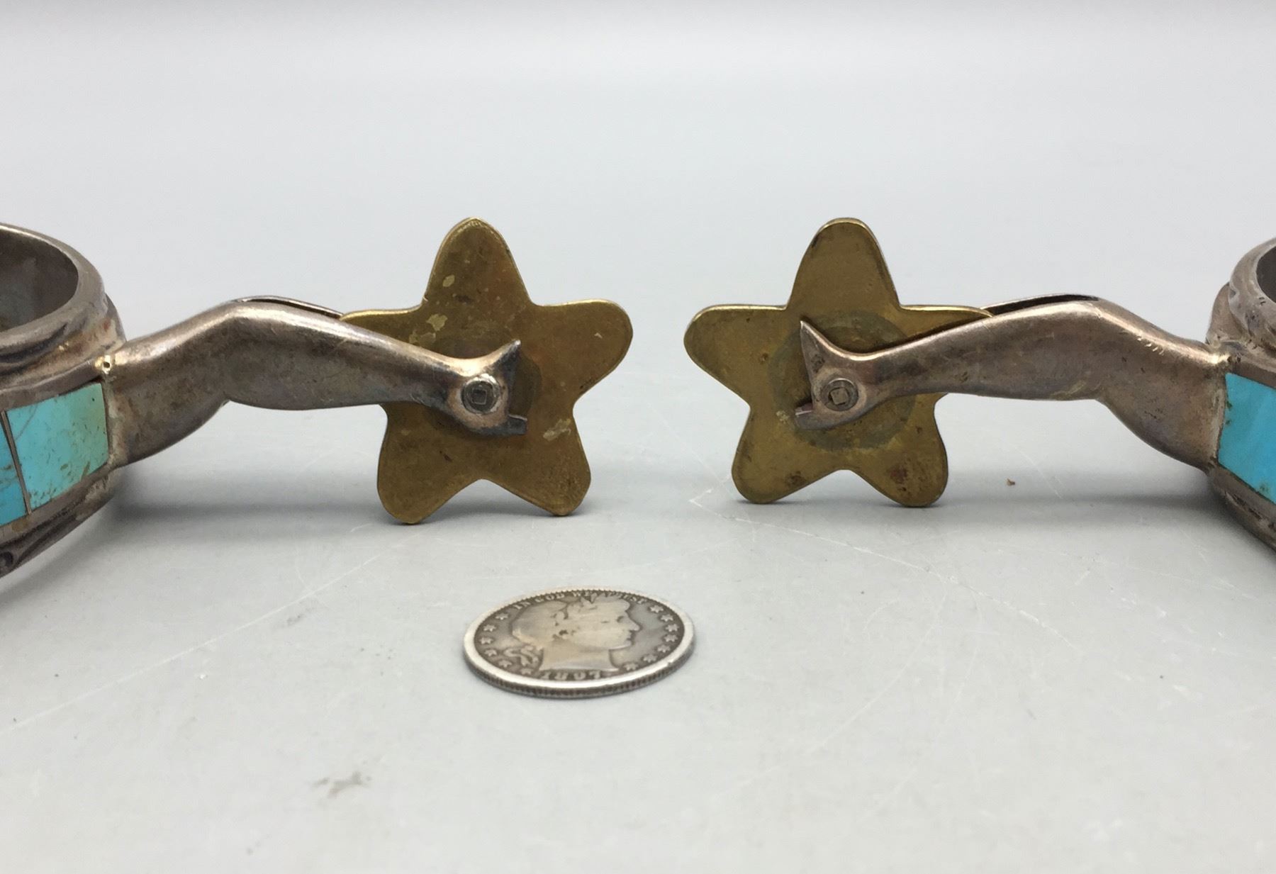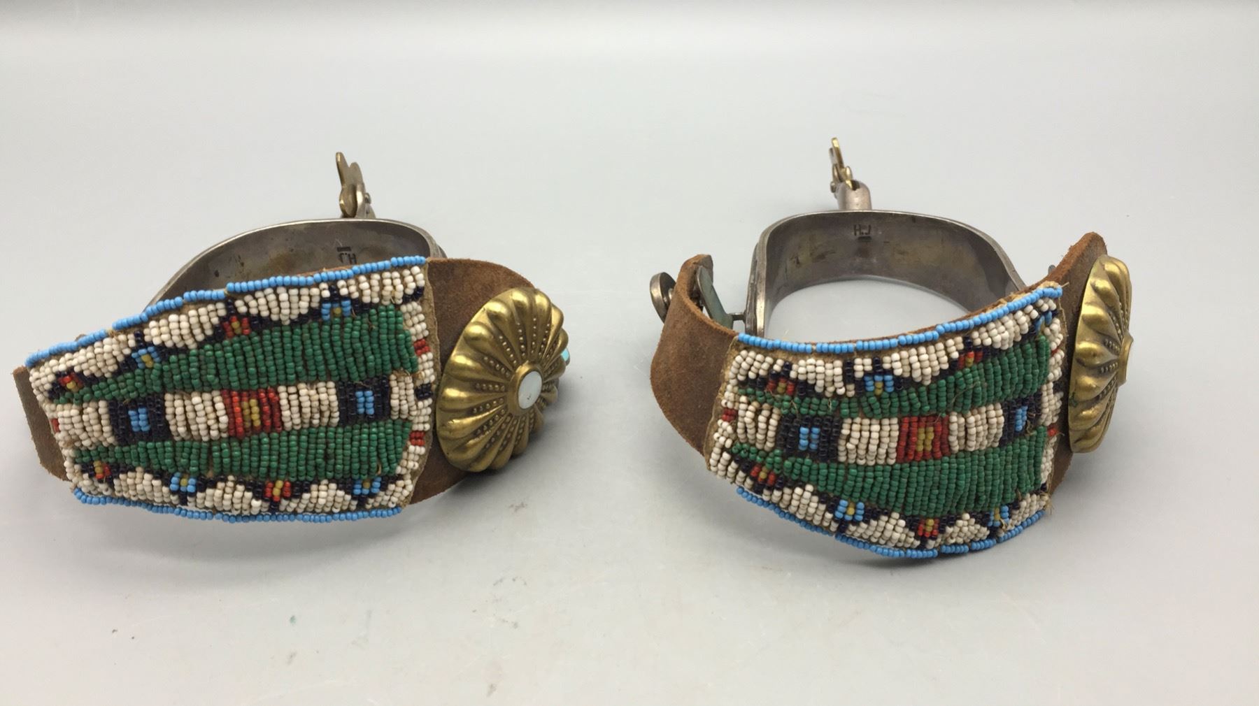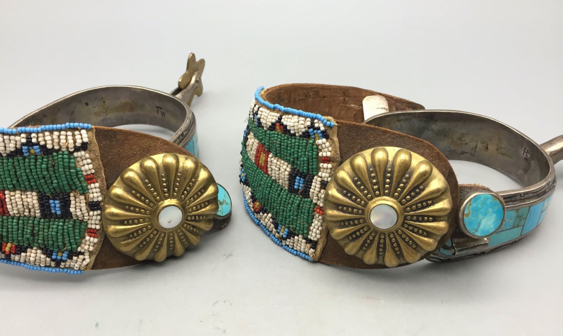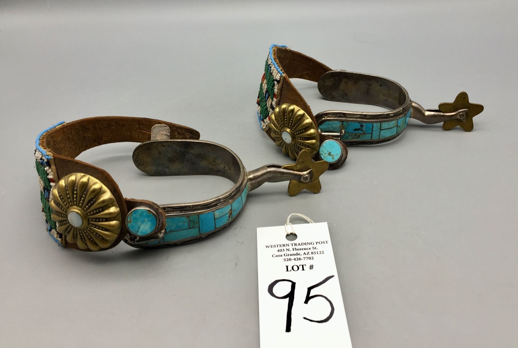 Description: For your enjoyment we offer for sale in this lot a wonderful pair of turquoise inlaid spurs. These are handmade, gal leg spurs that are hallmarked with the initials HJ and sterling inside the heel band. They come with intricately beaded vintage leather straps with large brass conchos that have a mother of pearl inset. This is a really nice pair of spurs! Look at the details! Maker: Marked HJ. Approx. Age: Vintage. Size: 2-3/4†heel, 2-1/2†shank. Condition: Good for their age, normal wear expected. Please look closely at the pictures - they are an important part of our description. Shipping: There will be a $5 handling / packaging fee for shipping this lot. The actual cost of postage will be added on top of that.