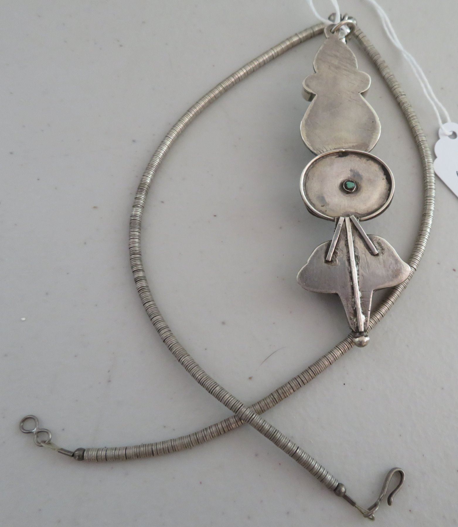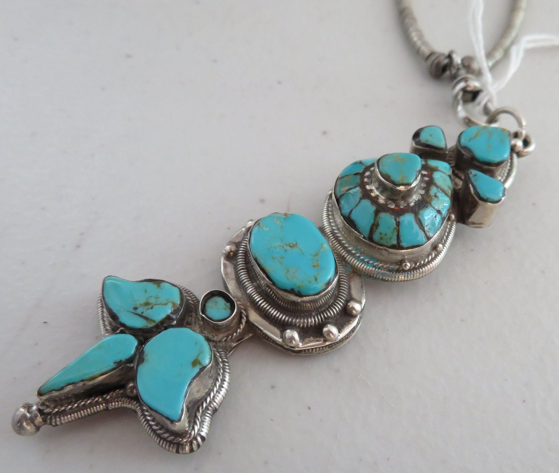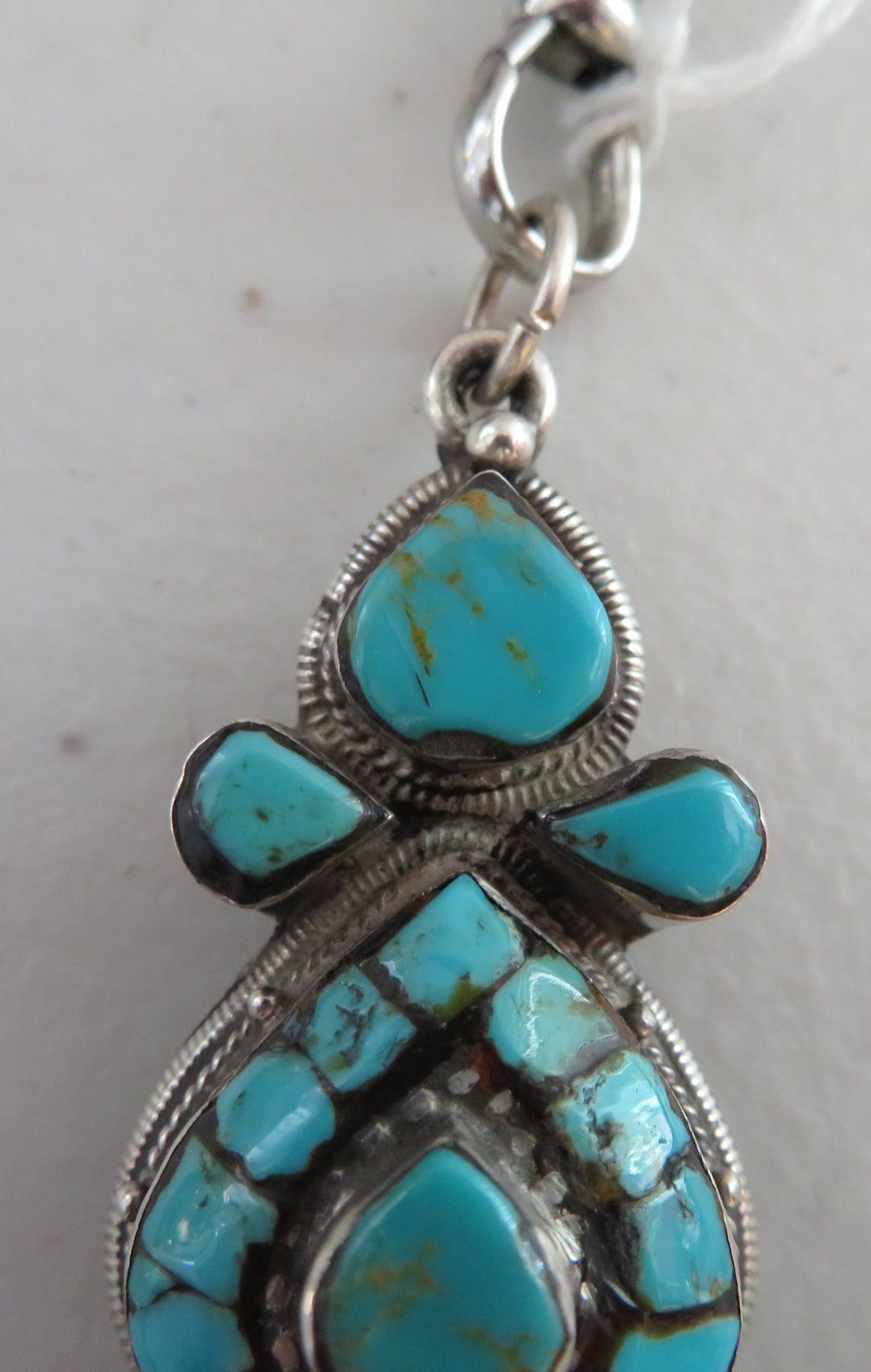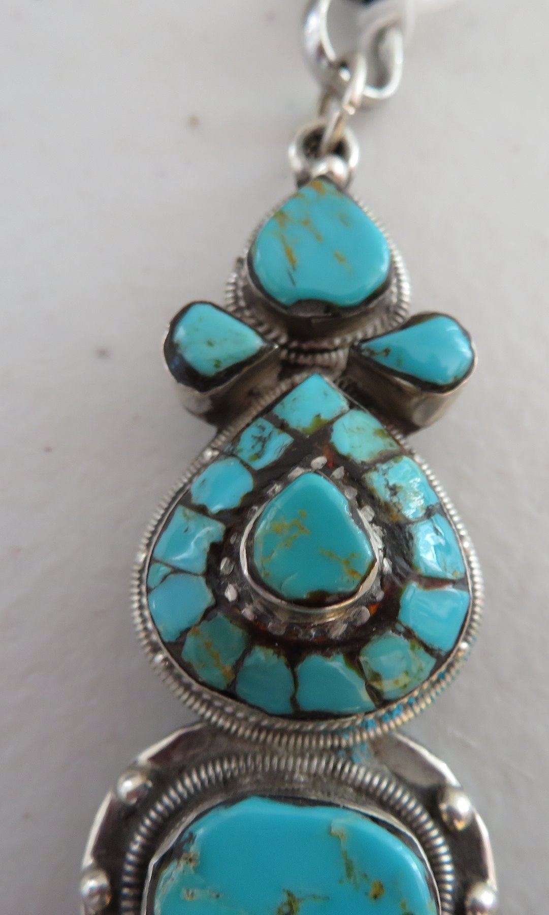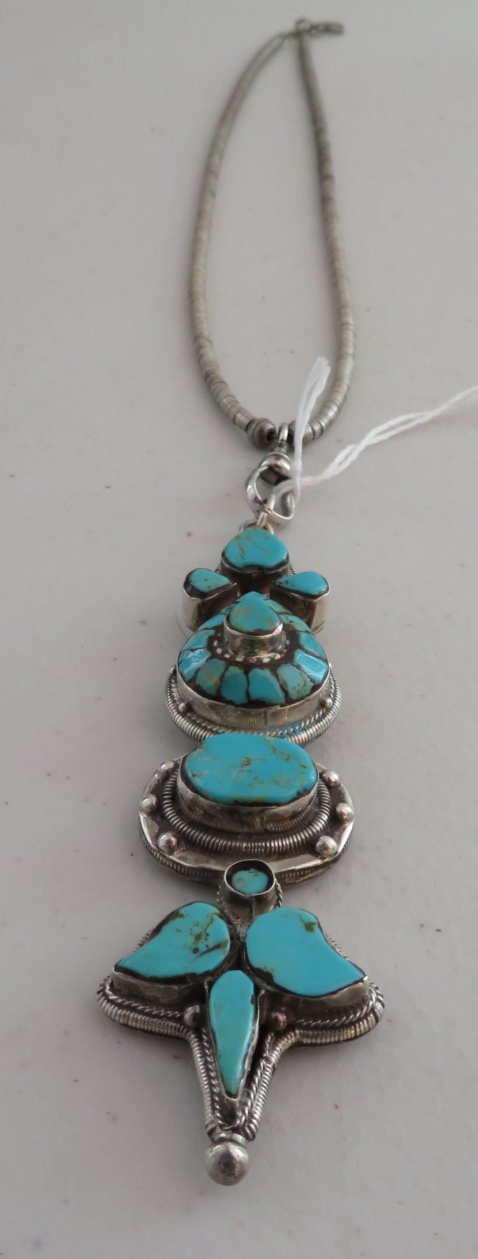 Sterling Silver & Turquoise Necklace, c. 1940s. Made of sterling silver and turquoise, the item hangs 13" w/pendant, and pendant measuring 1 1/8" 3 3/4" x 3/4". Nice inlay on pendant with silver beading. Condition: Good, patina, see images. Shipping: $15.50 w/insurance and signature.