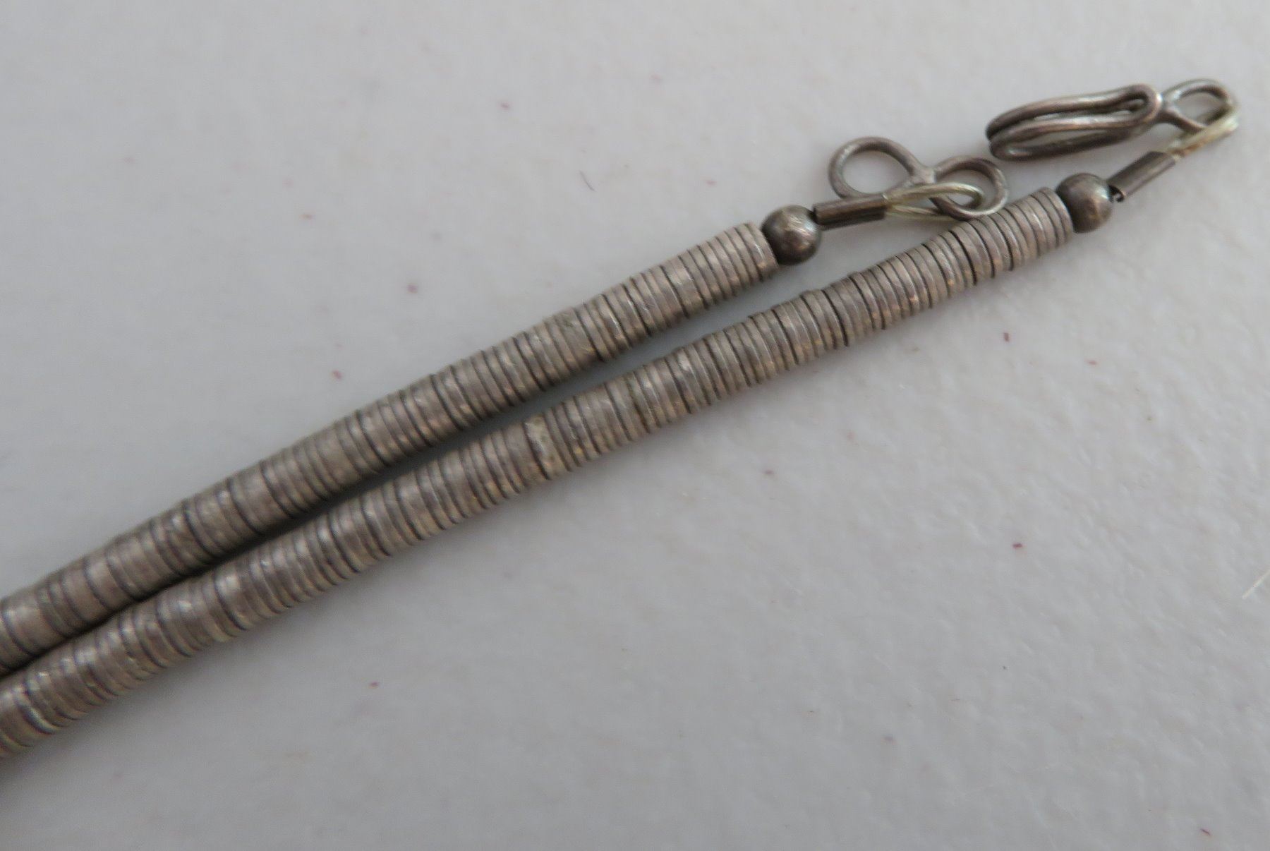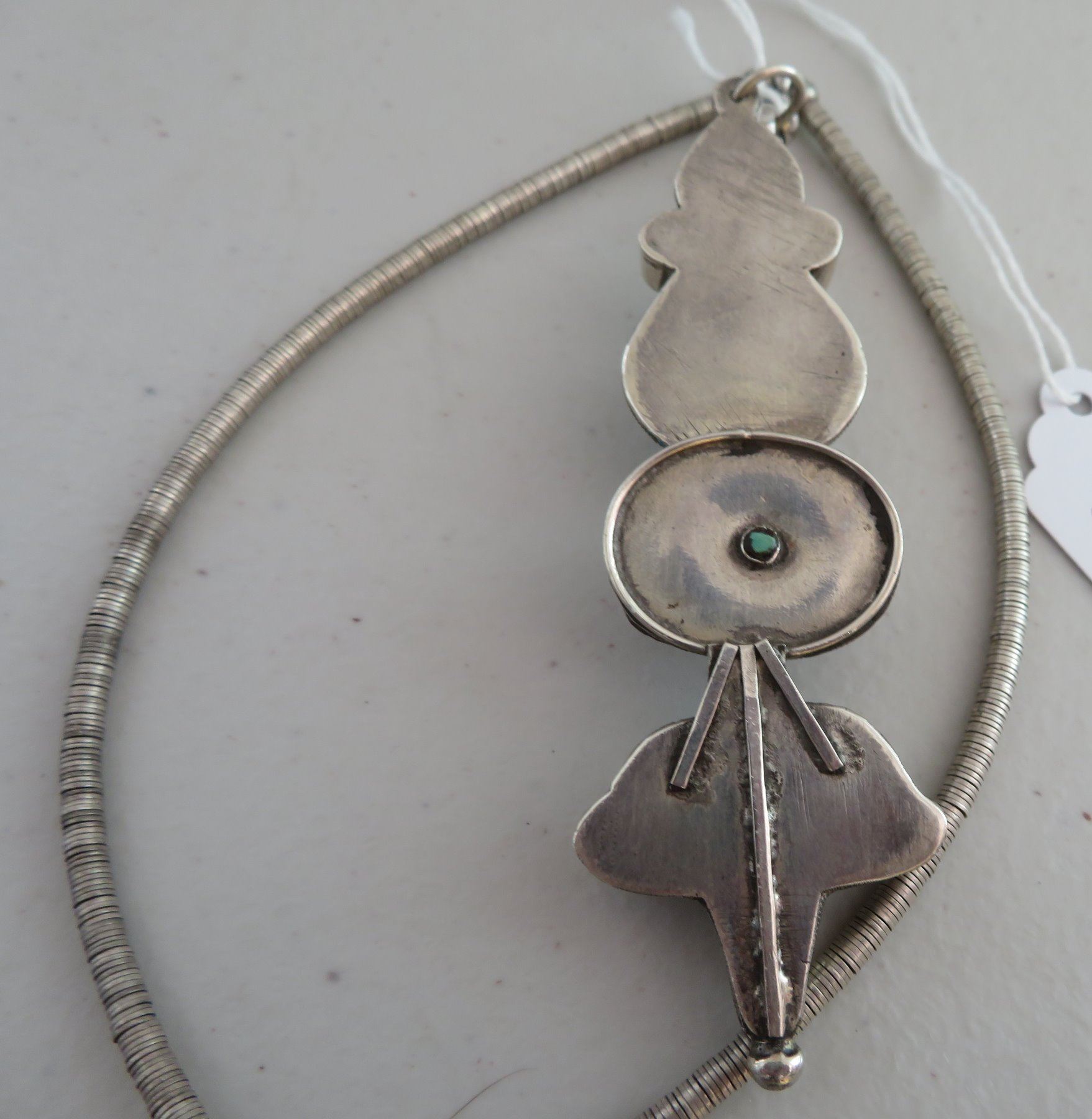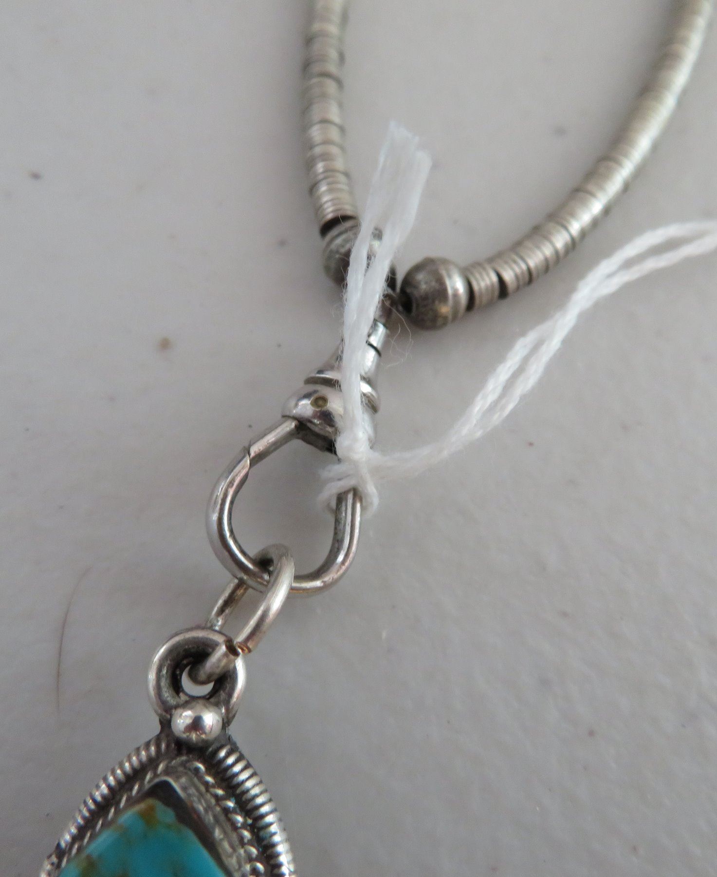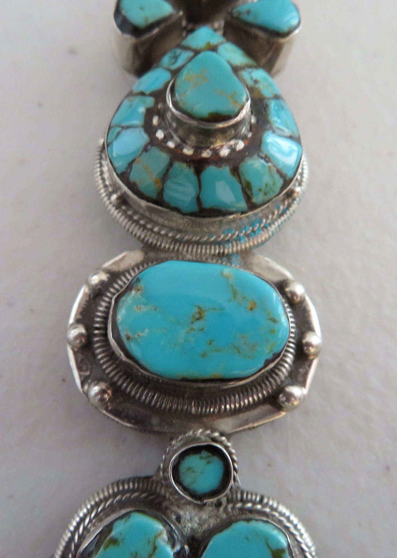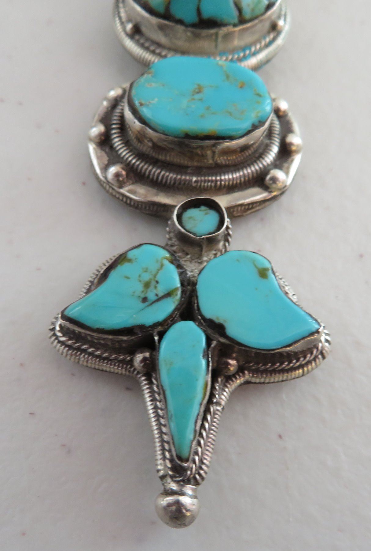 Sterling Silver & Turquoise Necklace, c. 1940s. Made of sterling silver and turquoise, the item hangs 13" w/pendant, and pendant measuring 1 1/8" 3 3/4" x 3/4". Nice inlay on pendant with silver beading. Condition: Good, patina, see images. Shipping: $15.50 w/insurance and signature.