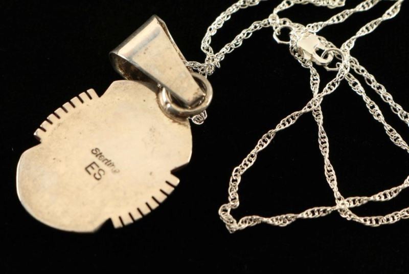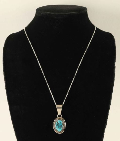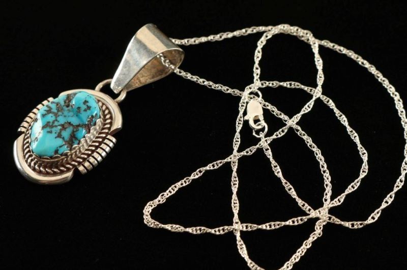 Light blue turquoise stone with a nice black matrix set in a rope and traditional design. Marked 'ES' and 'Sterling'. Comes with a silver chain.