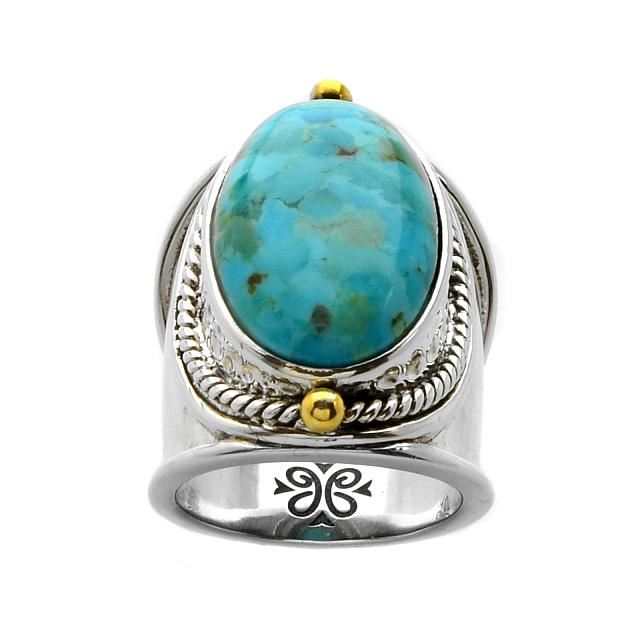 Add a bit of “formal wear” to your hand with this lovely design from the Pangea Mines . Genuine turquoise adorns a beautifully crafted oxidized sterling silver band with lustrous gold-plated accents. • Genuine turquoise • 14K Gold Pen Plated Accents