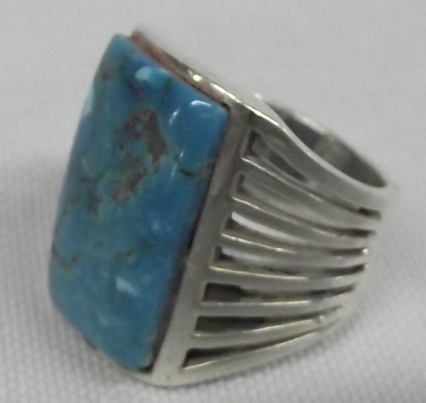 Sterling Silver Turquosie Ring. The shank of this ring has 8 rows of silver that taper into a solid band at the back. The silver holds a 3/4''x1/2'' turquoise stone. The ring is size 6.75. It is stamped on the inside with a hallmark and ''925.''